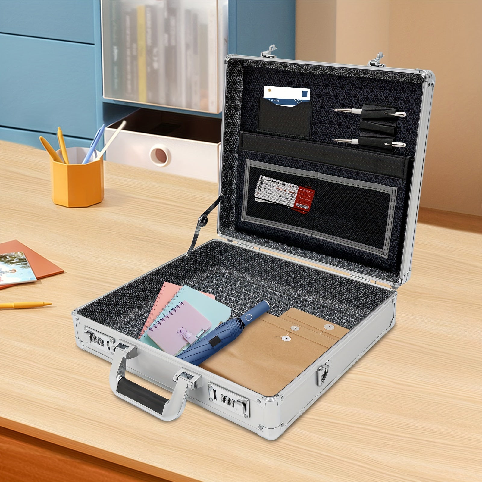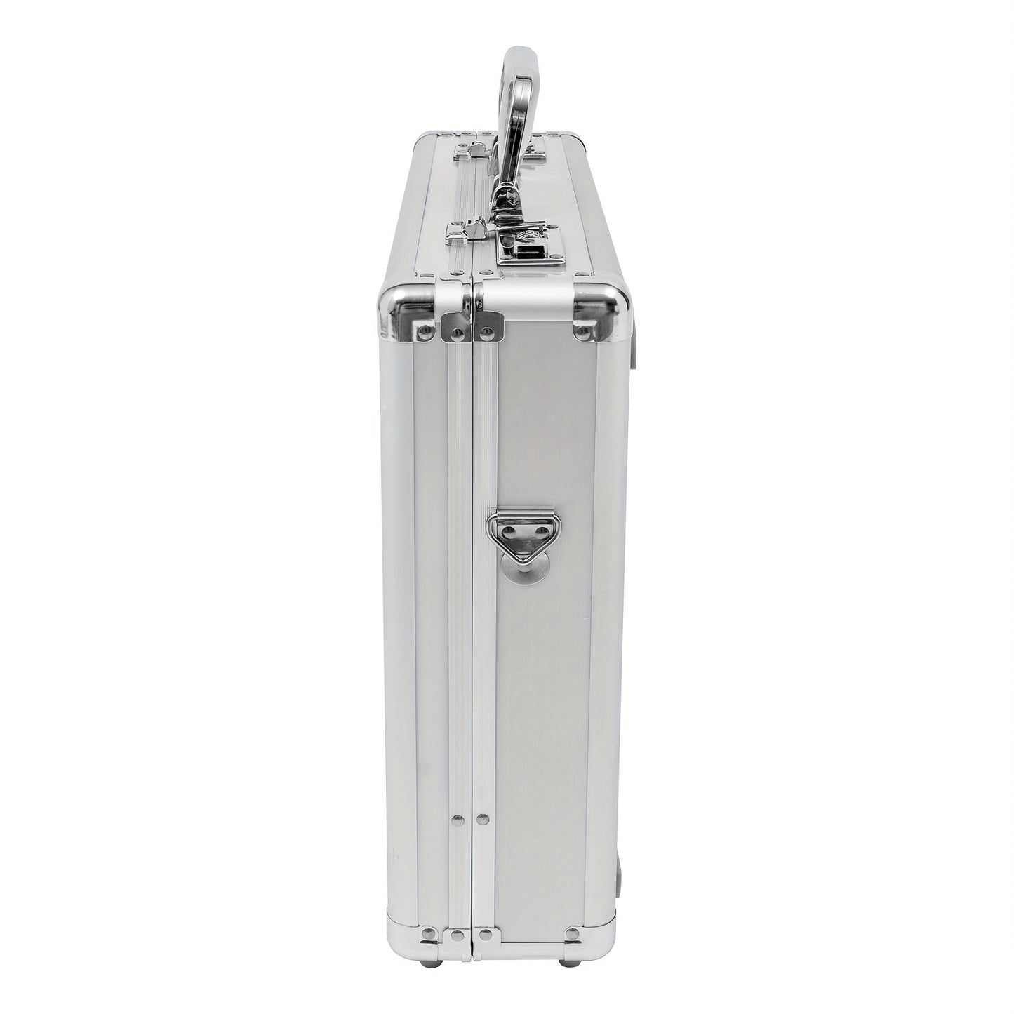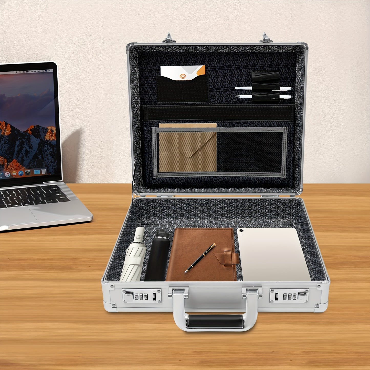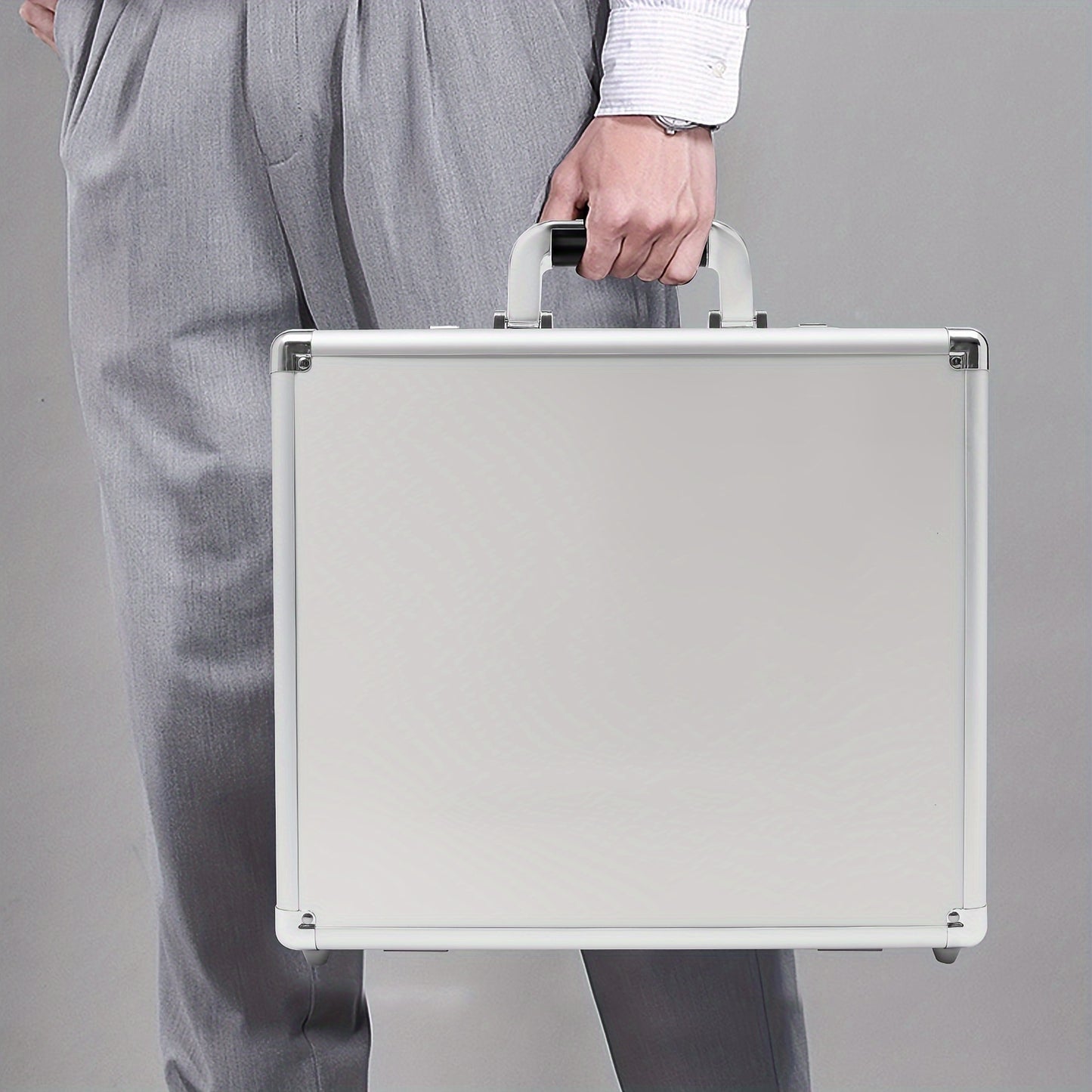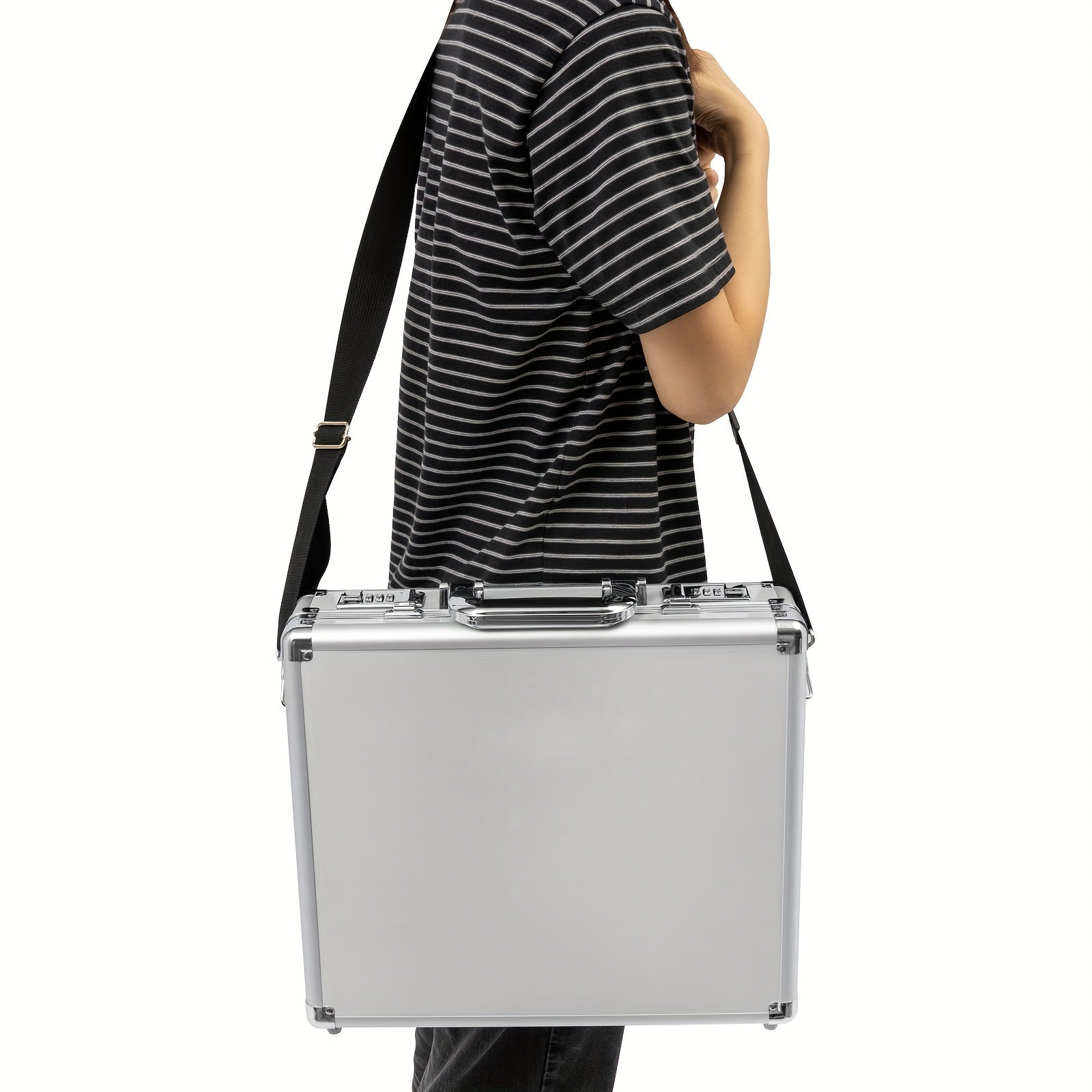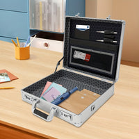 DetailsErgonomic Handle: It Is Comfortable In The Hand And Easy To Grasp.Round Corners: They Enhance Safety When You Use And Clean This Product.Cushioned Bottom Bumps: They Have Higher Elasticity And Compression Resistance, Allowing This Product To Stand Stably On The Tabletop.How To Set A Password1. The Initial Password For The Combination Lock Is 000.2. Push The Switch Outward To Unlock.3. Push The Switch Inward And Do Not Release It.4. Set Your Password At The Same Time.5. Release The Switch.6. Change The Password Successfully.ApplicationThis Product Is Ideal For Storing Business Essentials, Documents, Laptops, Cell Phones, Cameras, Precision Instruments, Tablets, Wallets, Other Small Electronics, Etc., And Is Ideal For Business Travel.SpecificationsStyle: ModernShape: RectangularColor: SilverMaterial: Aluminum Alloy, MDF, ABS, Inner FabricAssembly Required: NoLocking: Combination LockMax. Load Capacity: 5-10kg/ 11.02-22.05 LbsAccommodate Computer Size: 15.6''Gross Weight: 2.8kg/ 6.17 LbsNet Weight: 2.5kg/ 5.51 LbsProduct Size: 38*11*33cm/ 14.96*4.33*13 InPackage Size: 42*39*14cm/ 16.53*15.35*5.51 InPackage Included1* Locking Briefcase1* Strap Notes1.Please Note That This Product Does Not Include Documents, Laptops, Tablets, And Other Display Items.2.Please Note That The Combination Lock On This Product Is A Regular Combination Lock And Not A TSA.3.Please Allow The Slight Color Difference Caused By The Shooting Light And 1-3cm Error Due To Manual Measurement, And Make Sure You Do Not Mind Before You Order.