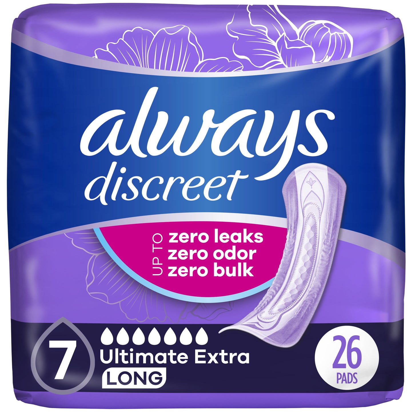 Always Discreet Adult Incontinence Pads for Women, Ultimate Extra Absorbency, Long Length, Postpartum Pads, 26 CT