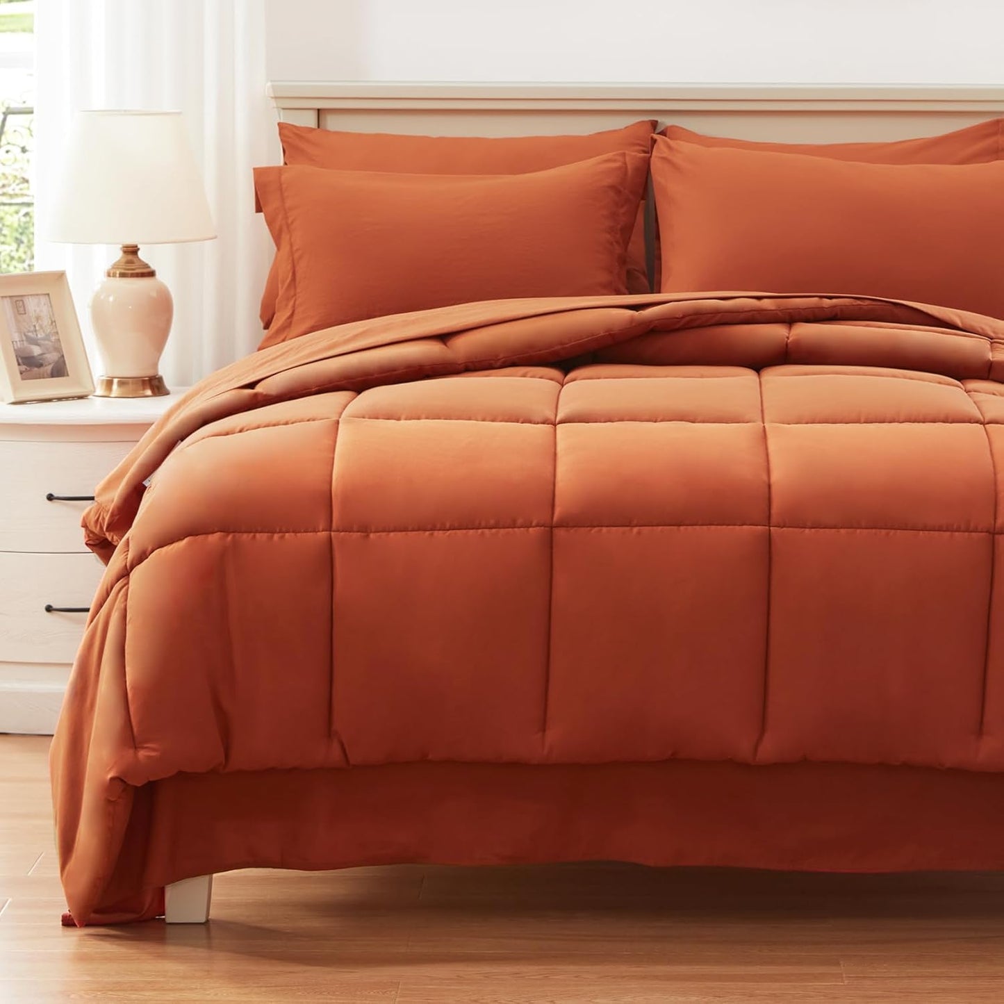 【All season use】:The queen size comforter sets is extra cozy and soft with excellent 270 gsm down alternative filling, which never bunched up after washes. It is lightweight that will not make you sweat on hot night, and also warm enough on chilly night, So you will exactly melt in this bedding queen size for all season.