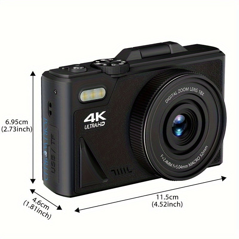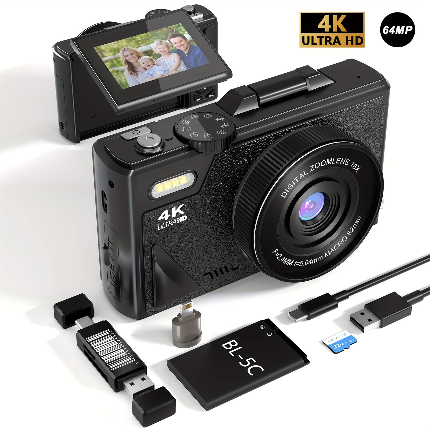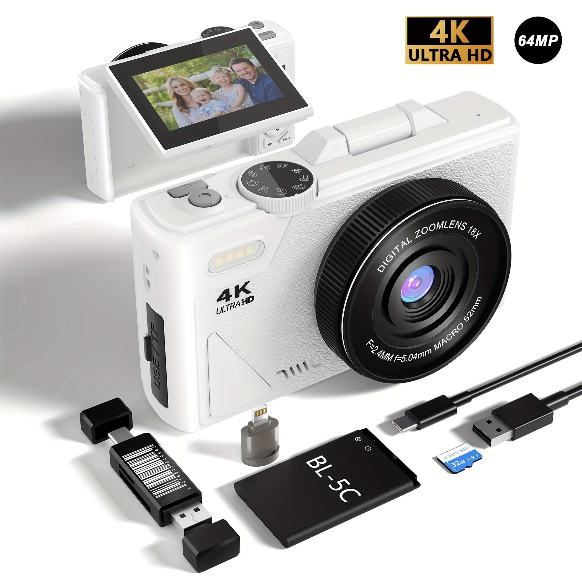 Appareil photo numérique HD 4K 64MP avec zoom numérique 18X, écran inclinable de 3 pouces. Appareil photo professionnel pour prendre des photos, enregistrer des vidéos, vloguer et utiliser comme webcam. Livré avec une carte TF de 32 Go. Idéal pour les déb