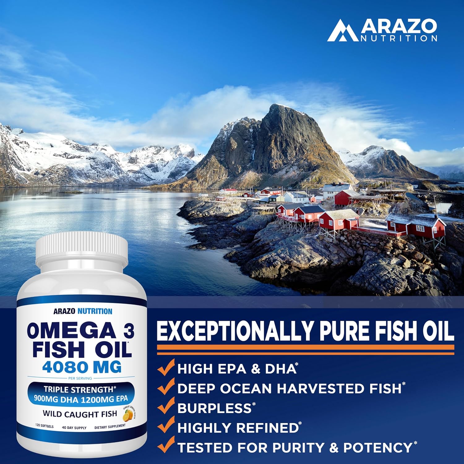 Arazo Nutrition Wild Caught Omega 3 Fish Oil – 120 Soft Gels – 4,080mg High EPA 1200mg DHA 900mg Lemon Flavor Burpless Softgels