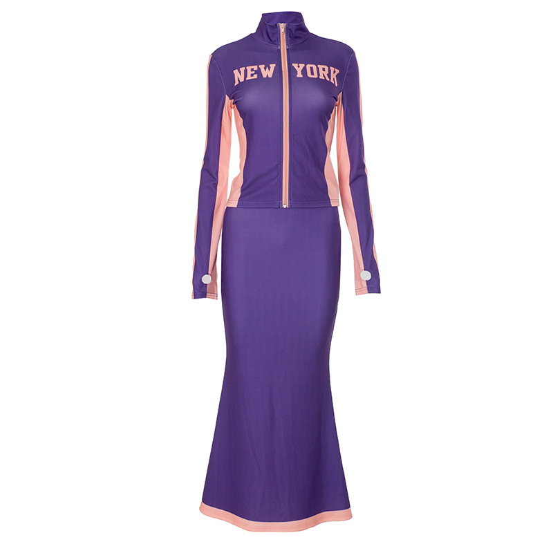 Autumn Contrast Color Long Sleeves Slim Fit Sexy Long Sleeve Two Piece Skirt Sets