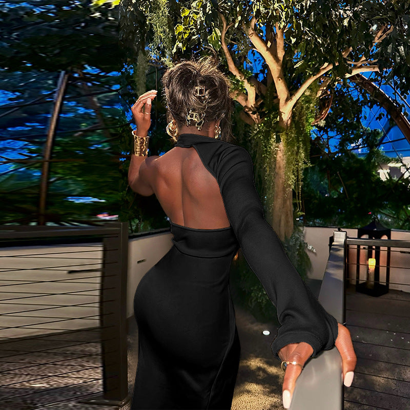 Autumn Elegant Sexy Design Hollow Out Cutout out Single Sleeve Split Dress Women
