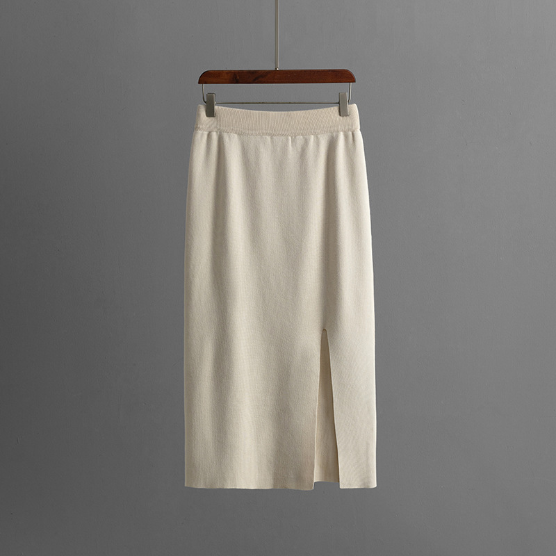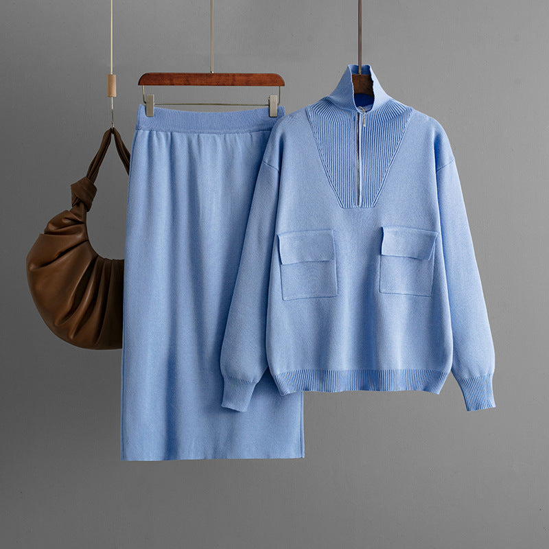 Autumn Winter Solid Color Polo Collar Half Zipper Knitted Top Wrapped Skirt Two Piece Set