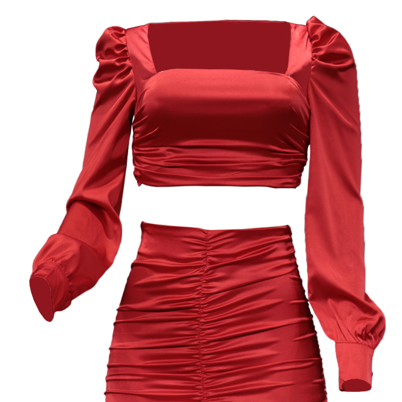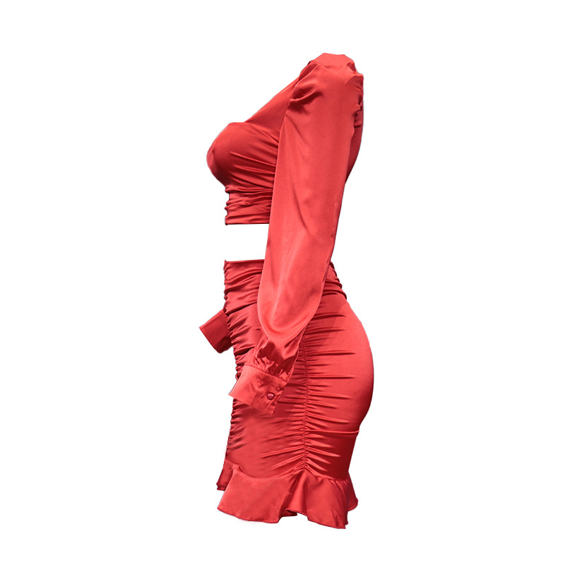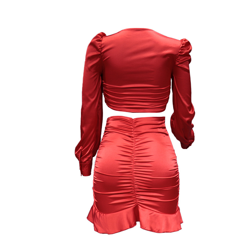 Autumn Winter Women Clothing Sexy Top Pleated Flounced Skirt High Waist Short Skirt Two Piece Set