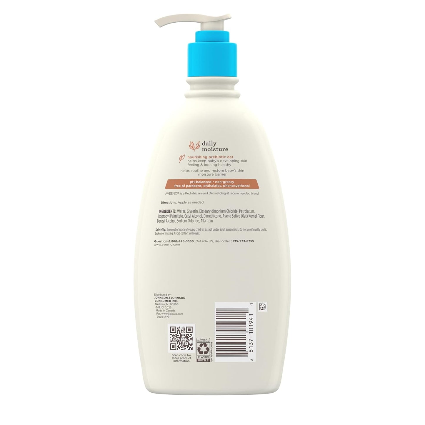 18-fluid ounces of Aveeno Baby Daily Moisture Body Lotion with natural colloidal oatmeal, dimethicone and rich emollients features a naturally nourishing formula that moisturizes for a full 24 hours