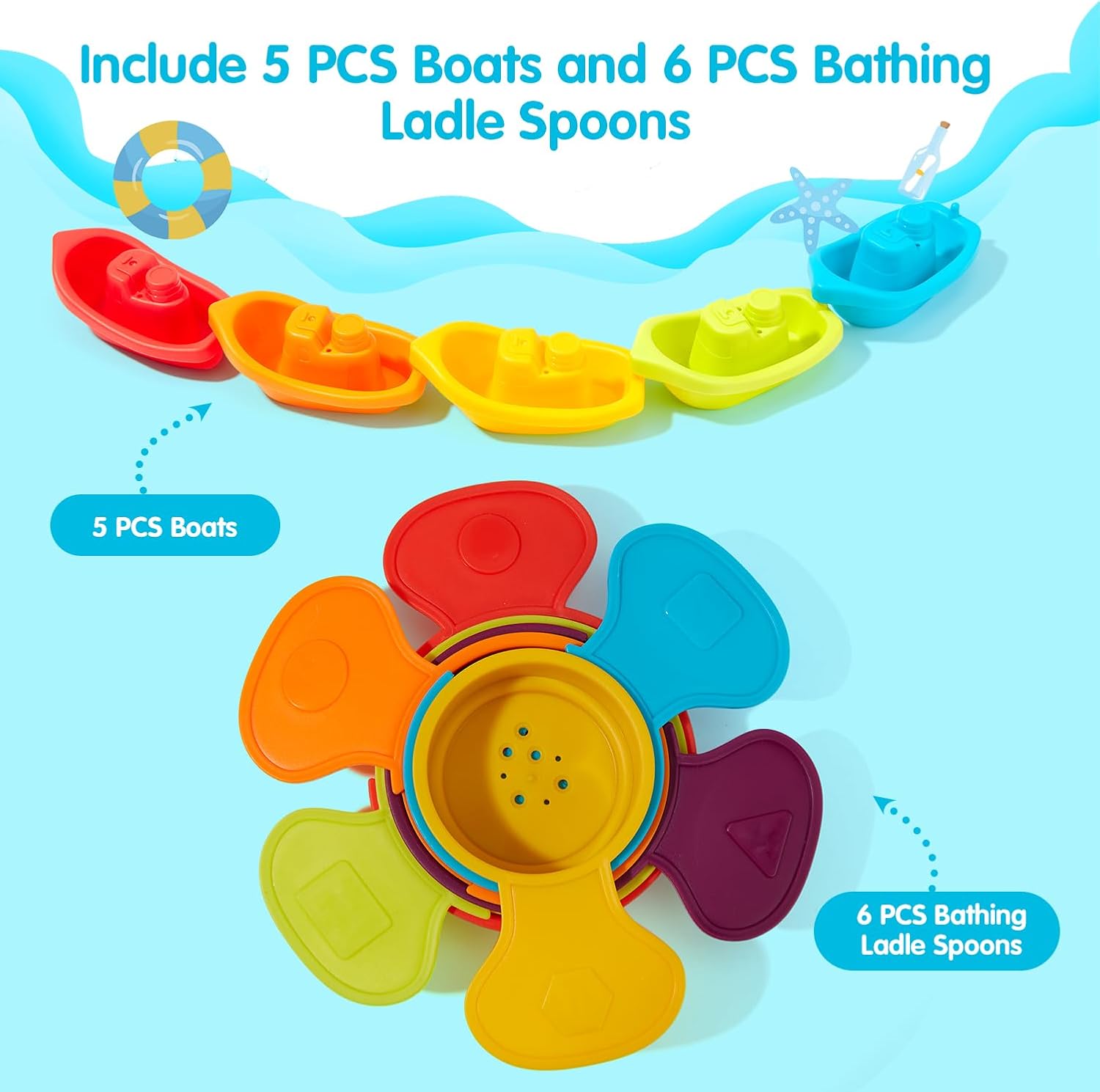 - Baby Bath Toy Set: product inlcude 5 PCS plastic boats and 6 PCS Plastic Bathing Ladle Spoons.Kids will like bathing with them.Children can also use them to play with sand on the beach.