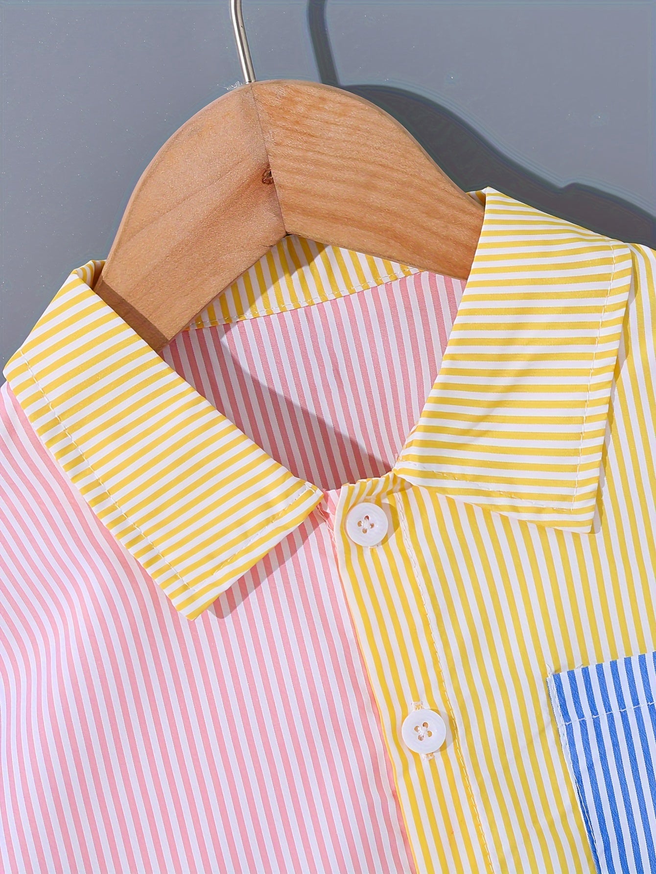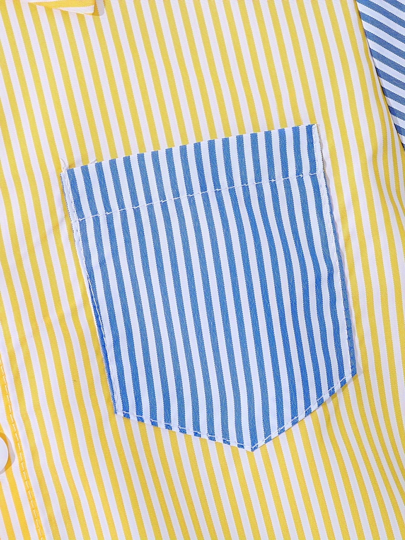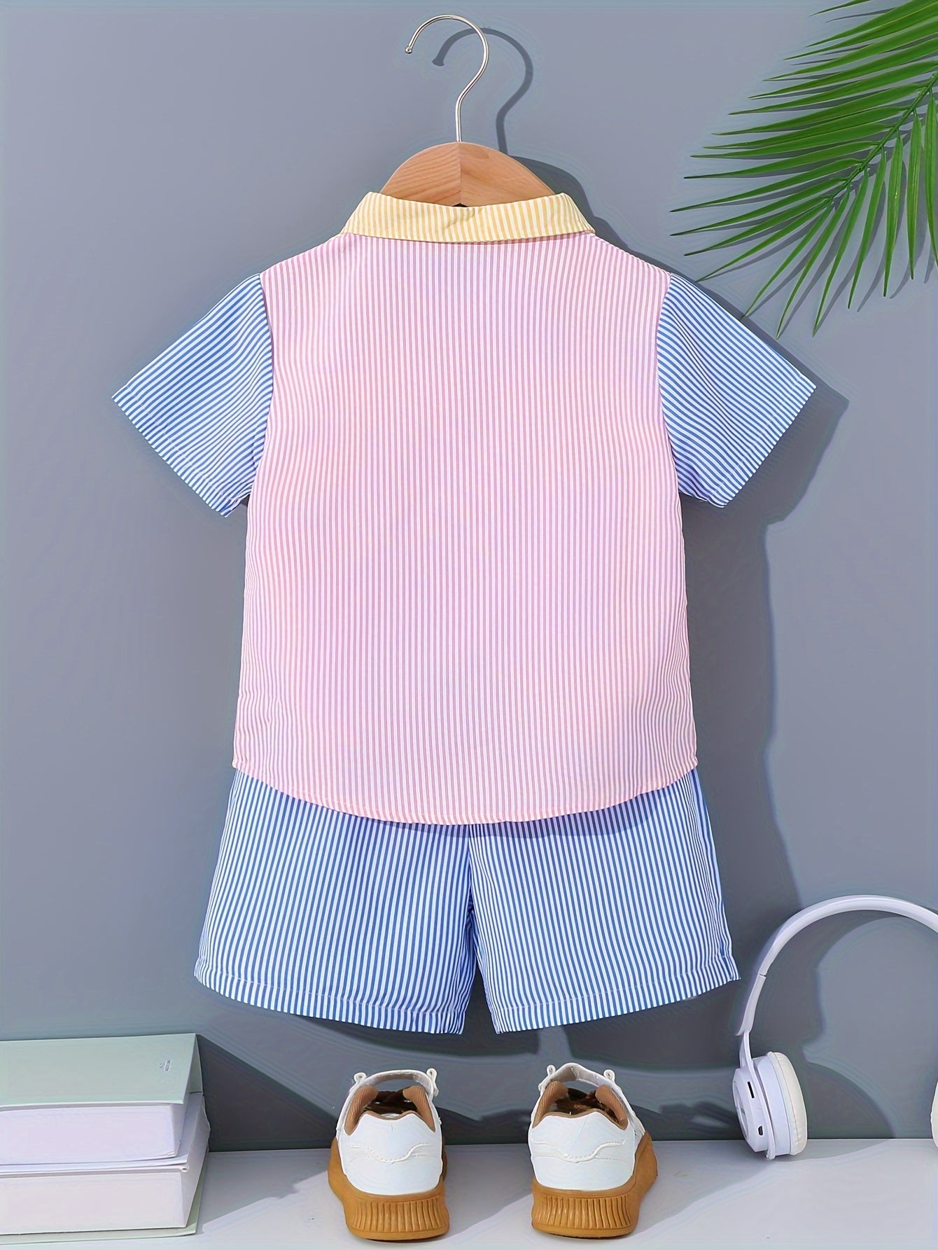 Baby Boys Casual Color Block Striped Outfit, Short Sleeve Breathable Shirt & Shorts Set, 2Pcs Summer Daily Wear