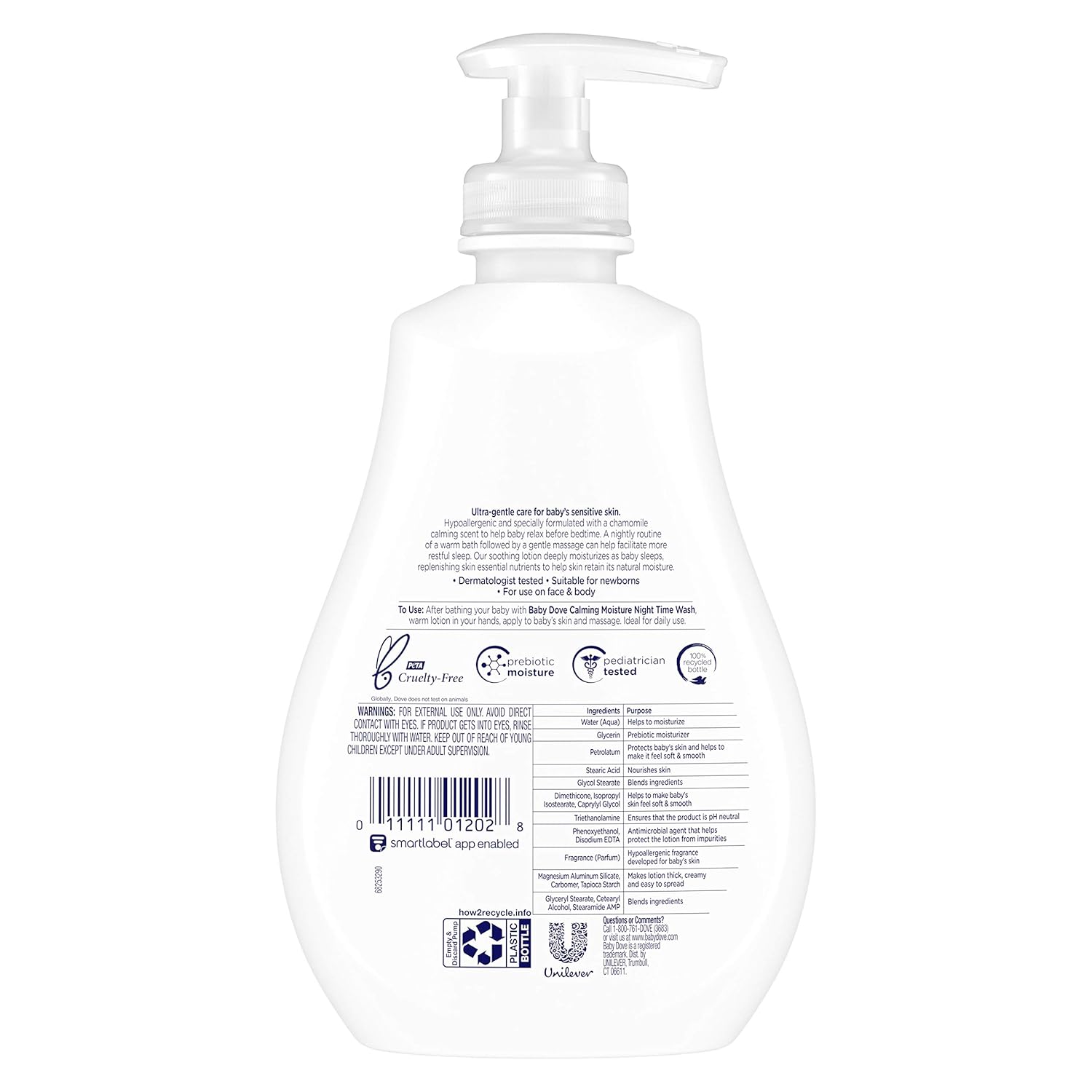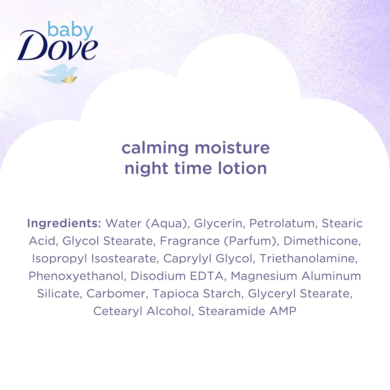 Baby Dove Calming Moisture Baby Lotion is a soothing night-time baby lotion that gently moisturizes baby’s skin overnight. Pediatrician and dermatologist tested—this hypoallergenic baby lotion has a calming scent of warm milk and chamomile, making it the perfect addition to your baby’s bedtime routine.