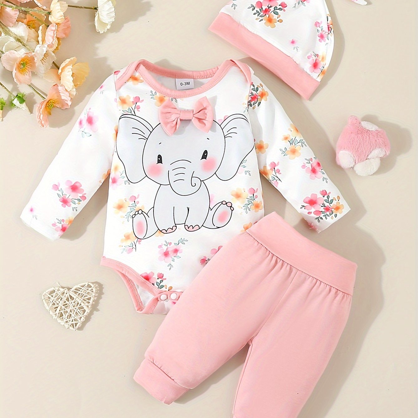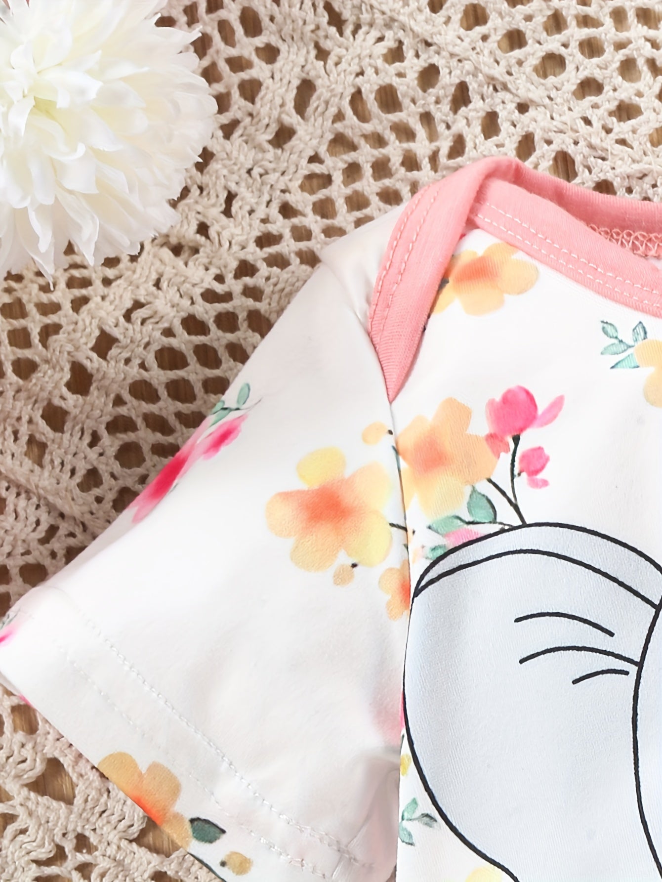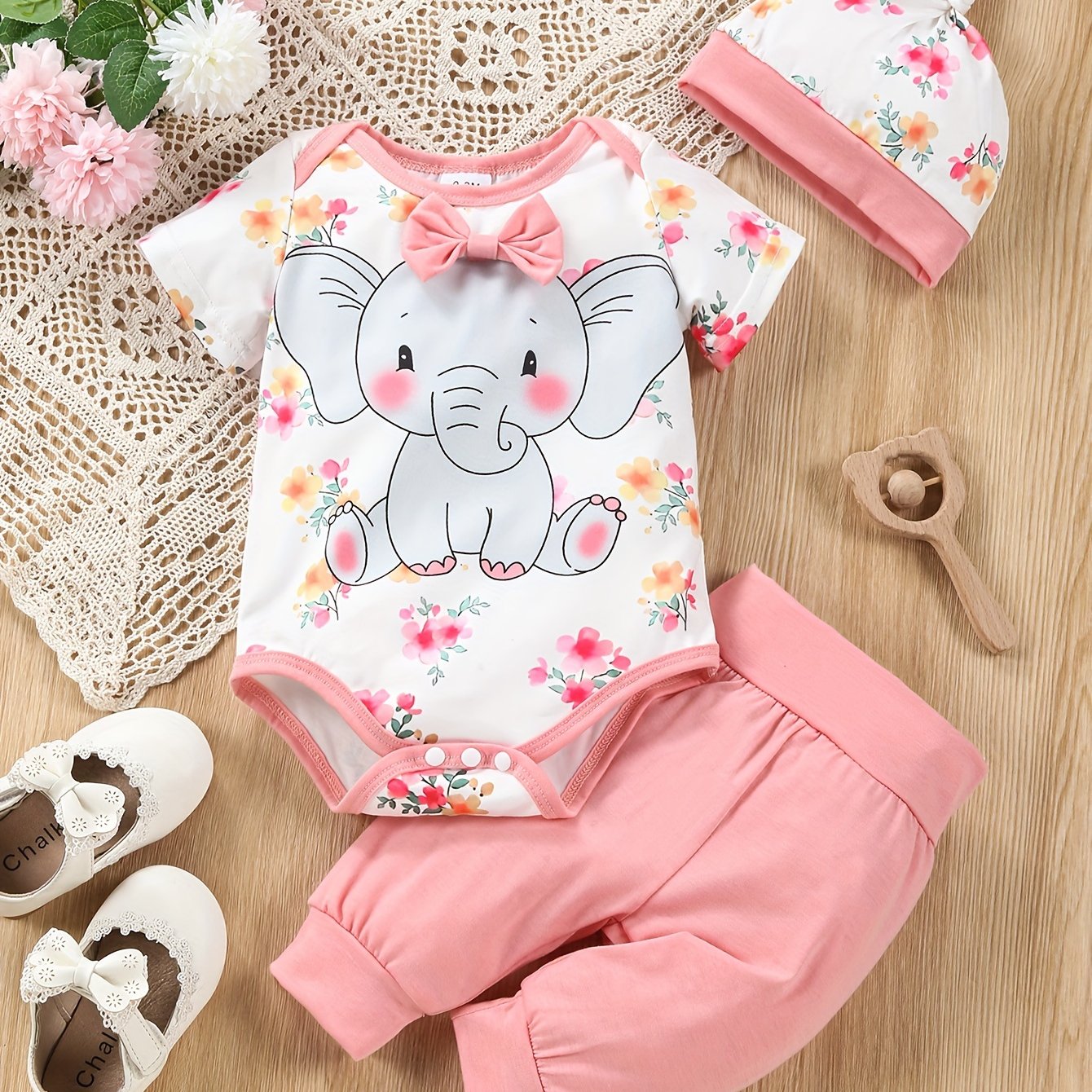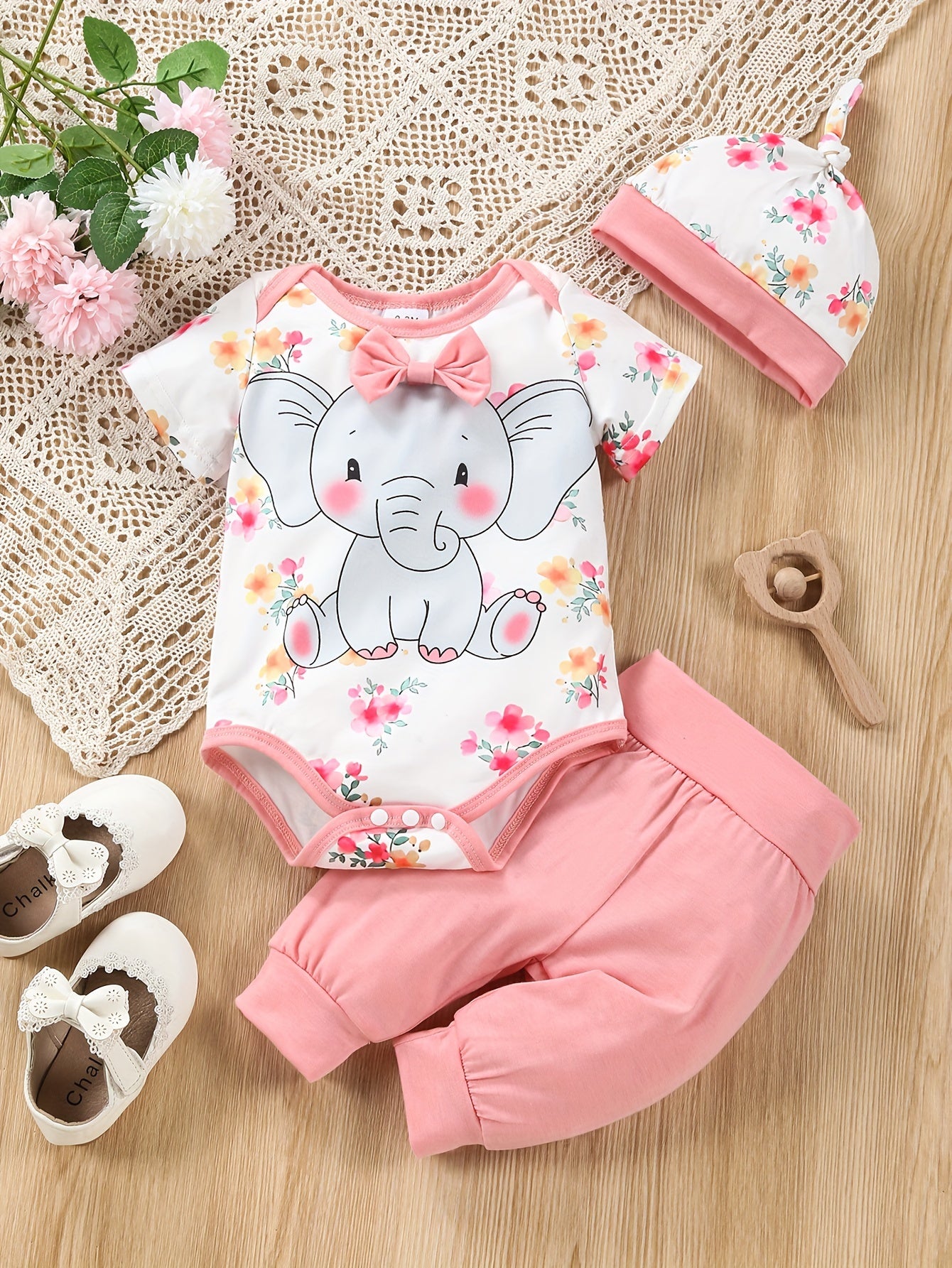 Baby Girl's Cute Elephant Print Short Sleeve Triangle Romper with Pink Pants and Hat Three-Piece Set, Perfect for Outdoor