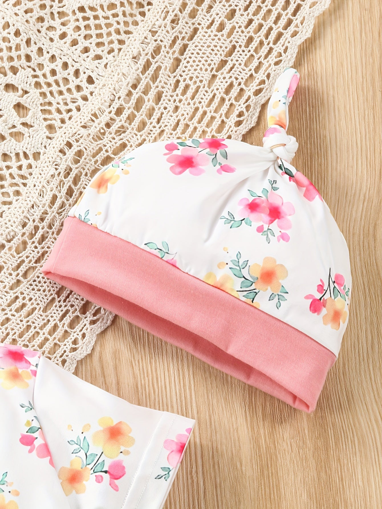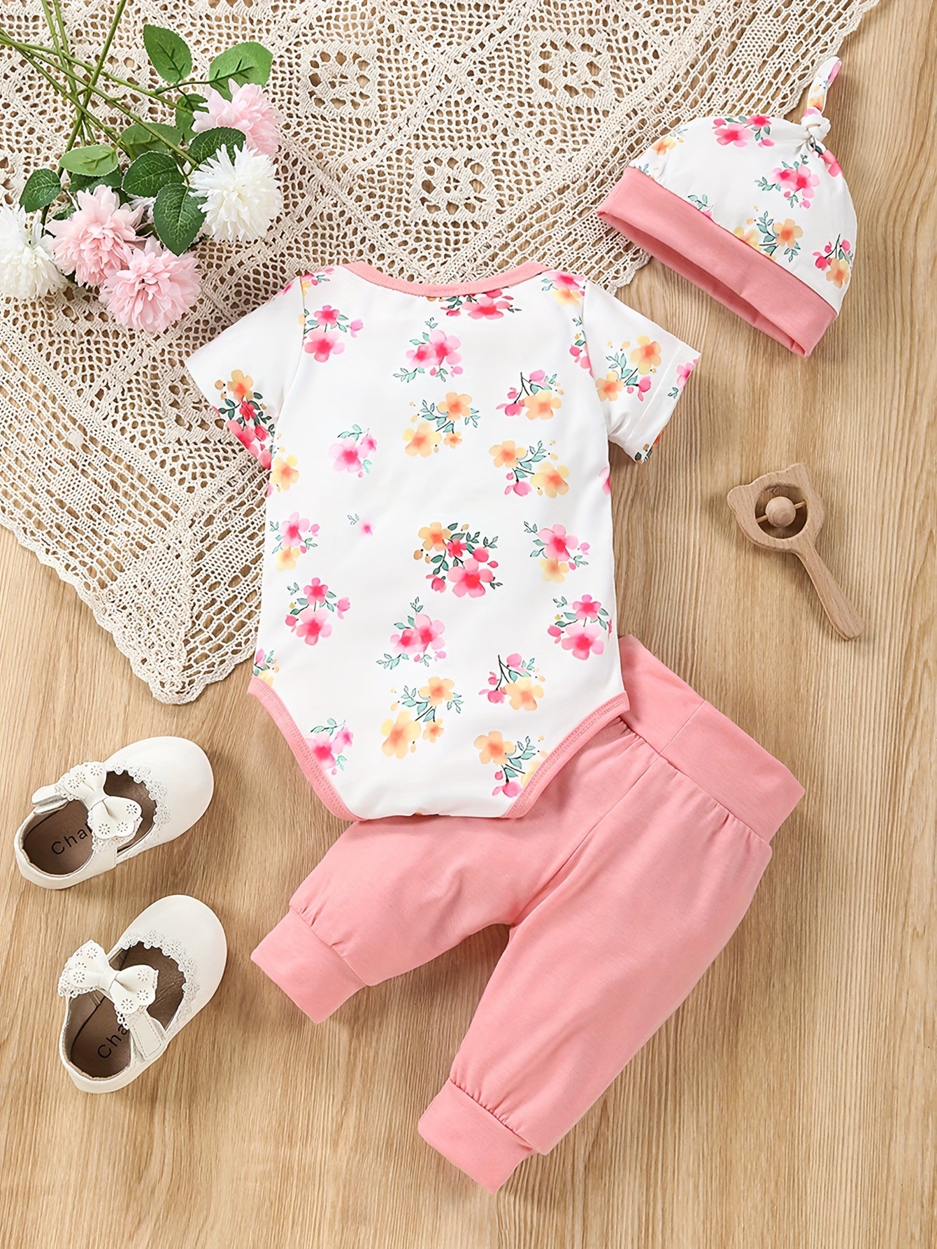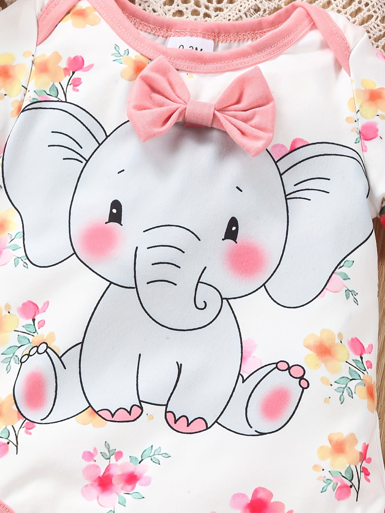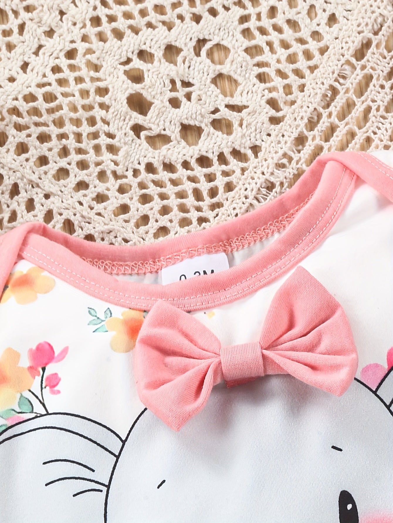 Baby Girl's Cute Elephant Print Short Sleeve Triangle Romper with Pink Pants and Hat Three-Piece Set, Perfect for Outdoor