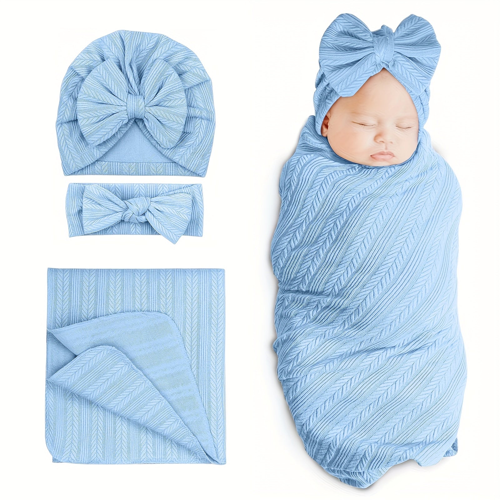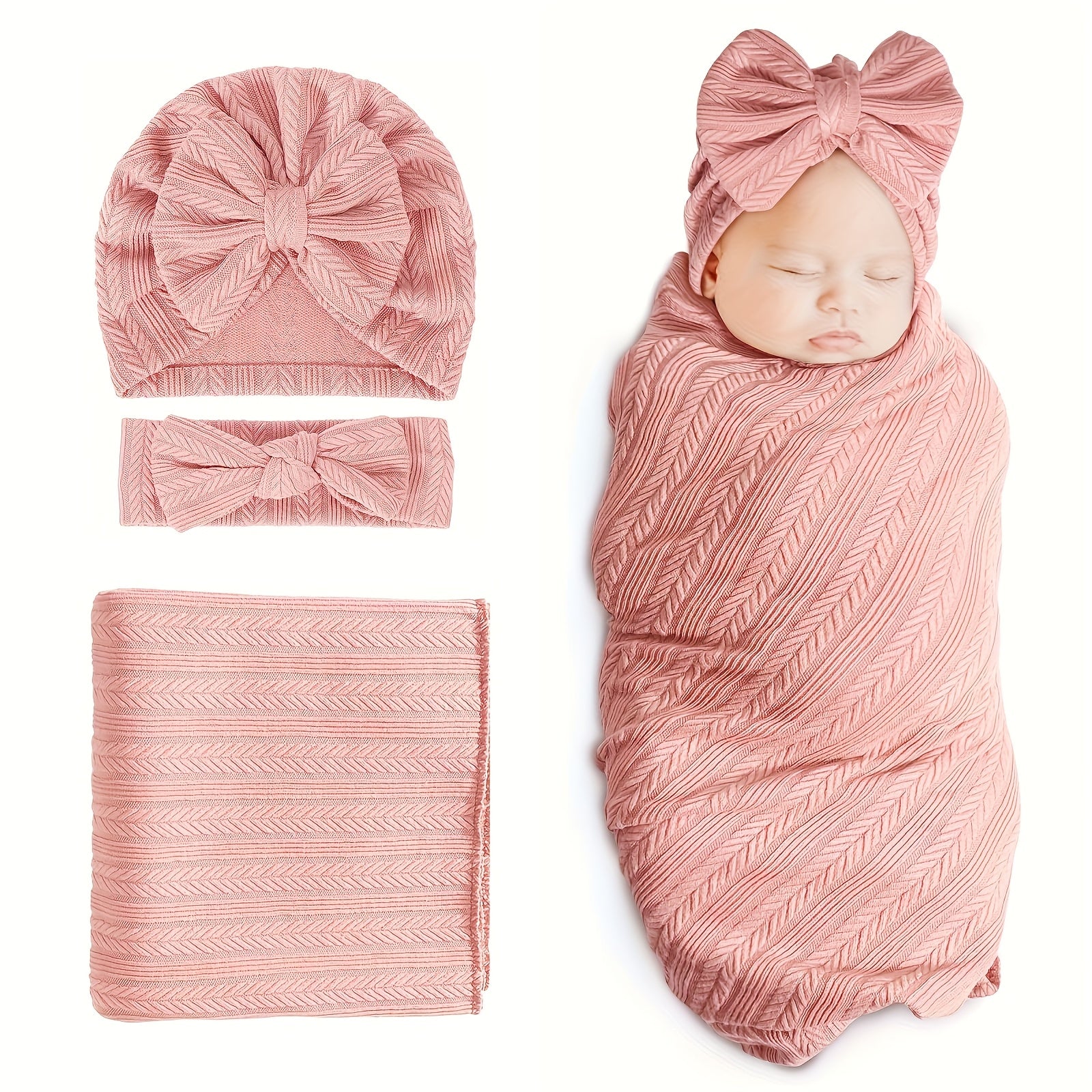 Baby Swaddle Blankets for Girls Boys, 3pcs Newborn Accessories Set with Matching Hat And Bow Headband Soft And Light Beige-friendly Texture, Suitable for All Four Seasons