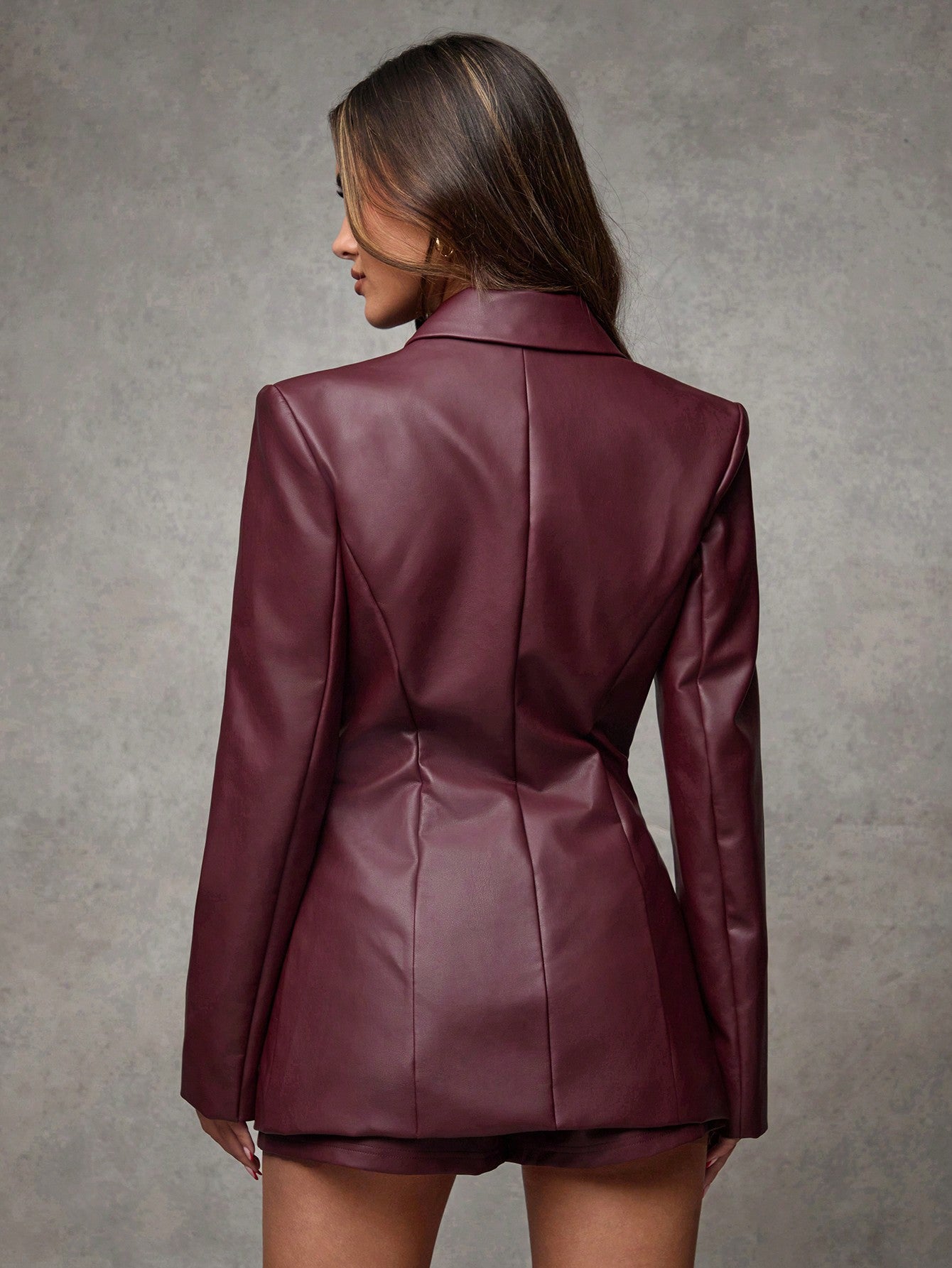 BAE Women's Vintage Burgundy Waist Cinched PU Leather Blazer Jacket, Suitable For Office, Halloween, Thanksgiving, Christmas, Autumn/Winter