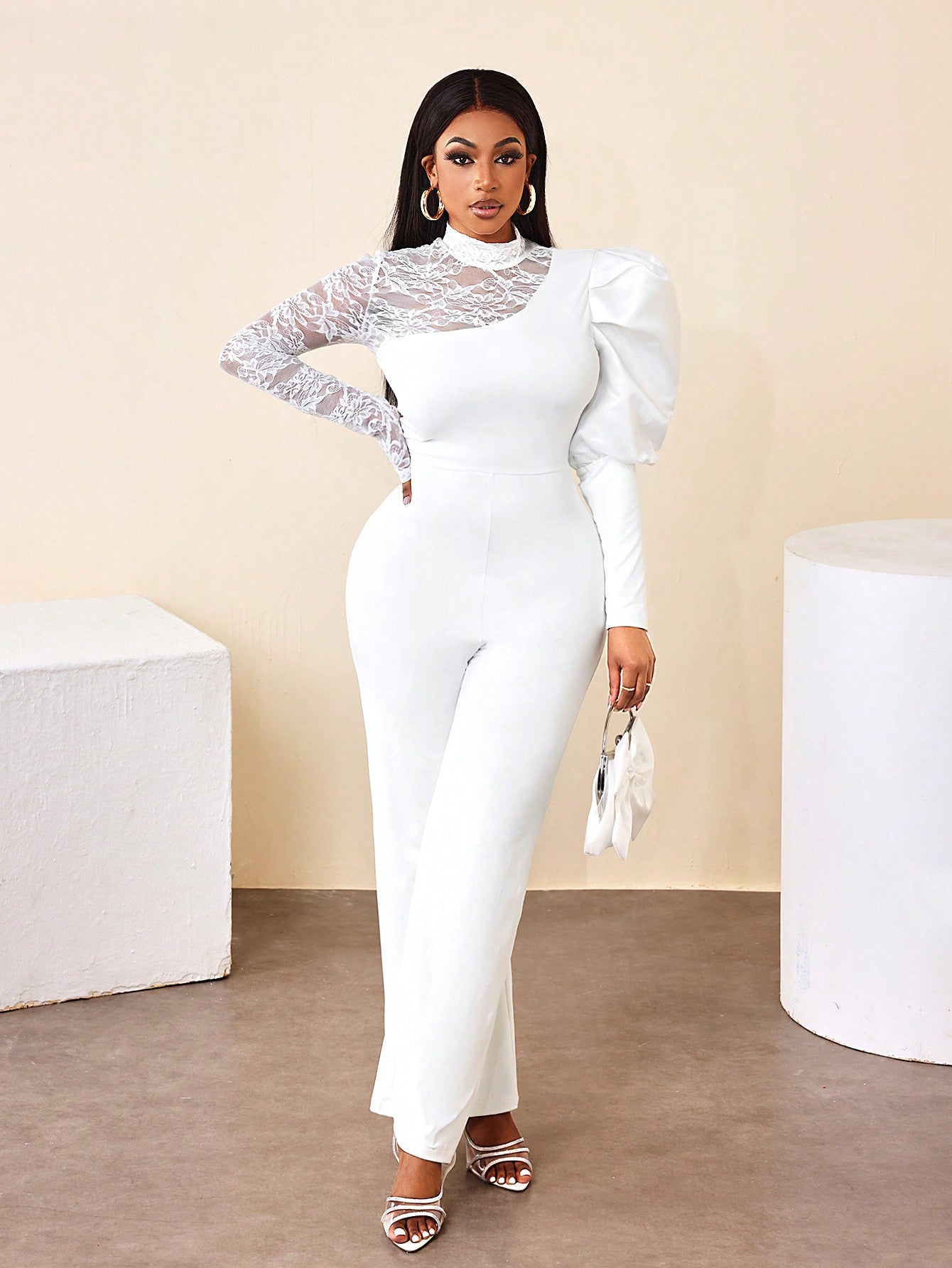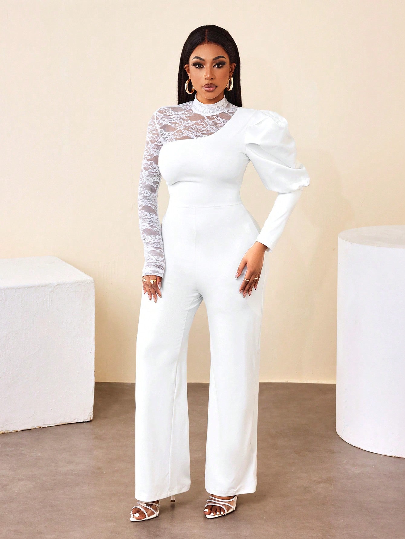 BamGleam Women's Mock Neck Long Sleeve Lace Patchwork Casual Jumpsuit