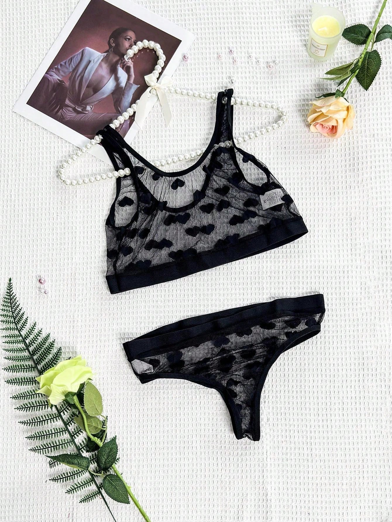 Black Sexy Sheer Mesh Heart Printed Lingerie Set With Floral Pattern