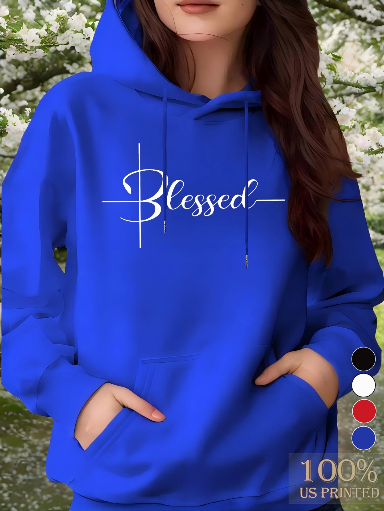 Blessed Letter Print Hoodie for Women, Casual Style, Cotton Blend, Hooded, Long Sleeve, Slight Stretch, Knit Fabric, Regular Fit Pullover with Pockets, for Fall/Winter