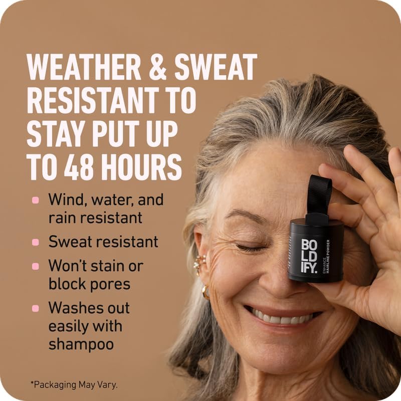 Instant Coverage, 48-Hour Guarantee - Locks on Until You Shampoo: Hair loss? Skip the embarrassing all-day touch-ups. BOLDIFY is the ultimate hair shadow powder - locking tightly to your follicles and covering your scalp, without clogging pores, for that full-bodied, knock-out look that stays put until your next shampoo. Use by itself or combine with BOLDIFY Hair Fibers for thinning hair for next-level coverage. Works great for grey coverage, rootline touchups, and brightening highlights, too!
