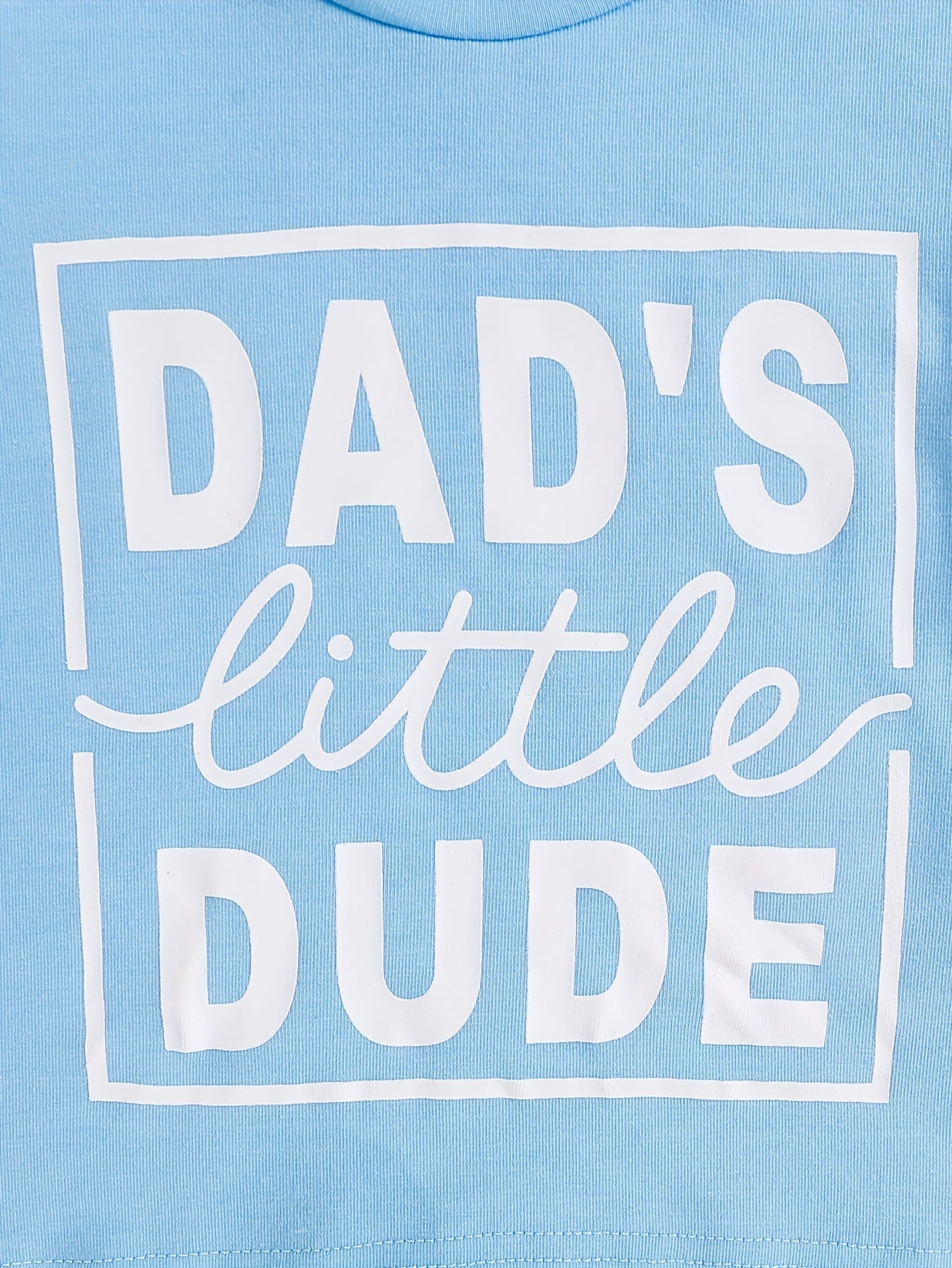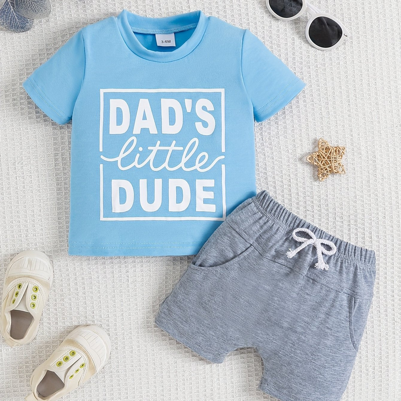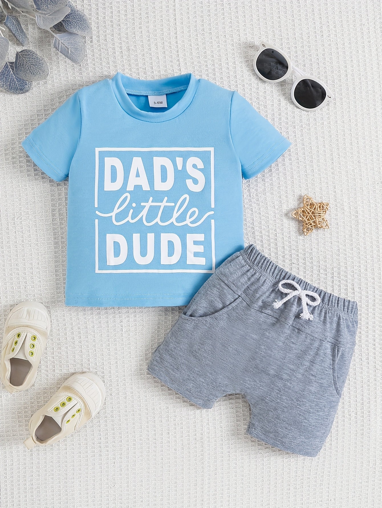 Boys' "DAD's LITTLE DUDE" Casual Outfit - Light Blue Short Sleeve Tee & Gray Drawstring Shorts Set, Comfortable Polyester Blend, Perfect for Summer, Kids Daily Clothing|Casual Kids Fashion|Easy Movement Wear, Perfect for Outdoor