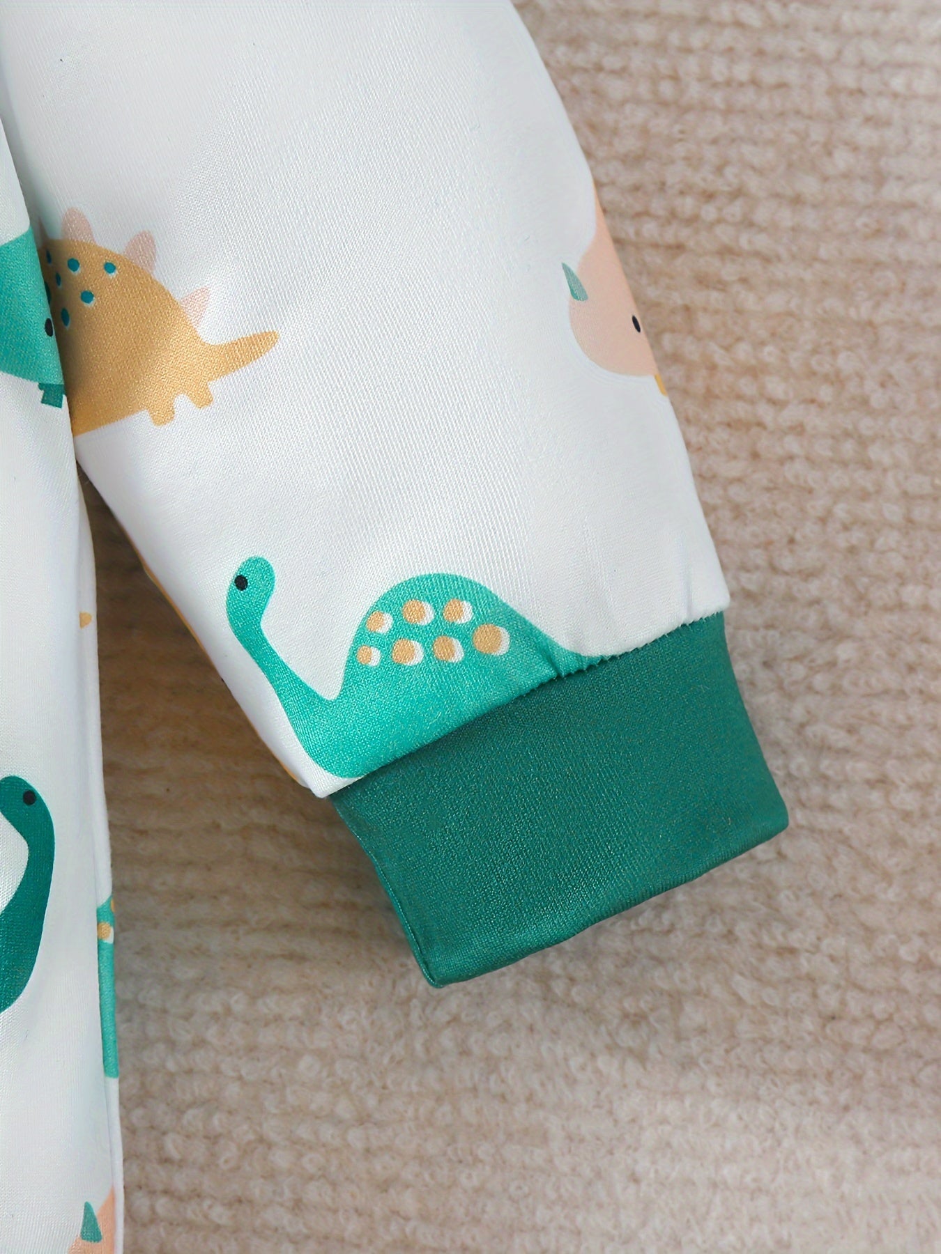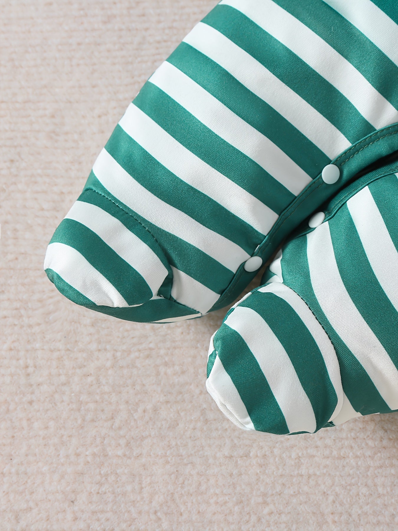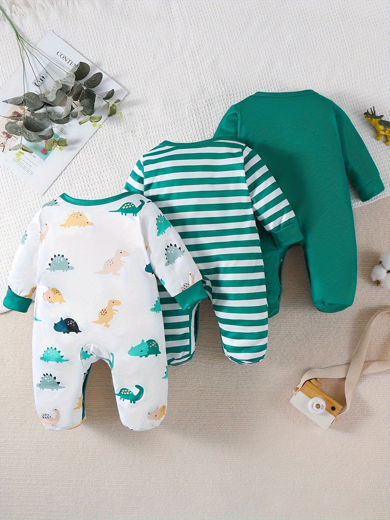 Boys' Green Series Striped Dinosaur Footed Romper Three-Piece Set with Matching Shorts and Plush Hat, Perfect for Outdoor
