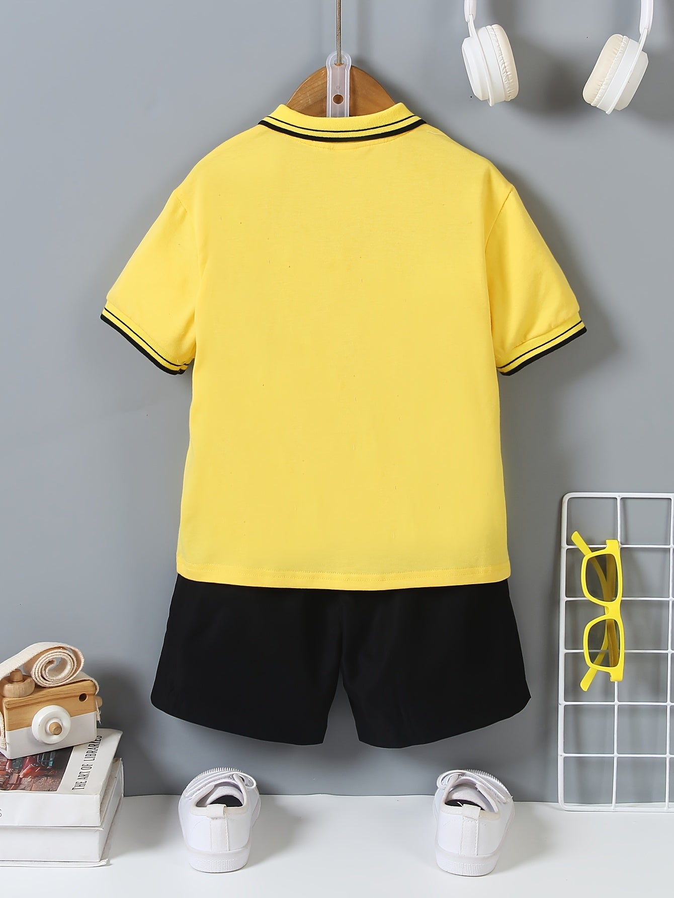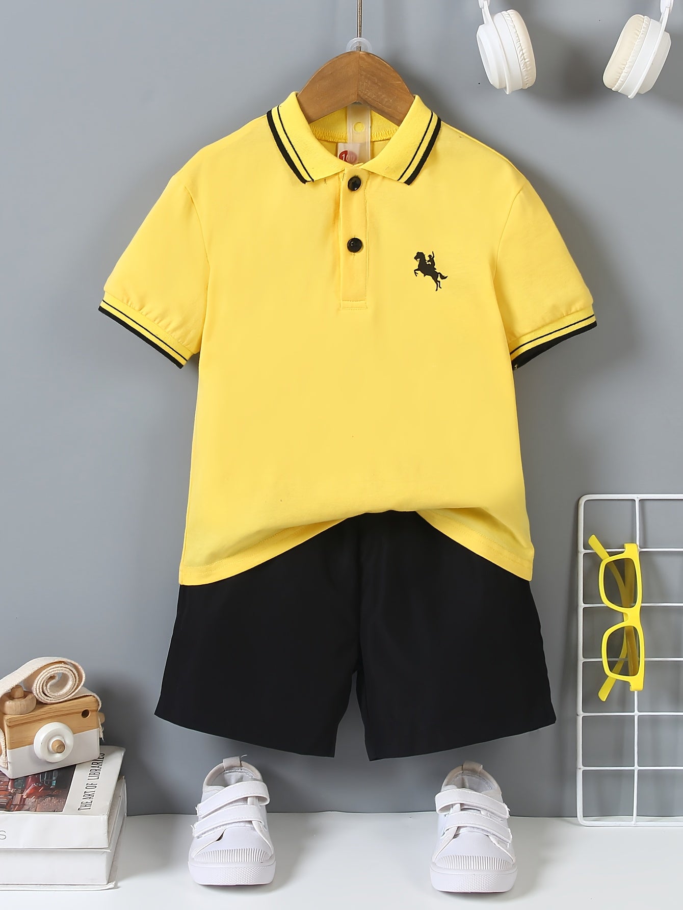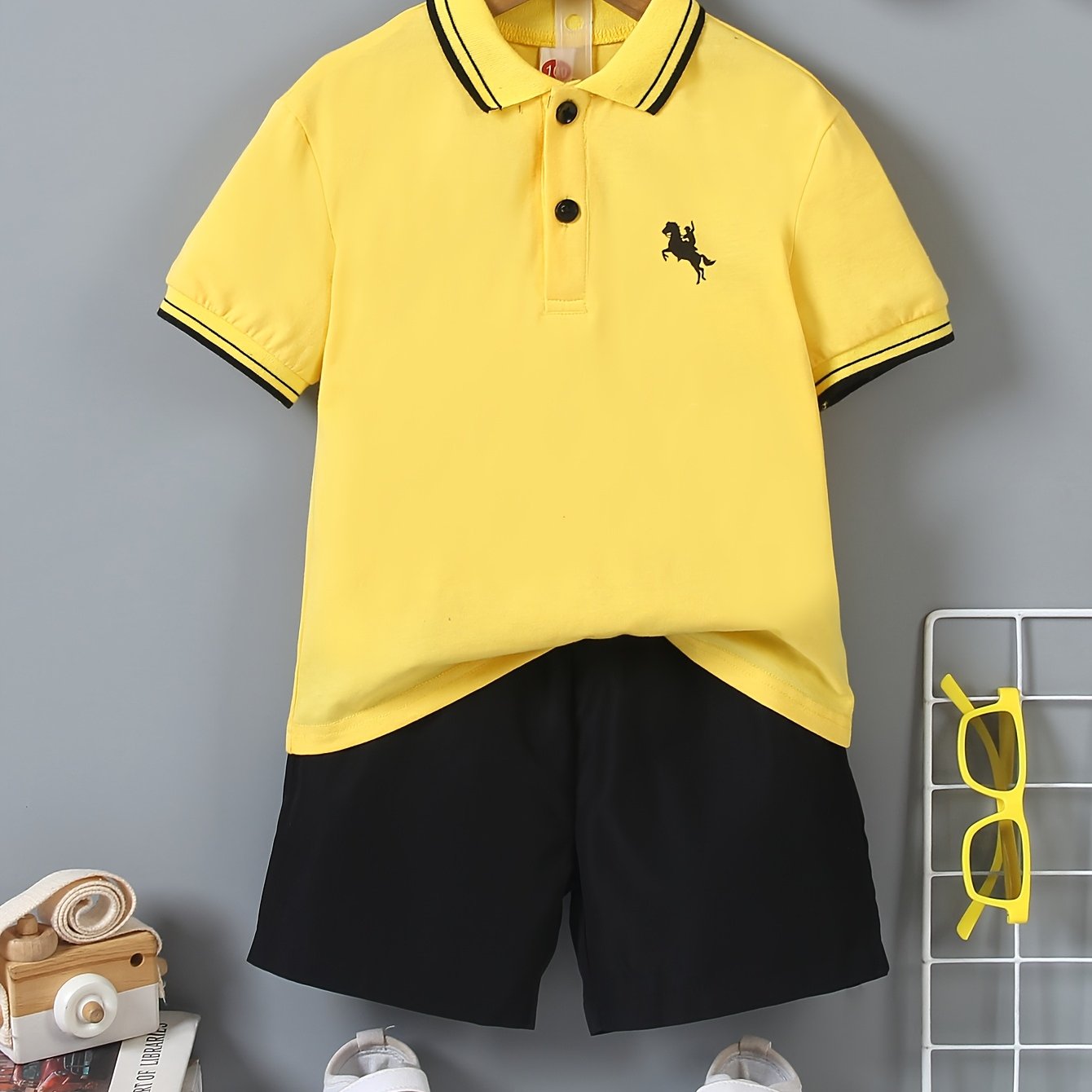Boys' Preppy Shirt & Shorts Set with Horse Print - Yellow, Stretch Polyester, Machine Washable, Spring/Summer Outfit, Short Sleeve, Curved Pocket, Perfect for Outdoor