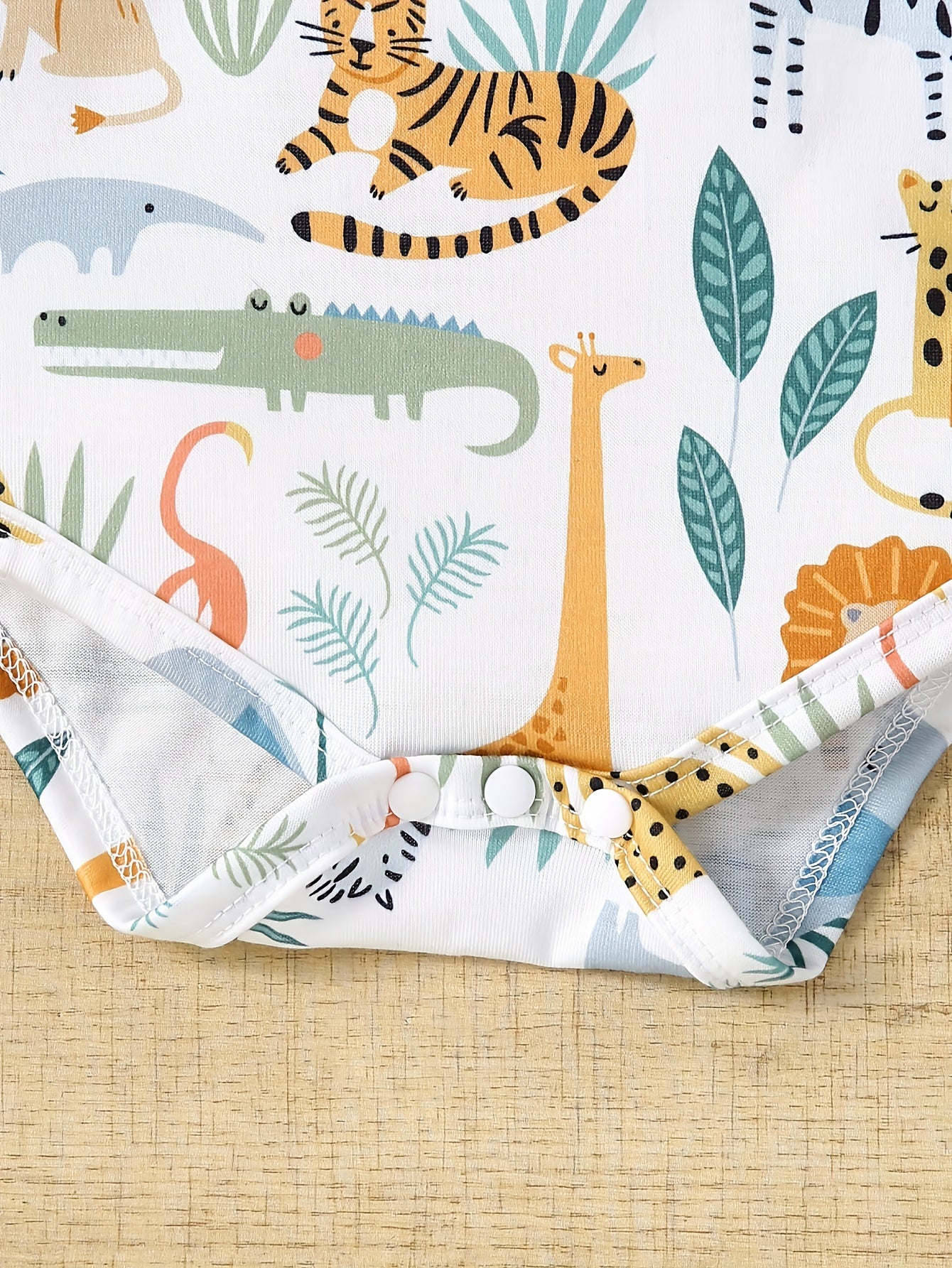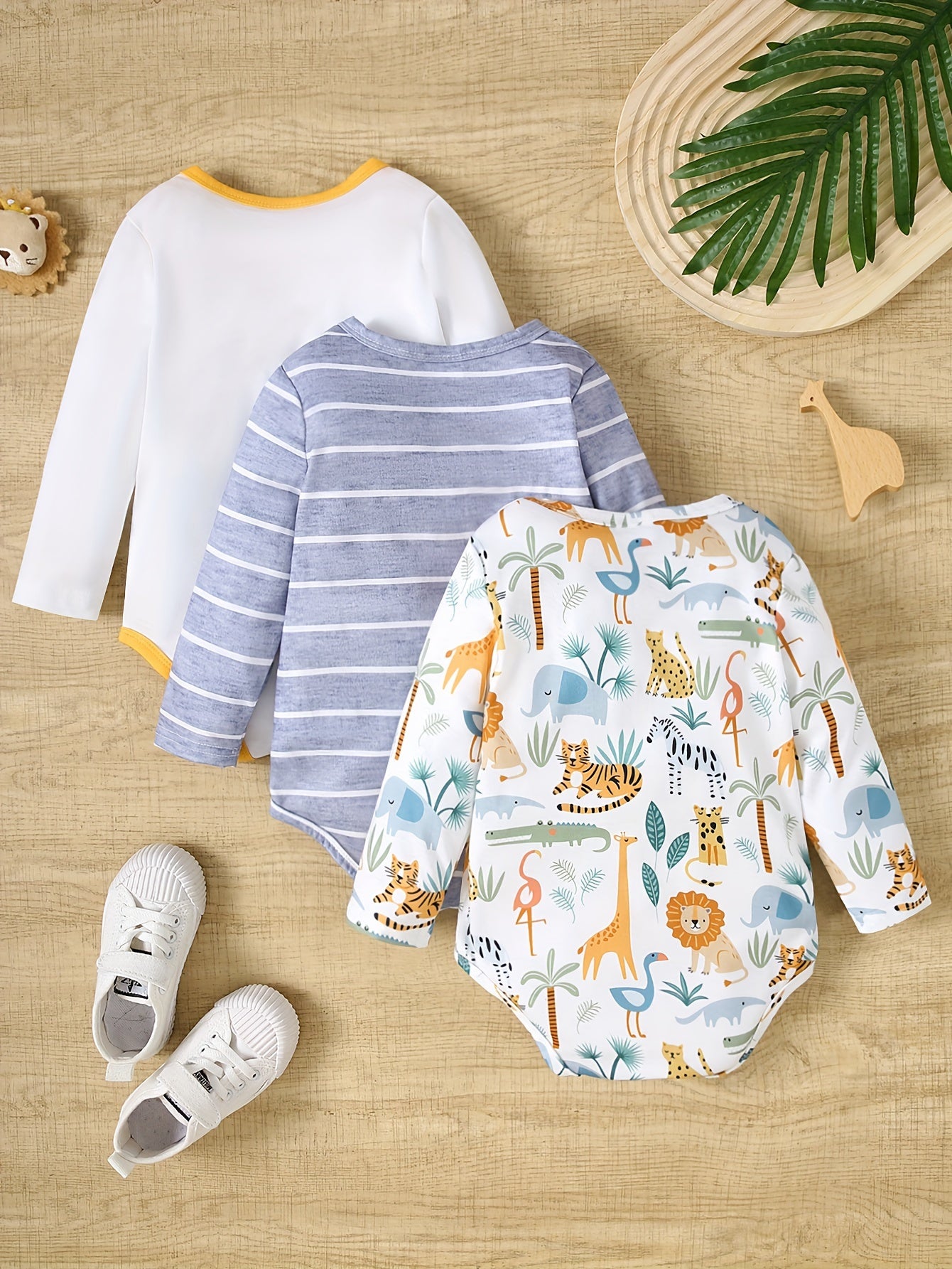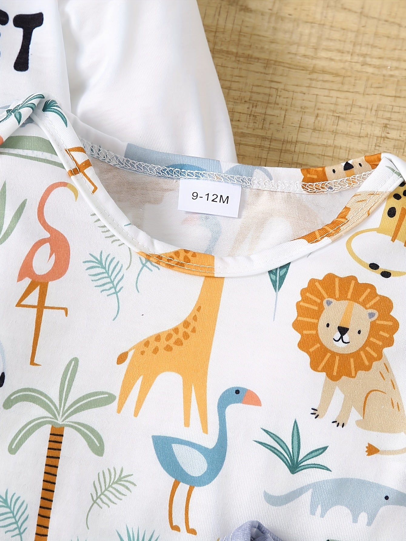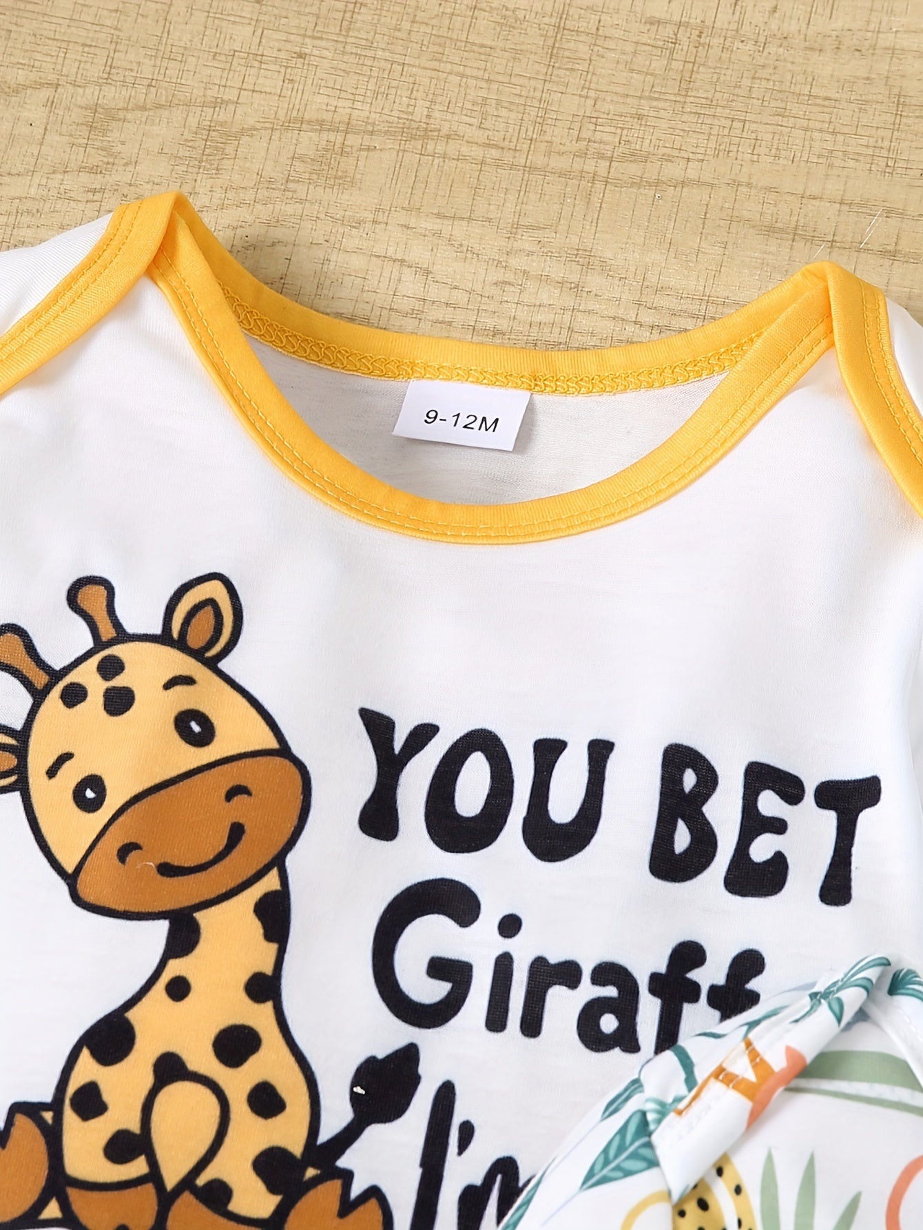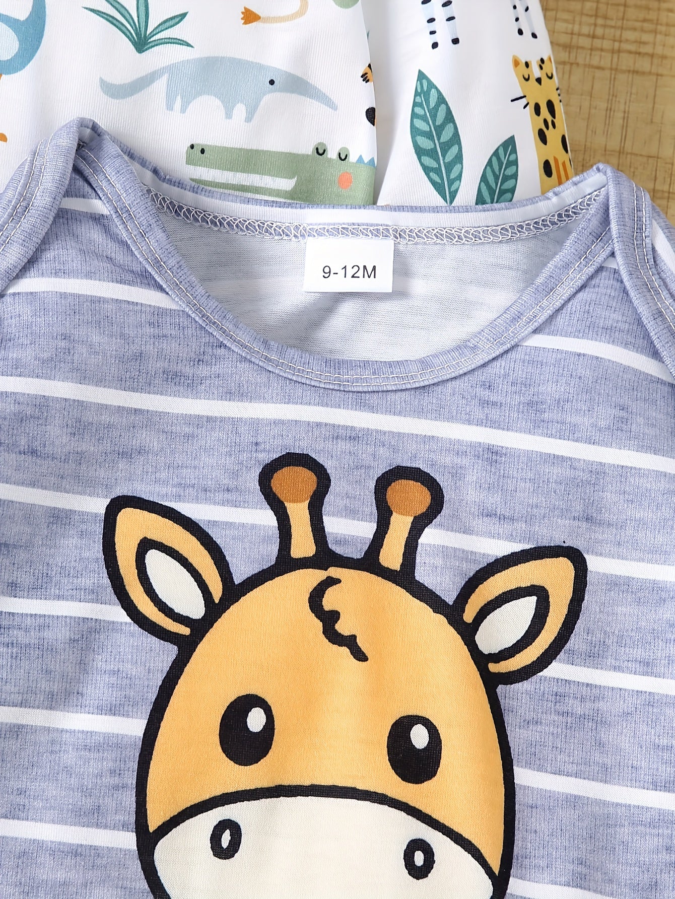 Boys' Round Neck Long Sleeve Cartoon Giraffe Print & Wildlife Full-Body Print Three-Piece Set - New Autumn/Winter Collection, Perfect for Outdoor Play and Casual Attire, Baby Boy Clothes, Easy Diaper Change, Playful Baby Apparel, Comfortable Snap Closures