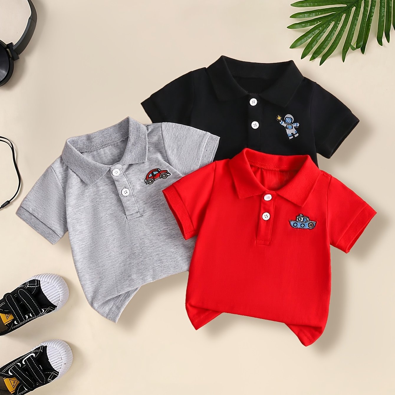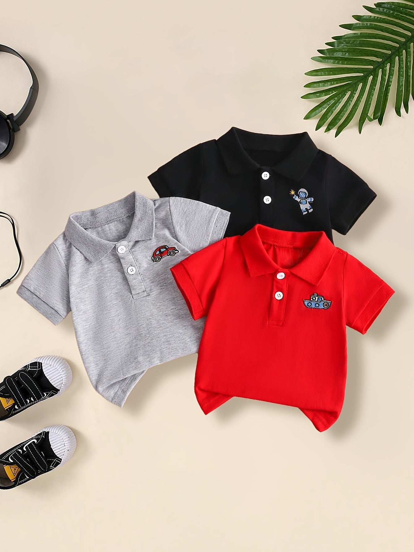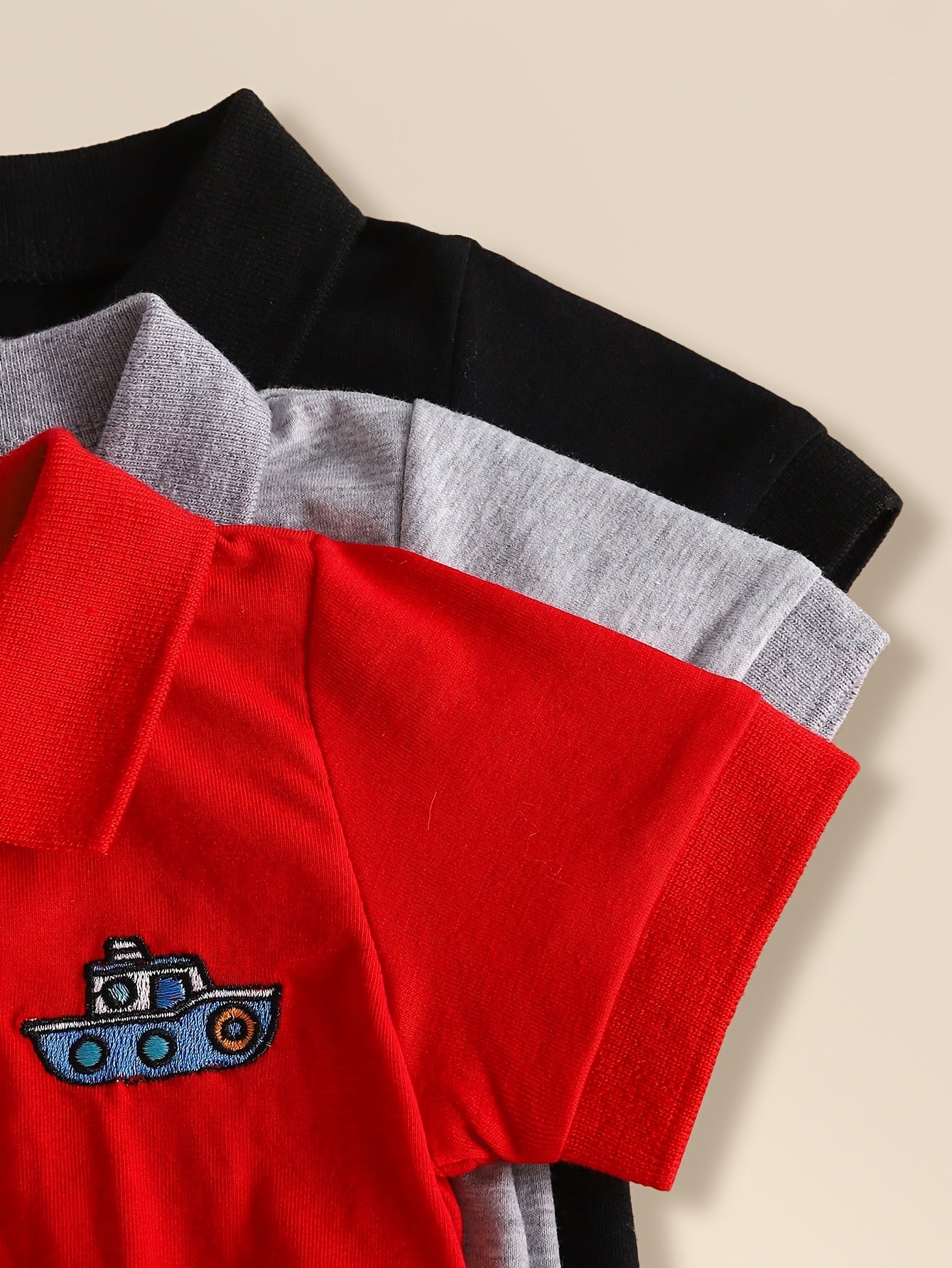 Boys' Summer Fashion Short-Sleeve Top Sliky Fiber Fabric Comfortable Material Cartoon Pattern Embroidery Ribbed Collar Red Black Gray Three-Piece Set for Outdoor Outings