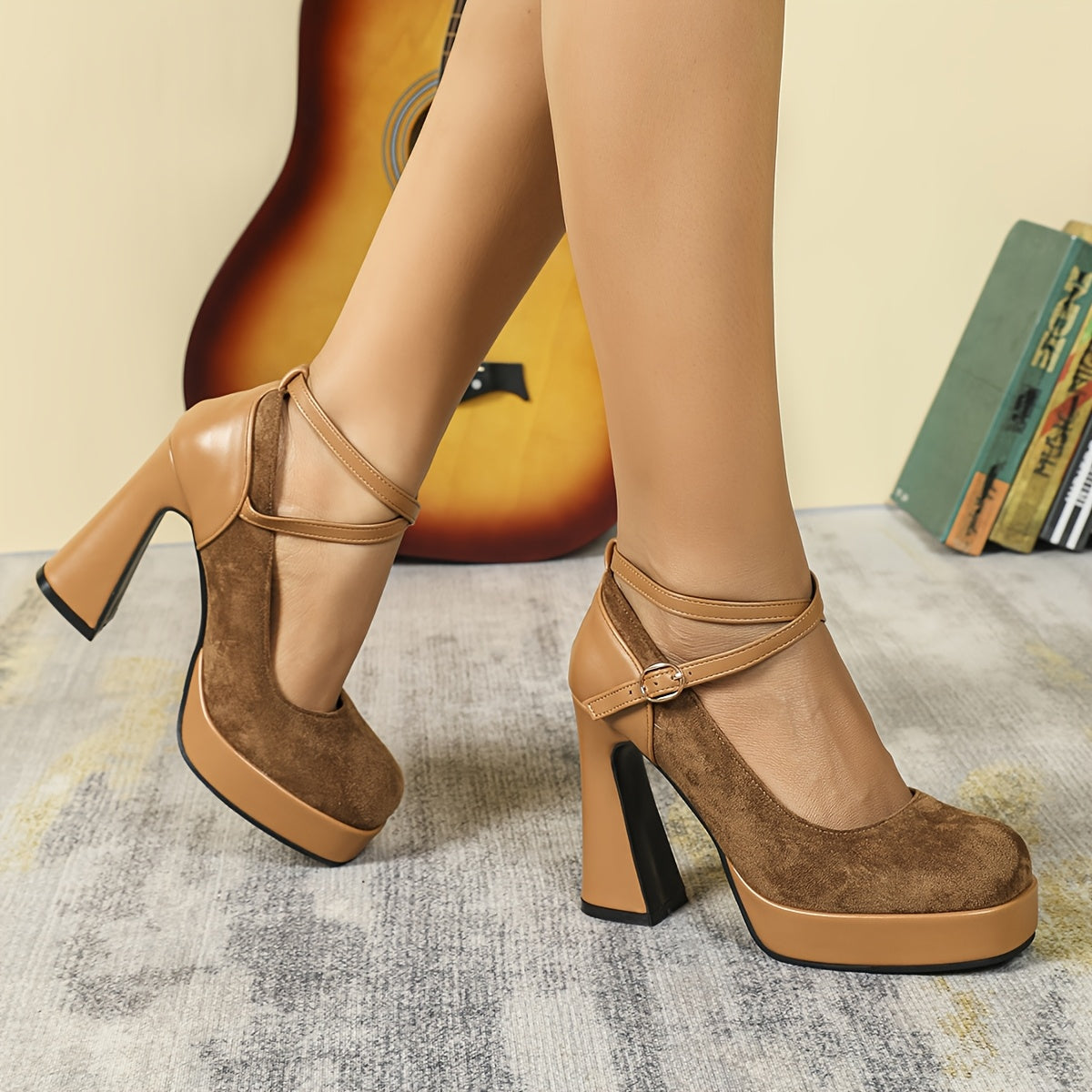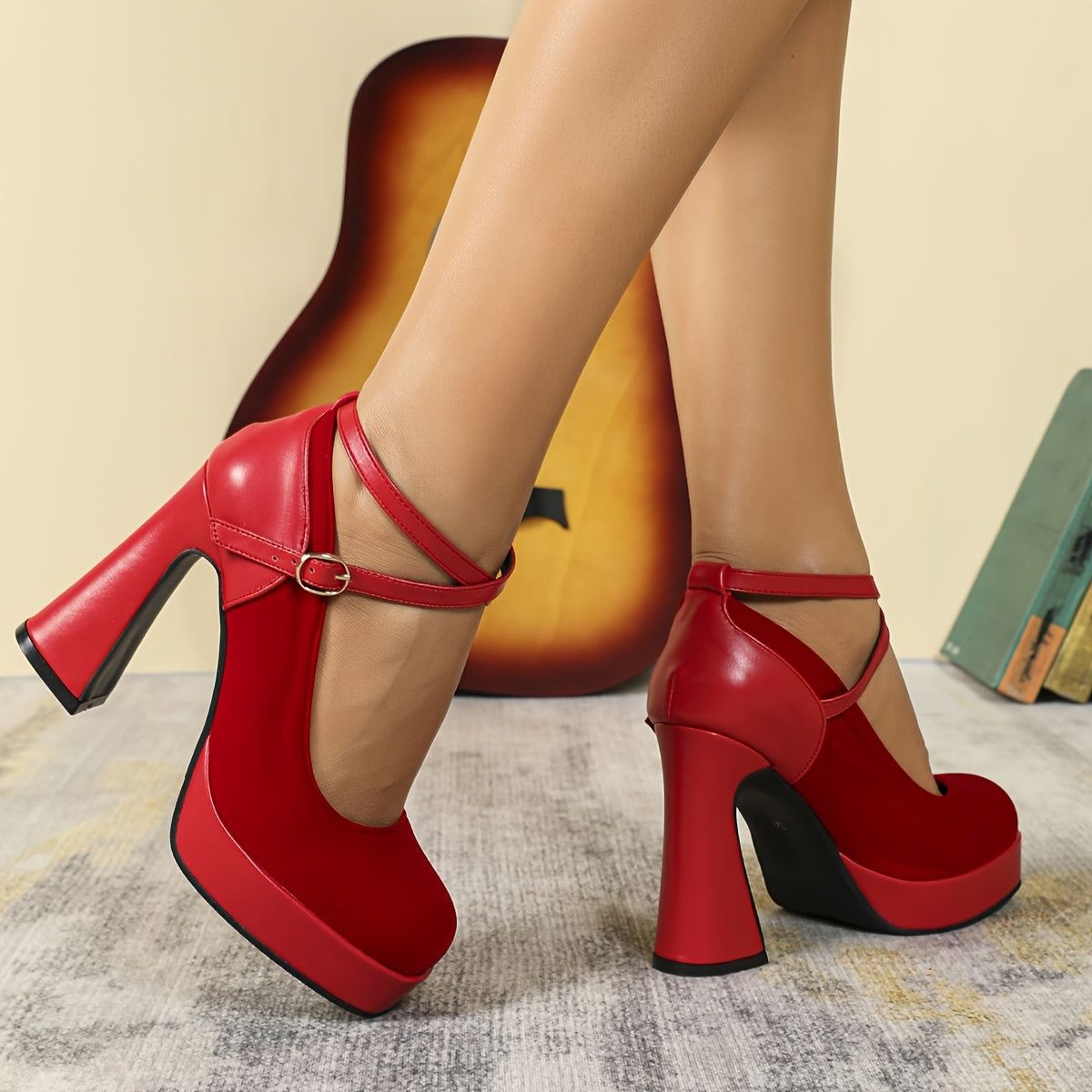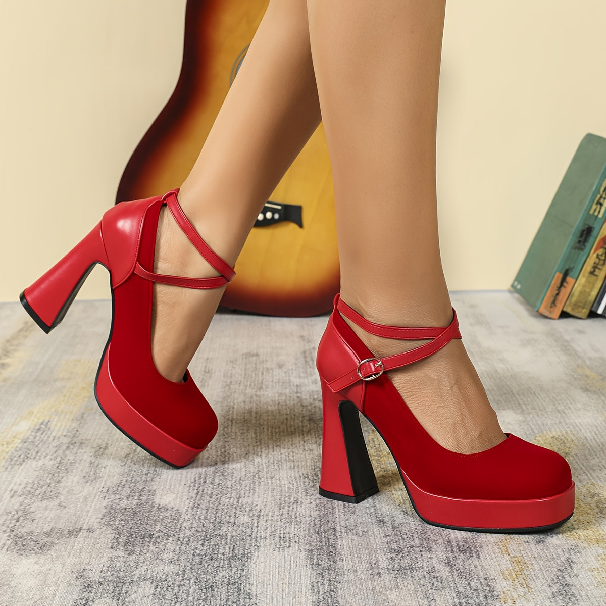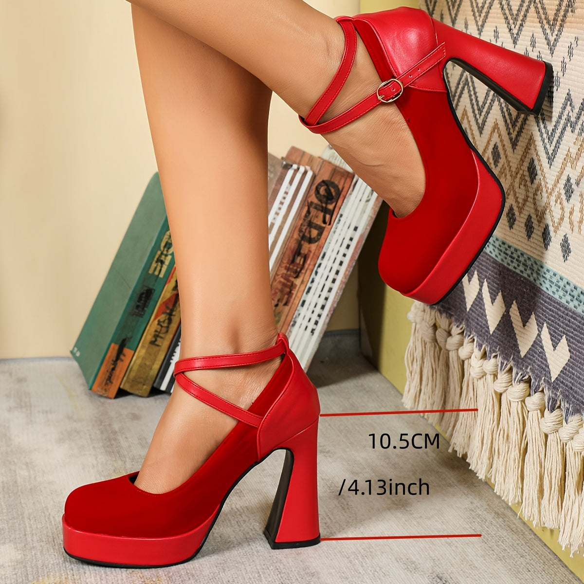 [Breathable Fabric High Heel Dress Shoes] Red & Black Breathable Fabric Elegant Women's High Heel Dress Shoes - Ankle Strap Platform Pumps with Faux Cover Lining for Work & Performance, Stiletto Heels