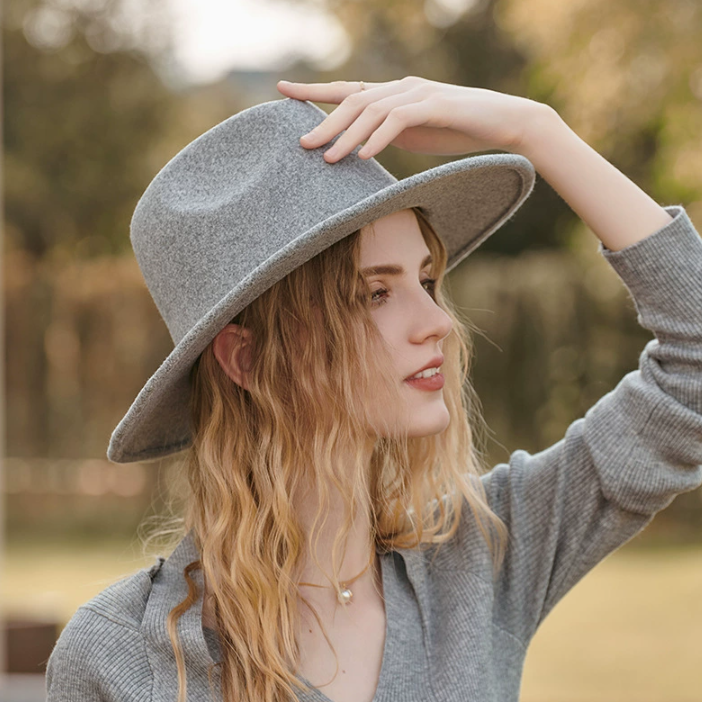 British Jazz Panama Hat Gray Knot Decoration Wool Hat Big Brim Autumn Winter Elegant Hat