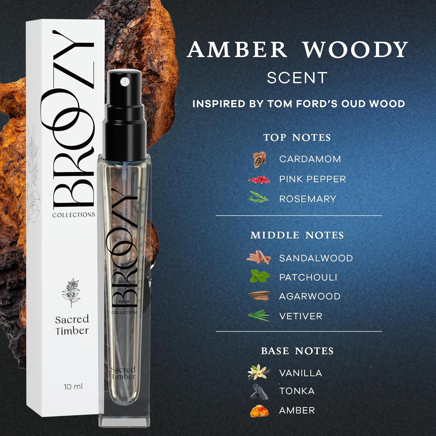 BOLD SACRED TIMBER - Our Sacred Timber sample cologne for men features Cardamom, Pink Pepper, Rosemary, Sandalwood, Patchouli, Agarwood (Oud), Vetiver, Vanilla, Tonka, and Amber. A deep, woody fragrance for the modern man.