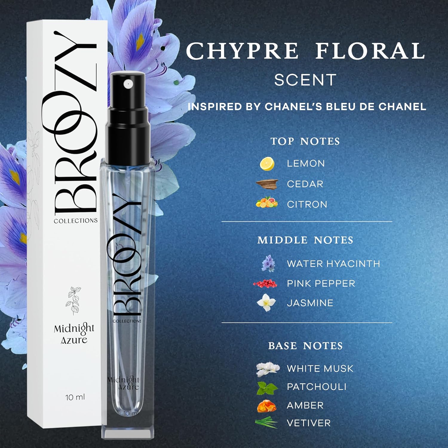 DÉBONAIR MIDNIGHT AZURE: Midnight Azure is a good cologne for men that blends Lemon, Cedar, Citron, Water Hyacinth, Pink Pepper, Jasmine, White Musk, Patchouli, Vetiver, Teak Wood, Iris, and Amber. A captivating and refined scent.
