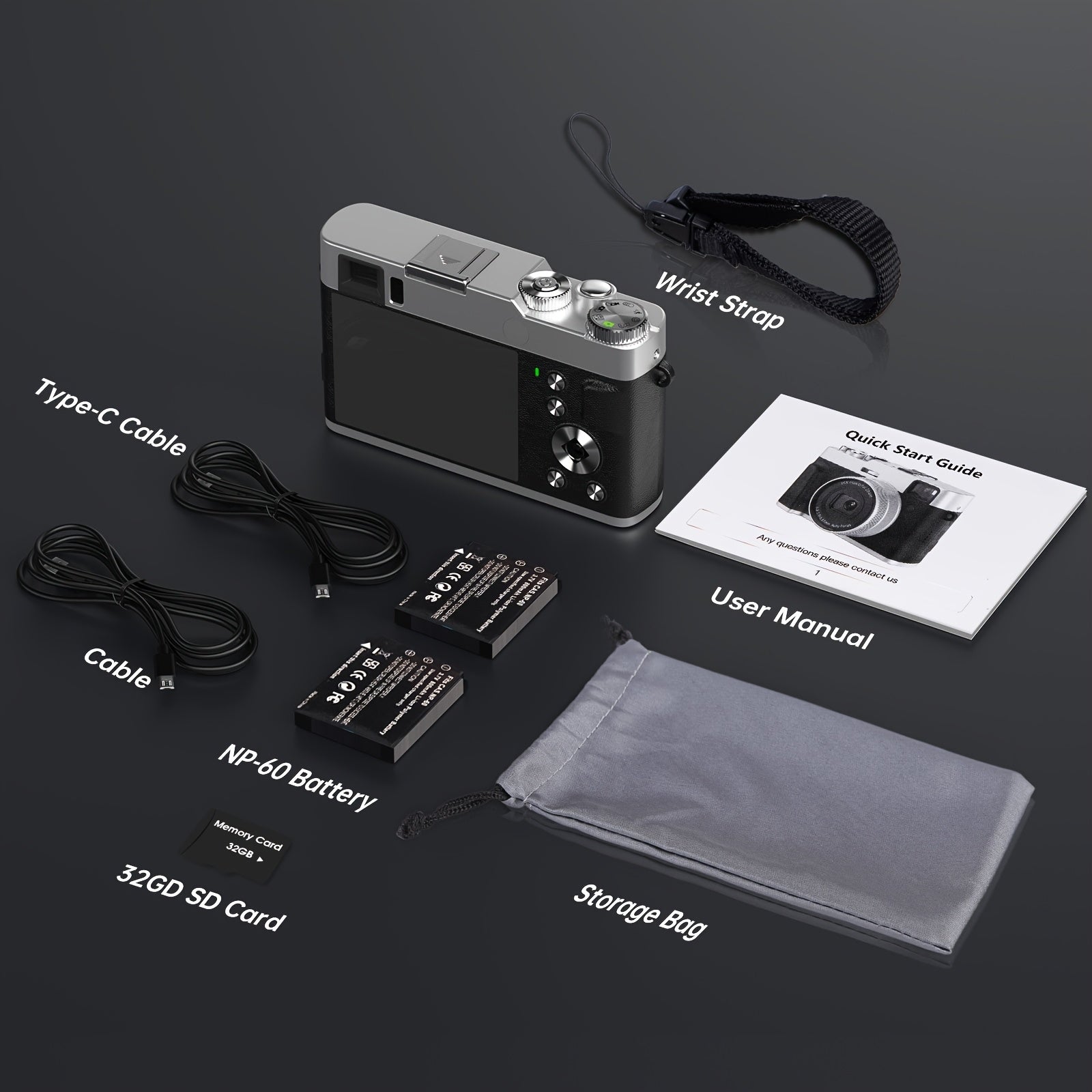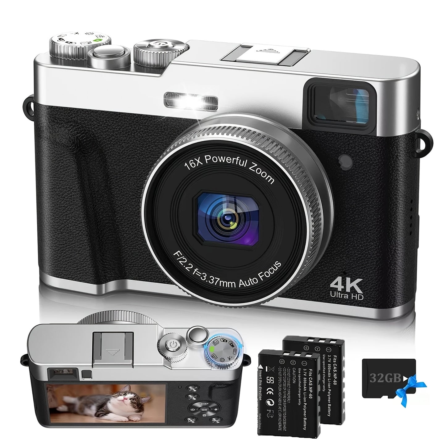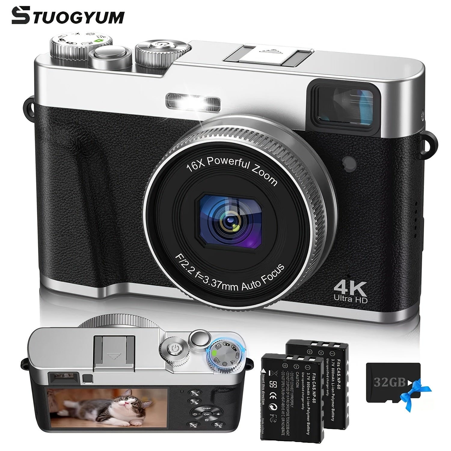 Caméra de Vlogging STUOGYUM 4K Ultra HD - 48MP avec Mise au Point Automatique, Zoom 16X, Anti-secousse, Appareil Photo Numérique Portable pour Photographie & Vidéo, Comprend Viseur, Flash, Carte 32GB, 2 Batteries Rechargeables, Prend en Charge Microphone