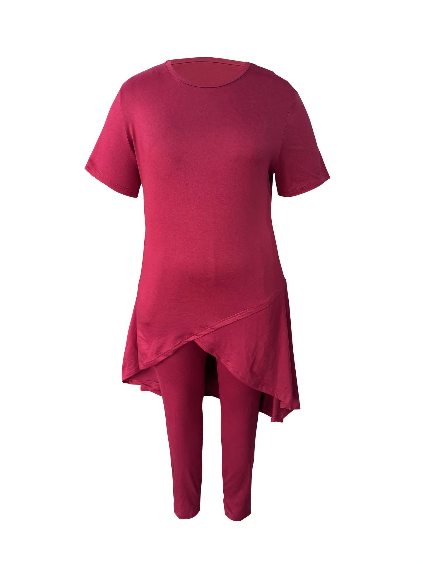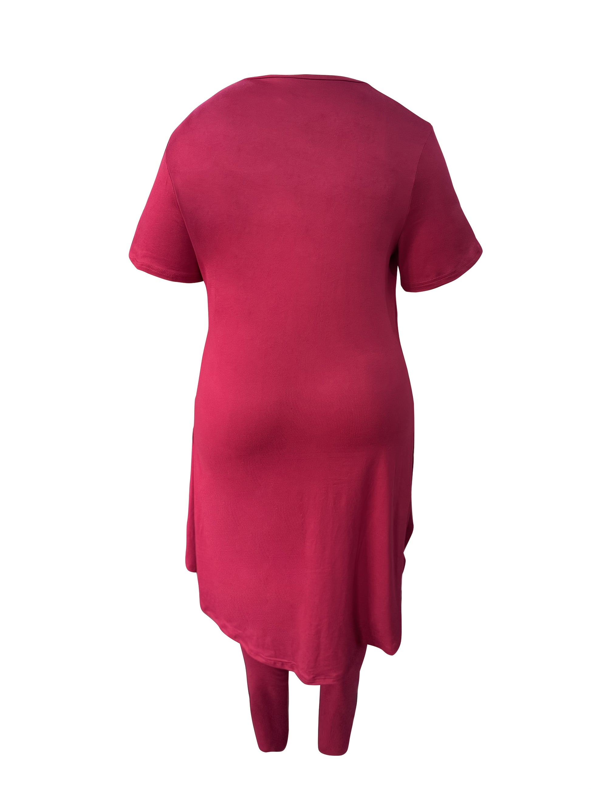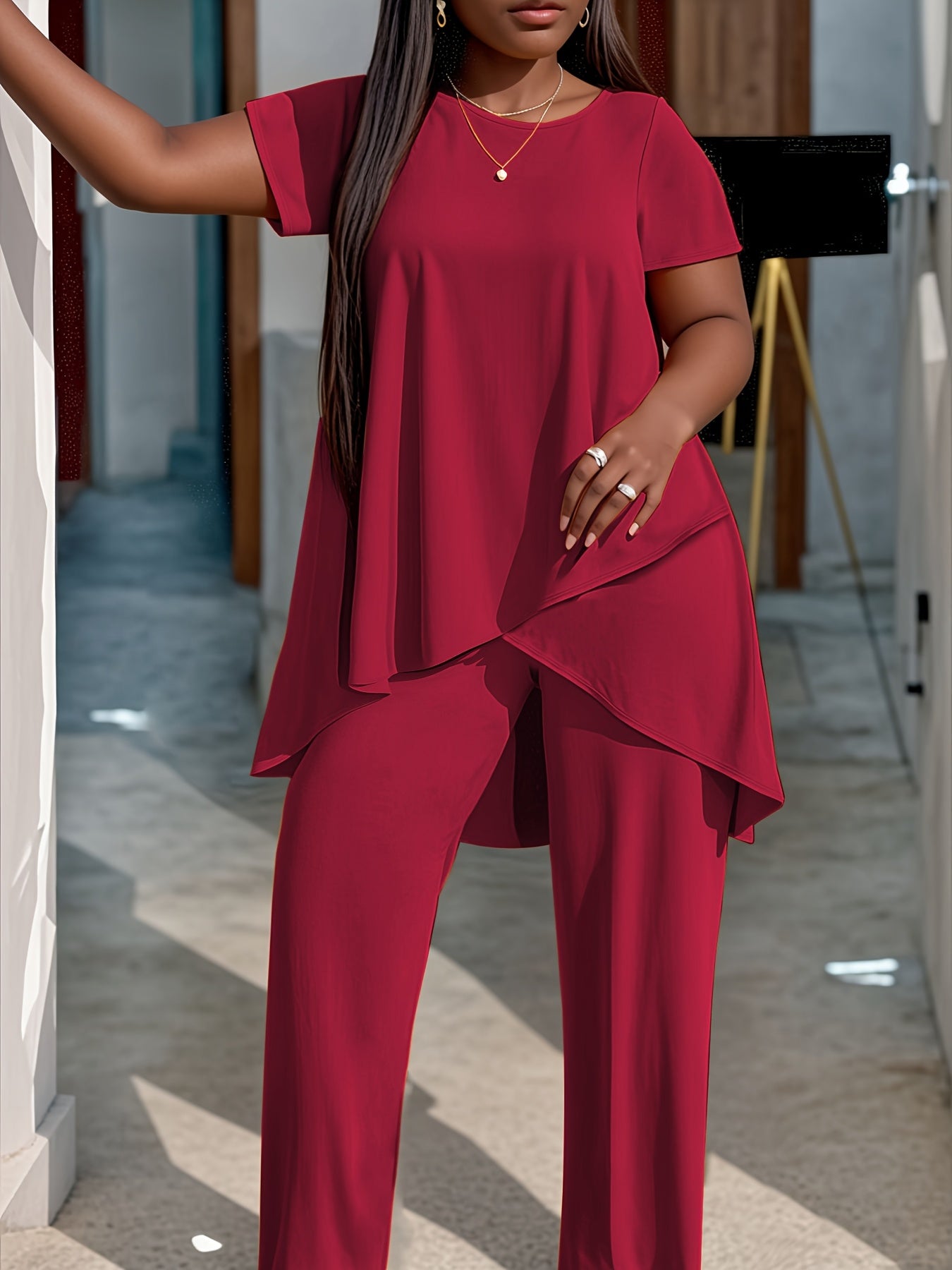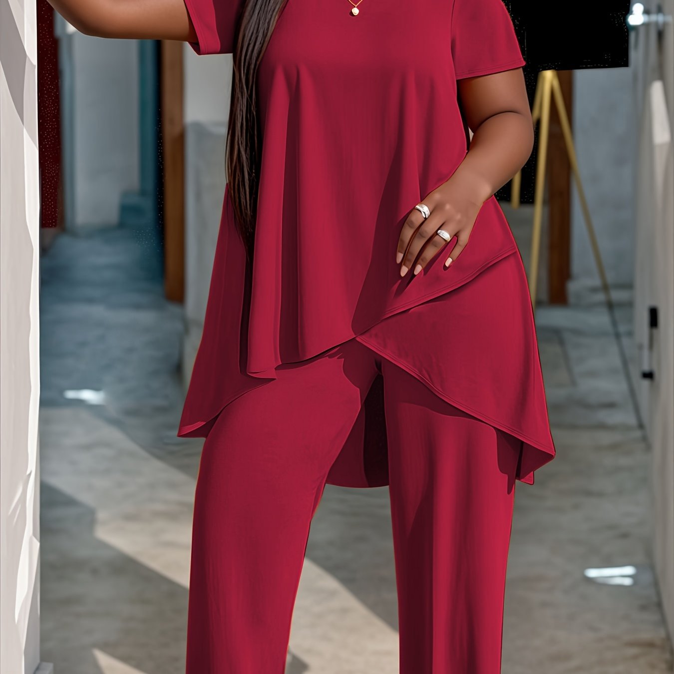 Casual Chic Plus Size Elegant Red Two-Piece Set for Women - Chic Short Sleeve Round Neck T-Shirt with Asymmetrical Hem & Stretchy Full-Length Pants, 92% Polyester & 8% Spandex, Machine Washable - Perfect for Spring & Autumn