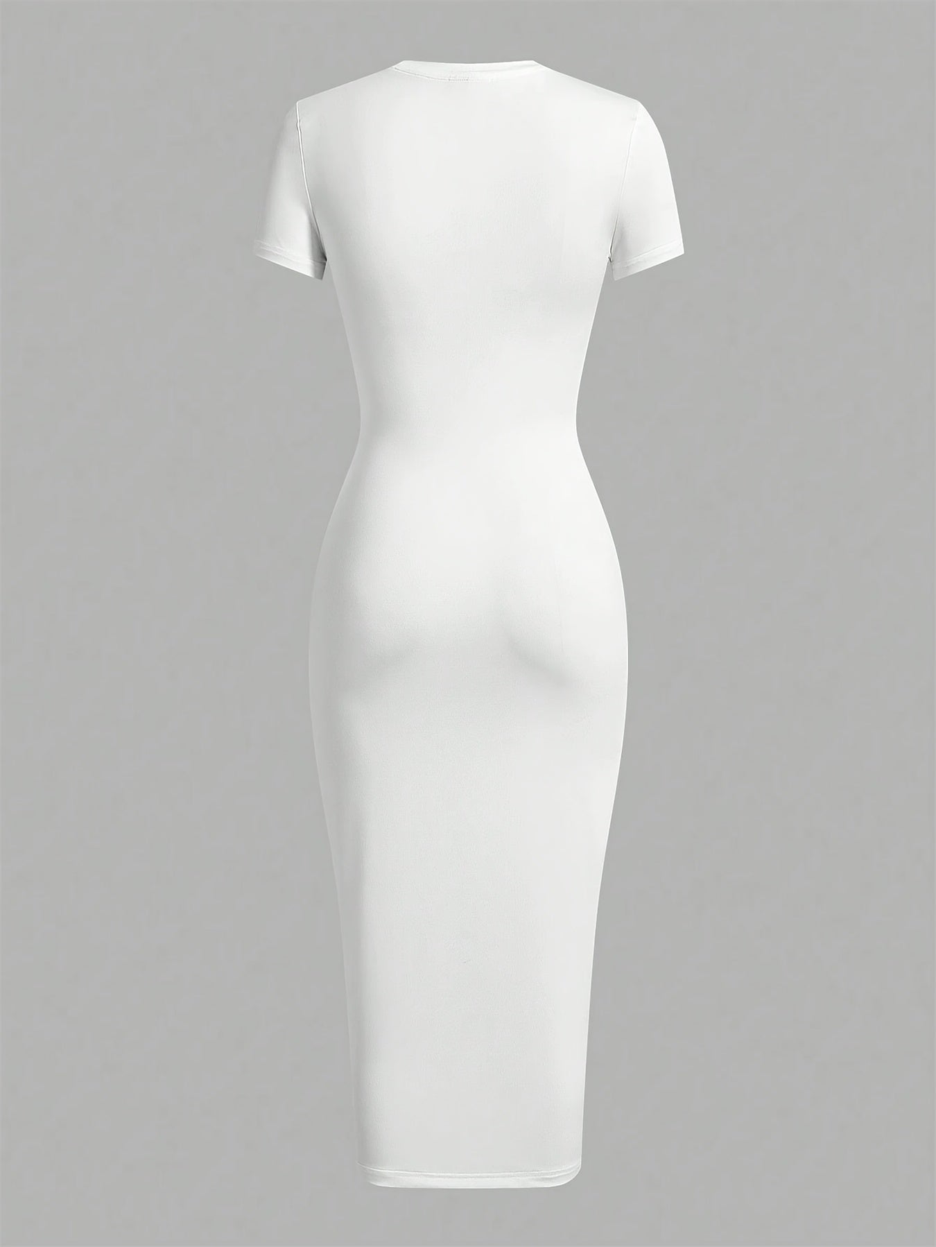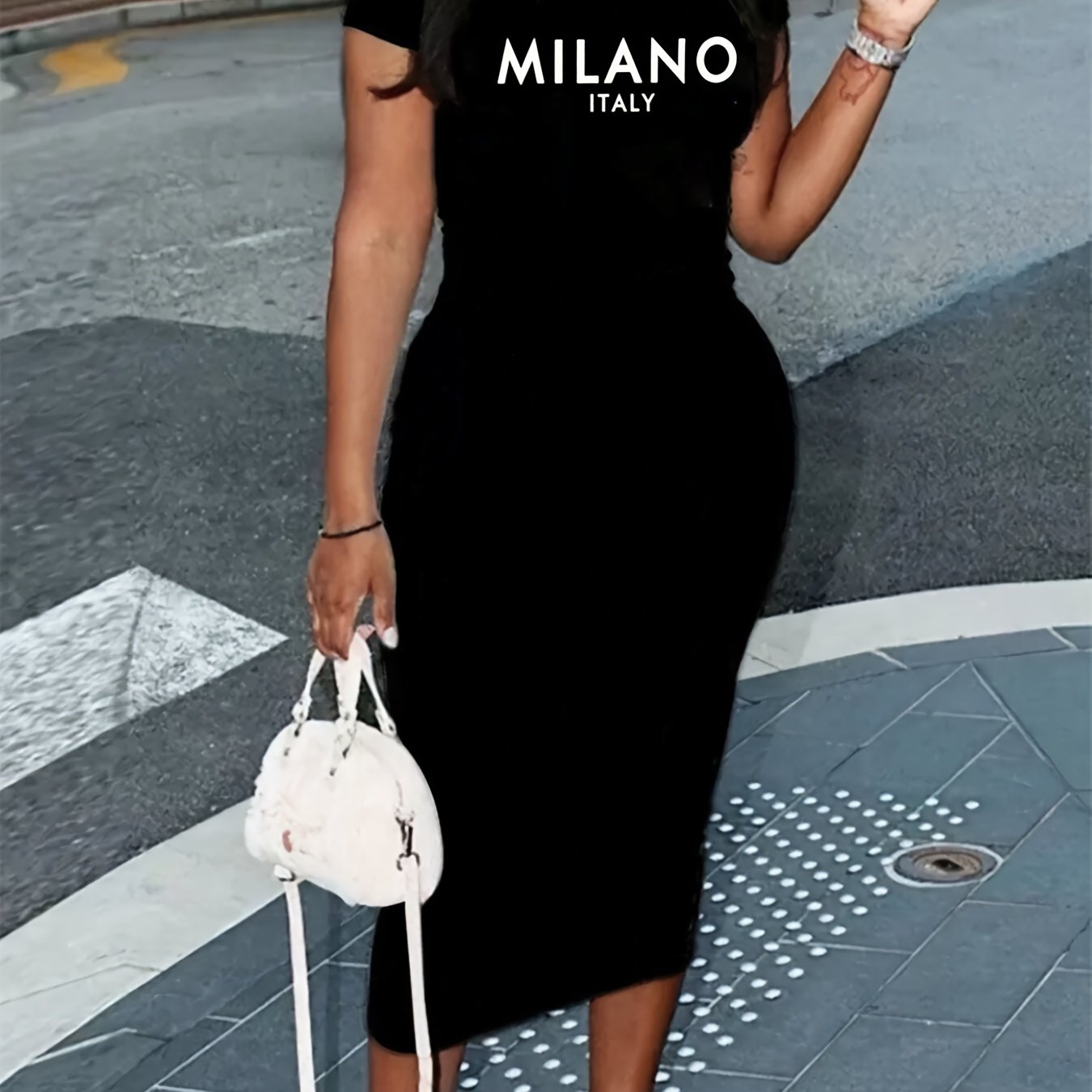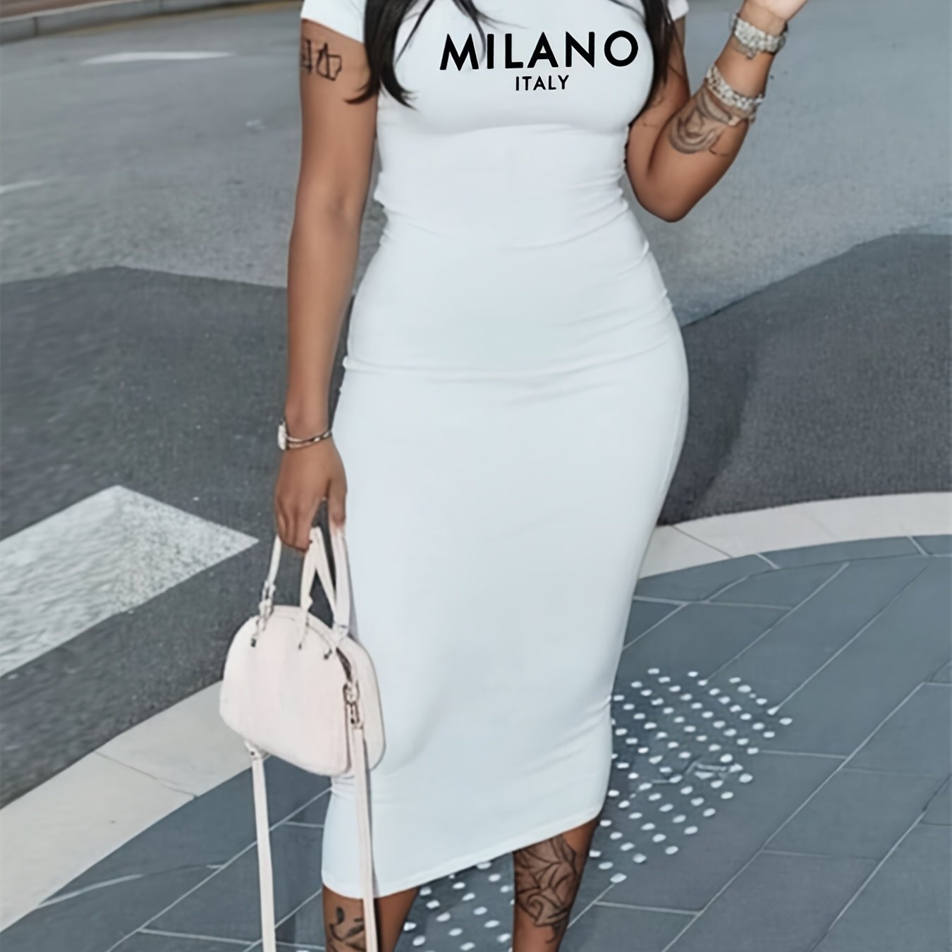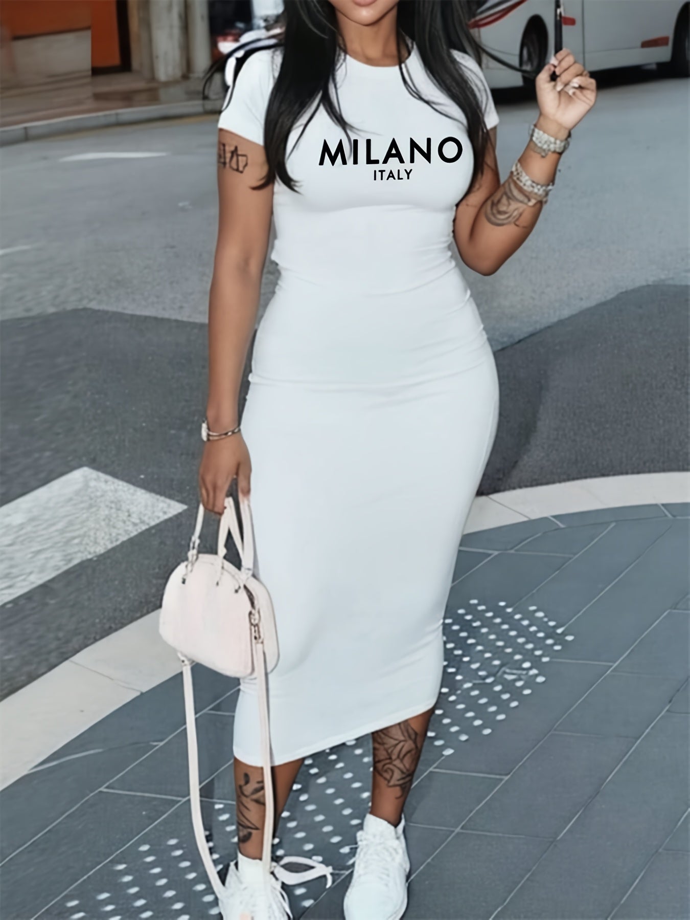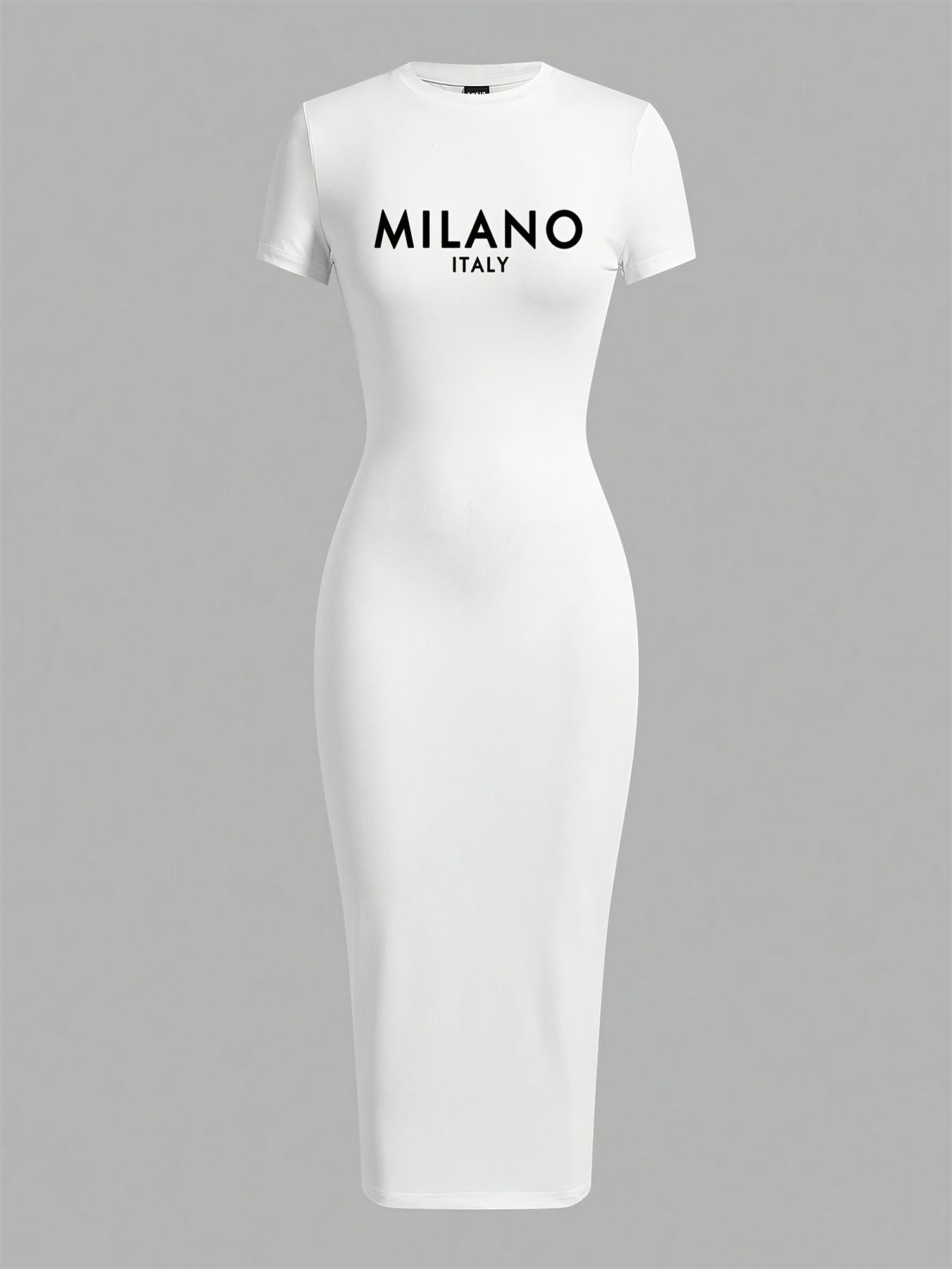 Casual MILANO Pattern Short Sleeve Crew Neck Bodycon Mid-Length Dress For Women, Summer