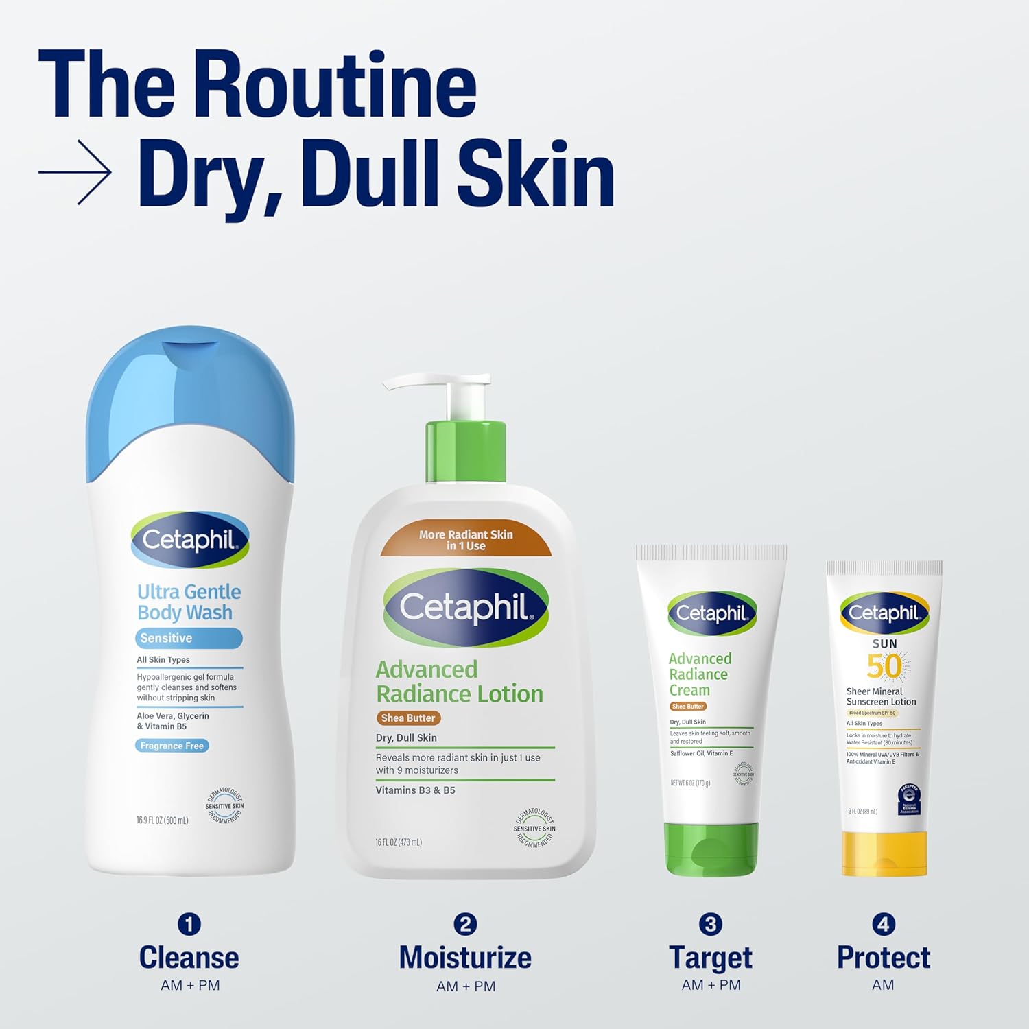 CETAPHIL ADVANCED RADIANCE FACE & BODY CREAM: Enriched with a high concentration of shea butter to deeply moisturize and nourish skin while helping to prevent visibly dry skin from coming back