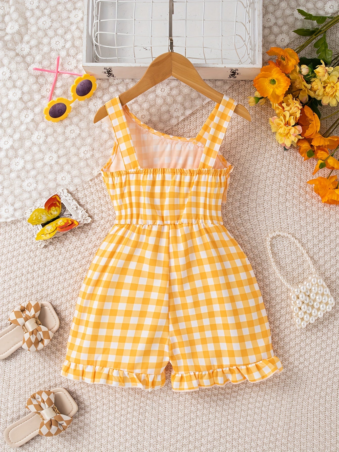 Chic Summer Plaid Romper for Girls - Sleeveless, One-Shoulder with Ruffle Trim & Elastic Waistband, Leaves Print, Regular Style, Short, Perfect for Outdoor