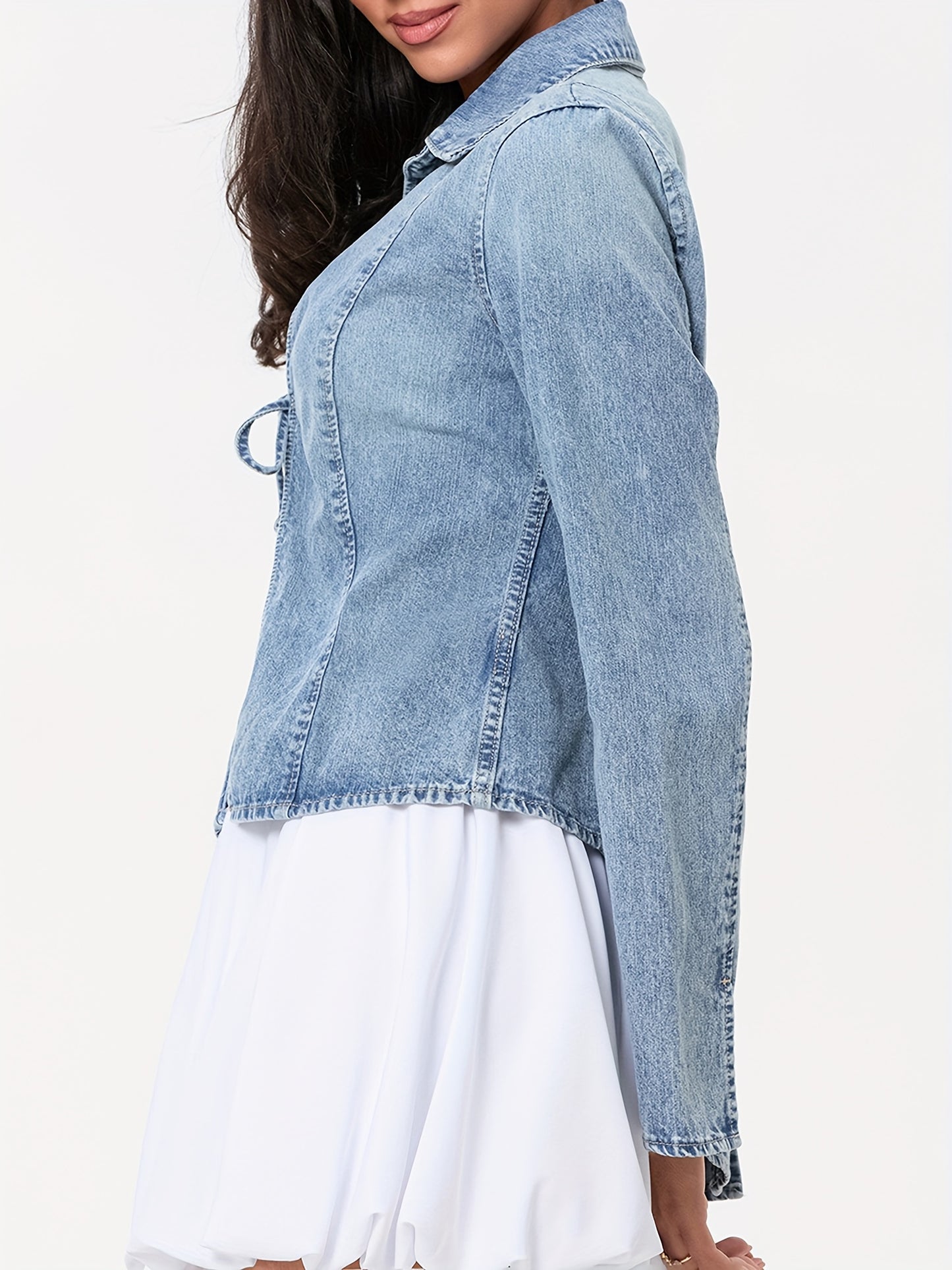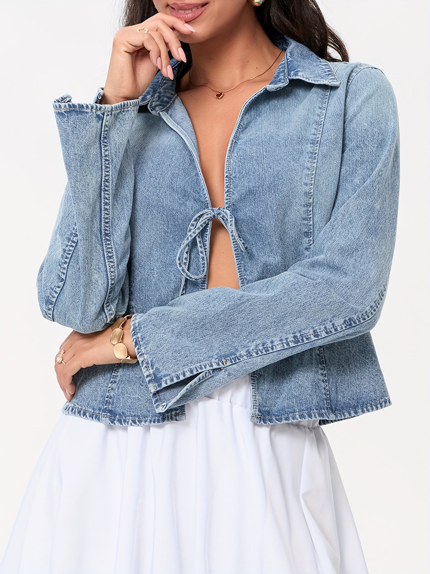 Chic Tie-Front Denim Shirt for Women - Casual Long Sleeve, Solid Color, V-Neck Top - Perfect for Fall/Winter Streetwear & Clubbing