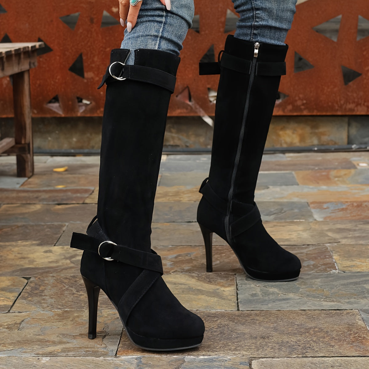 Chic Womens High Knee Boots - Fashionable Solid Hue with Smooth Zipper & Buckle Accent - Comfortable Casual High Heel Stretch Slim Design