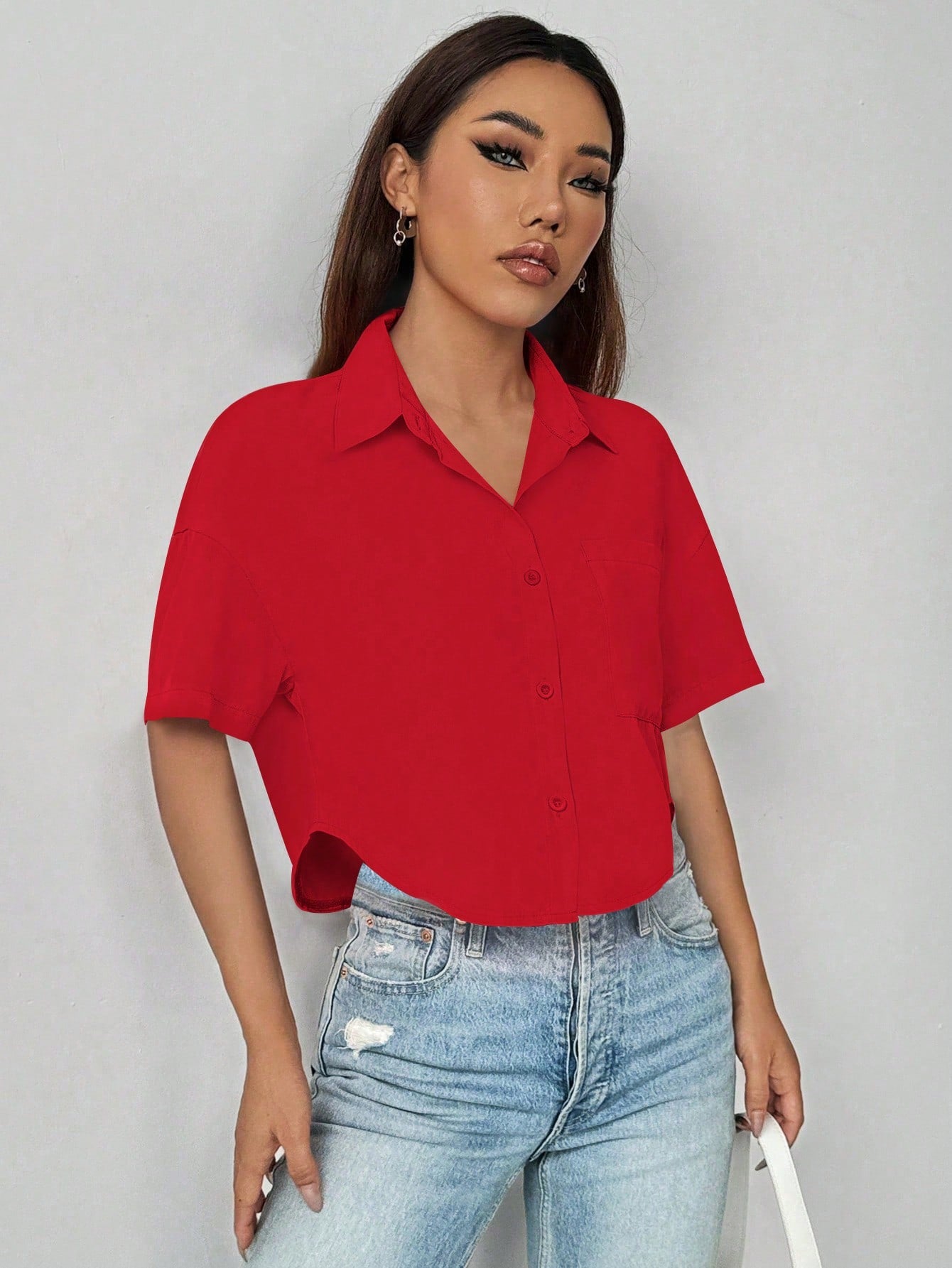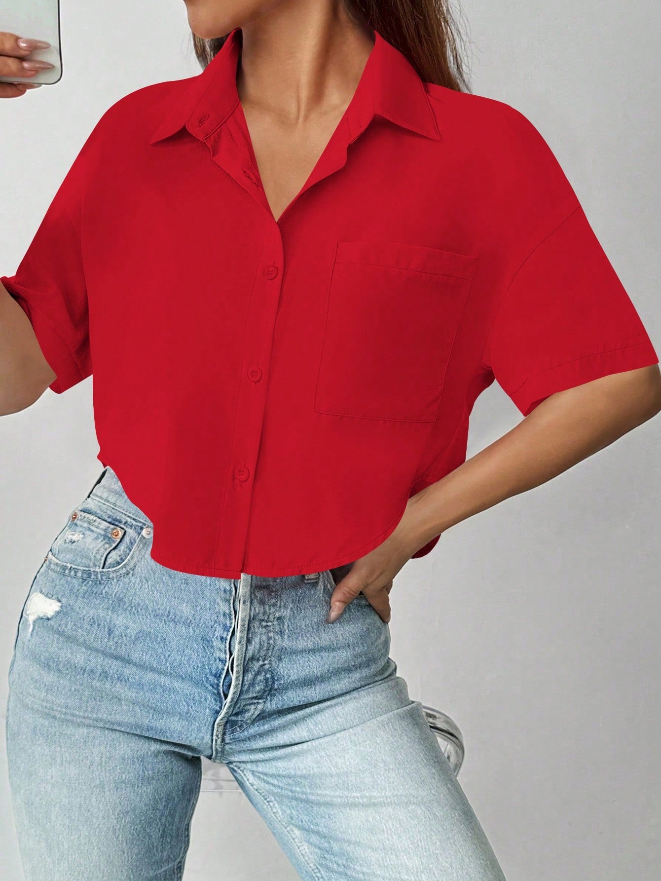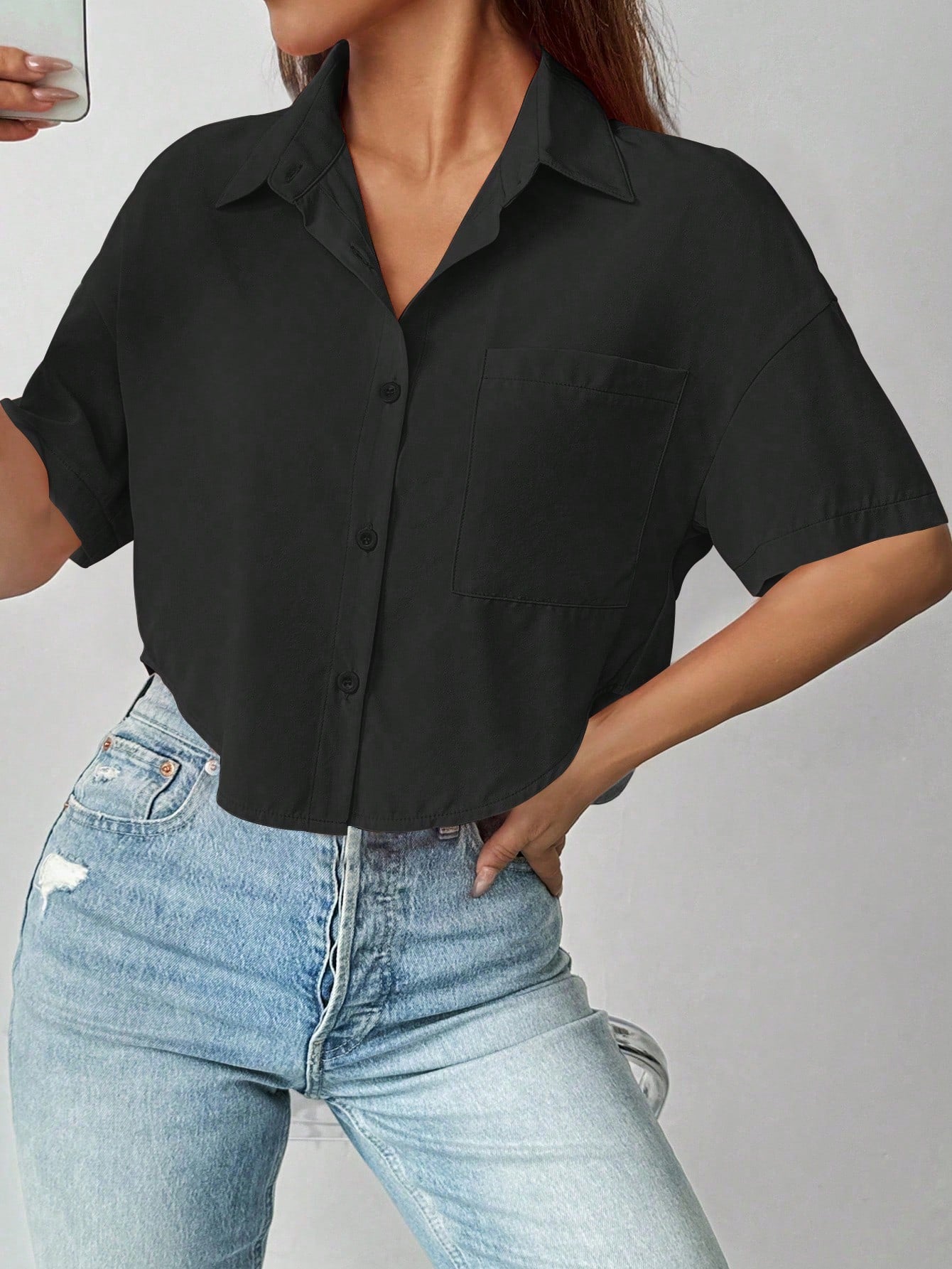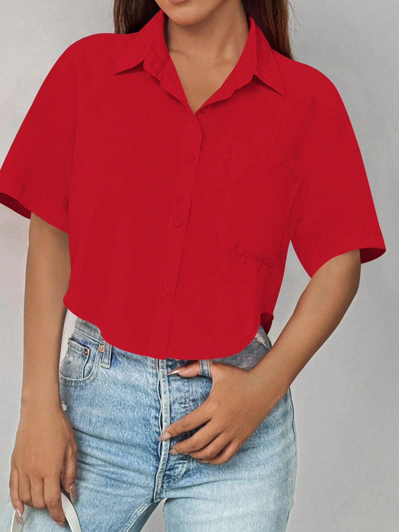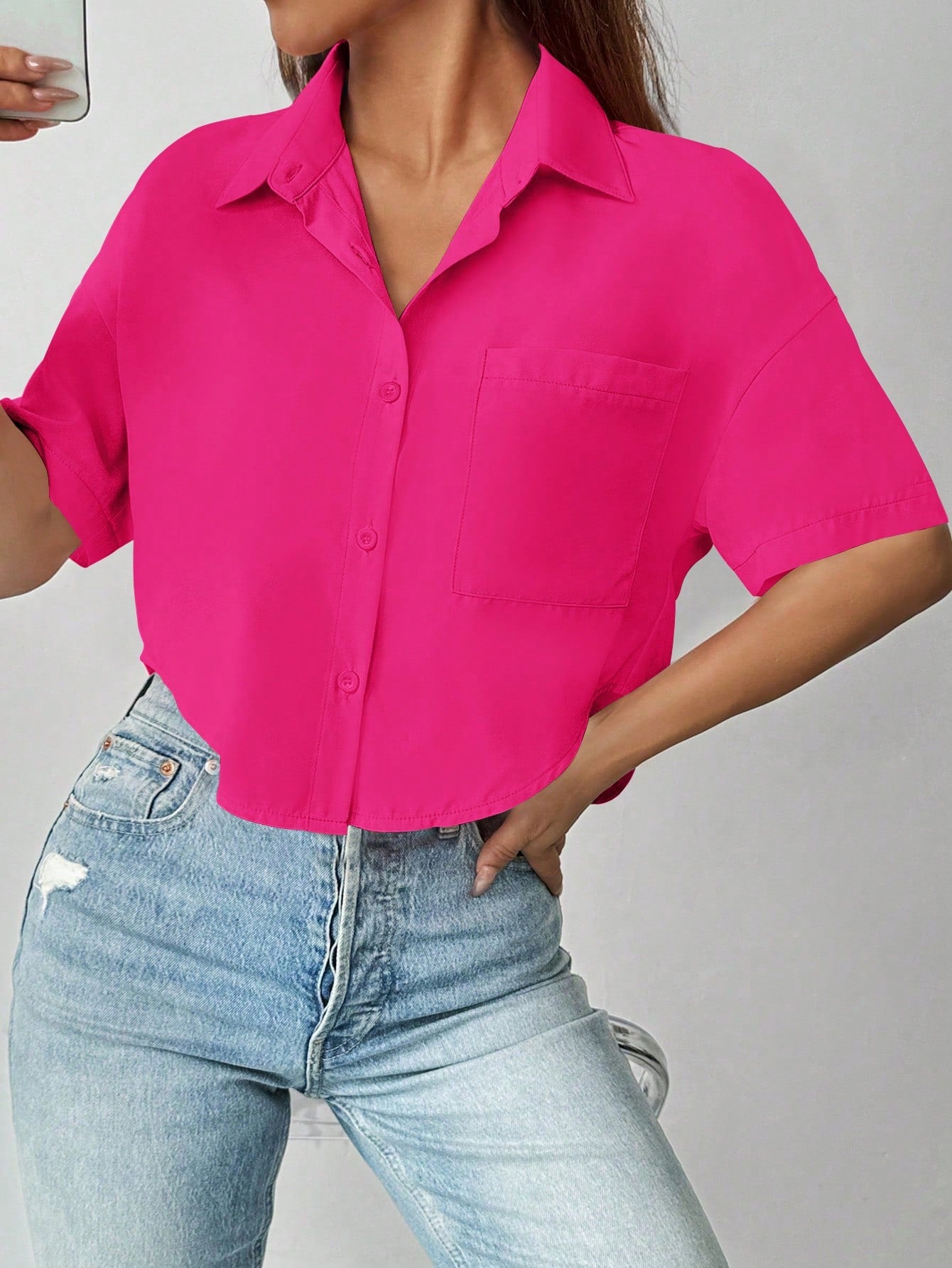 ChicEase Women's Solid Color Pocket Short Sleeve Cropped Casual Shirt, Summer For New Year Clothes,Short Sleeve Tops