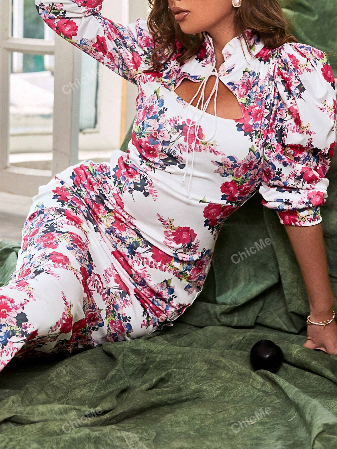 ChicMe Bubble Sleeve Flower Print Bodycon Dress High Neck Hollow Slim Fit Ruched Waist
