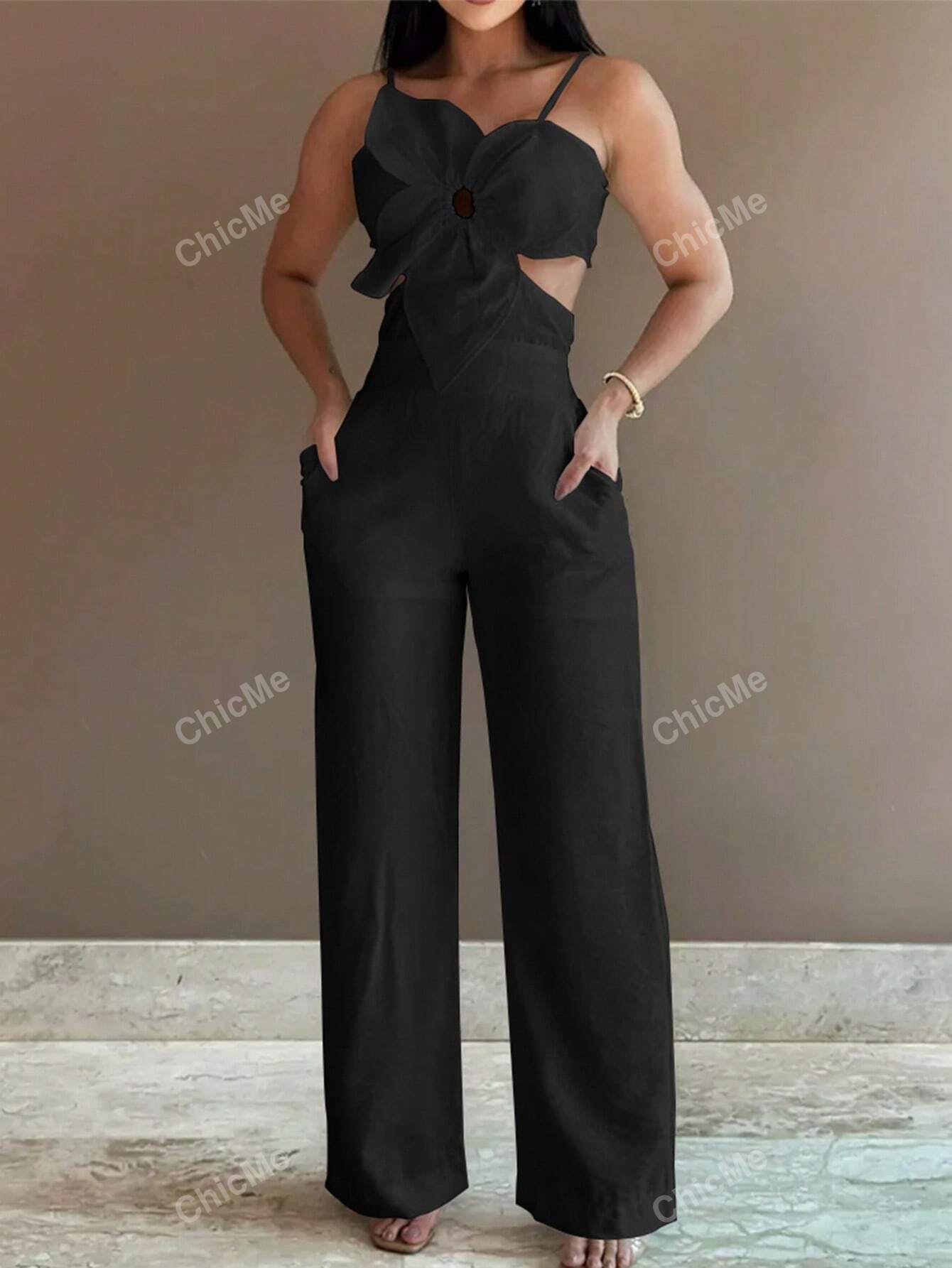 ChicMe Women Floral Pattern Jumpsuit Sleeveless Shirred Romper Casual Overall With Pockets