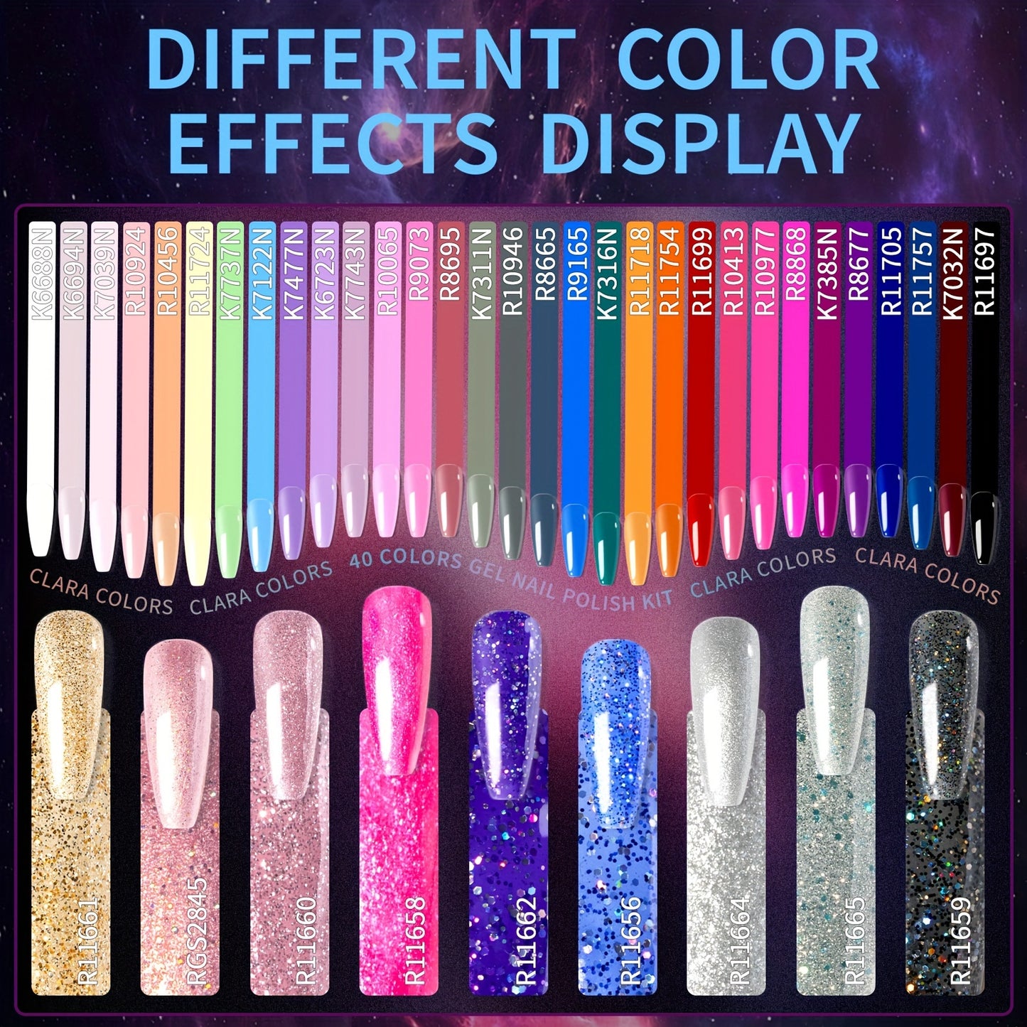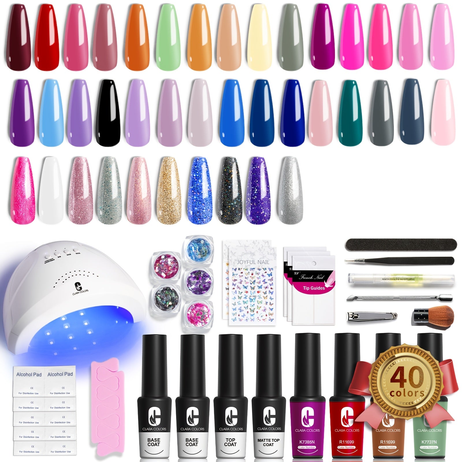 Clara Colors Gel Nail Polish, 40 Colors Purple Green Pink Blue Black UV Gel Nail Polish Set And Base Top Coat With UV Light Set Kit, Soak Off Gel Polish Nail Art For Women