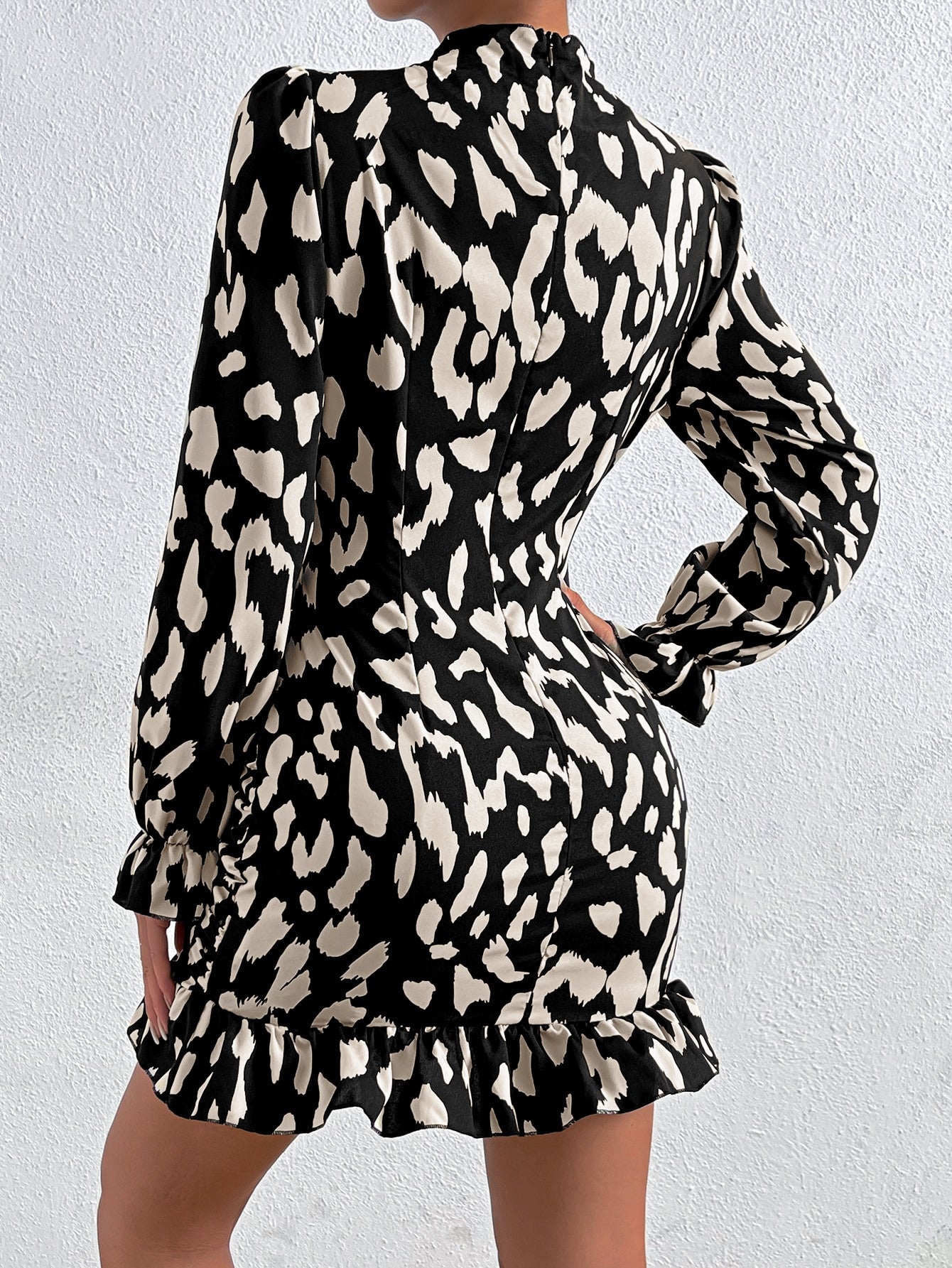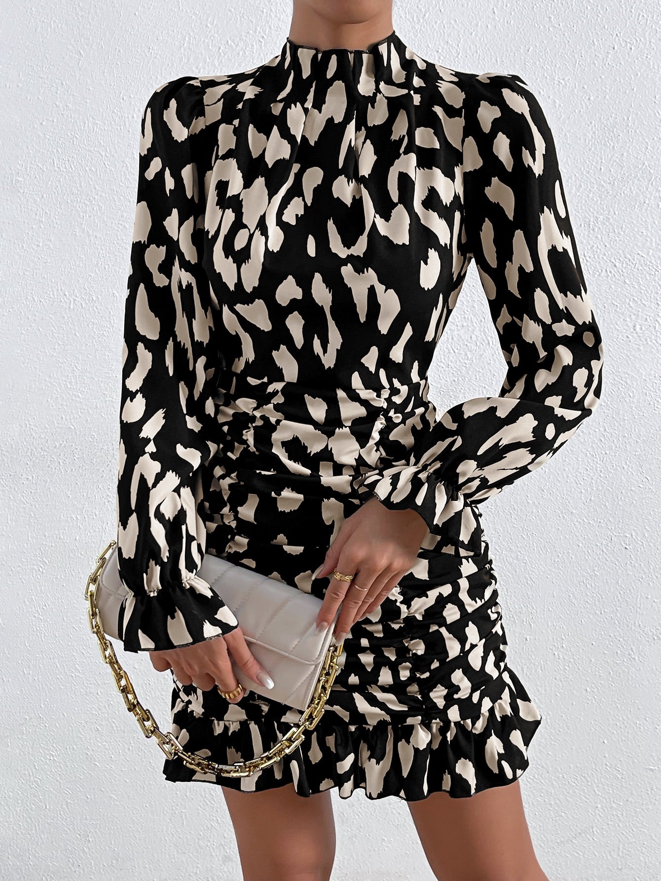 Clasi Allover Print Mock Neck Flounce Sleeve Ruched Ruffle Hem Dress