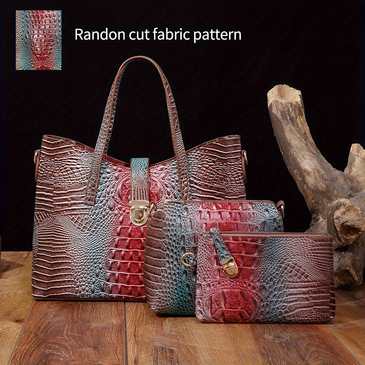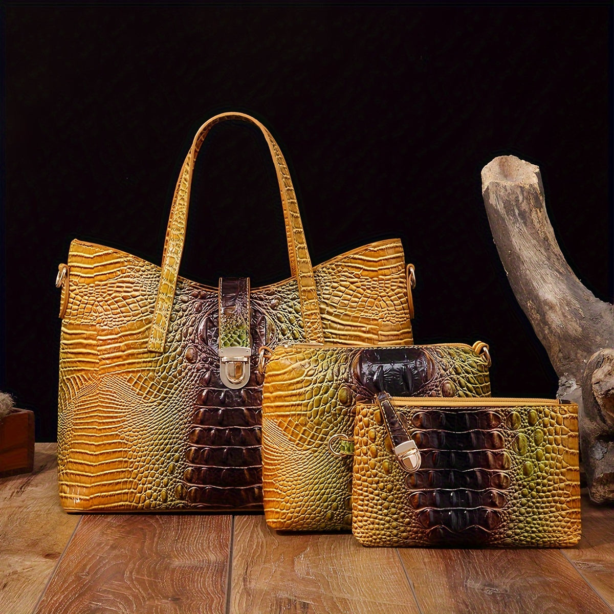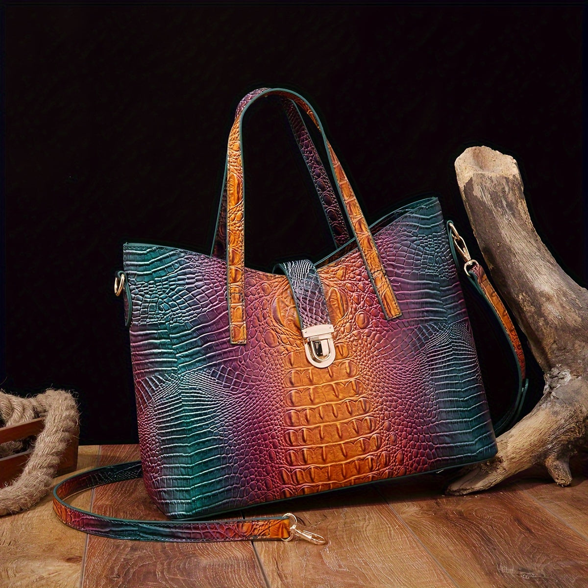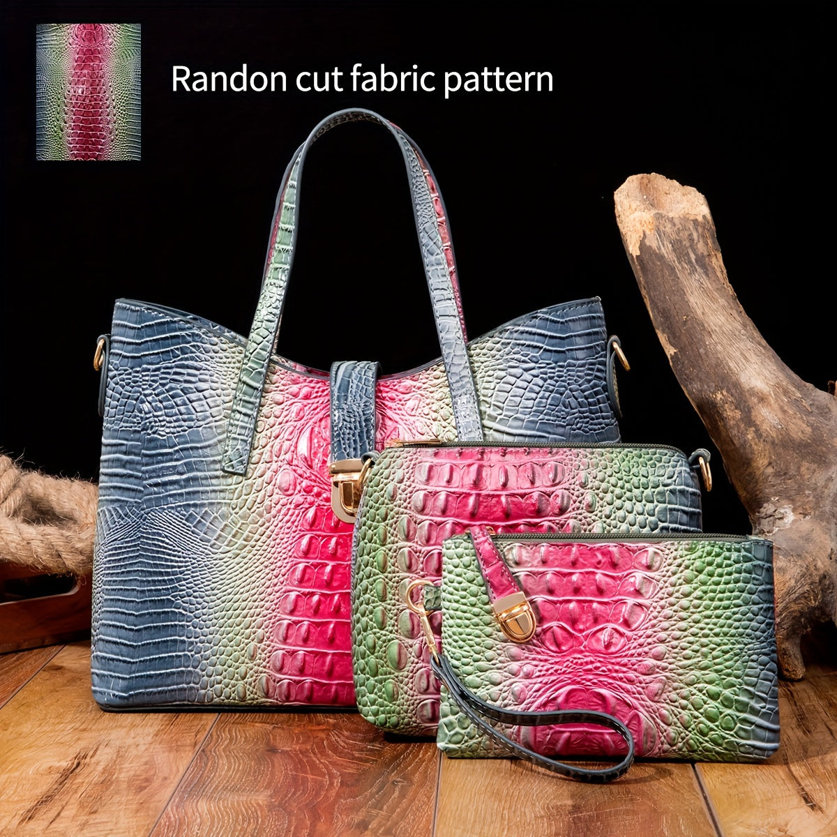 Colorful crocodile pattern three piece set with large capacity tote bag, crossbody bag, handbag