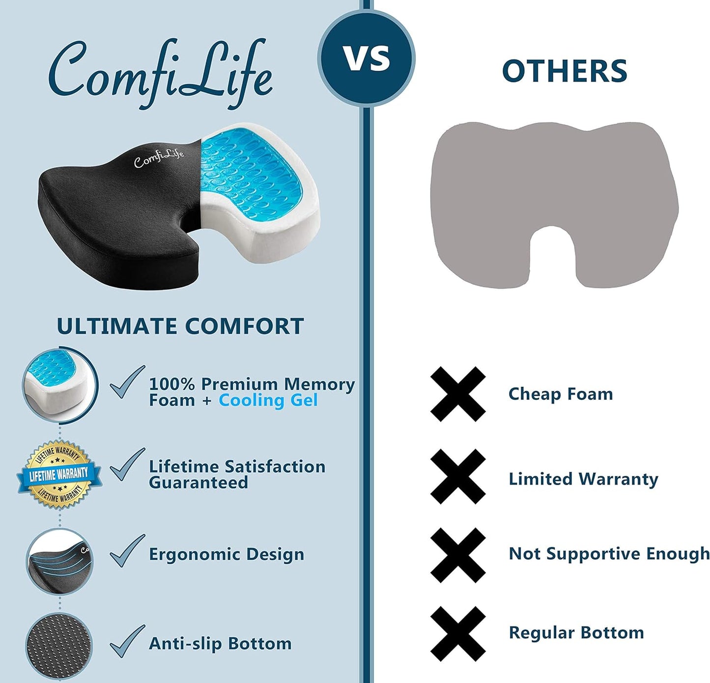 Our Customers Love ComfiLife Cushion - "I have already recommended this to all my office mates that sit all day, as well. I love it, and some advice...Lock it up after you use it, or I guarantee one of your sneaky cube mates will swipe it!" "This has saved my life as one with lower back pain due to pinched nerve roots" "I have herniated discs and sciatica for many years, this cushion allowed me to drive cross state with little to no pain"