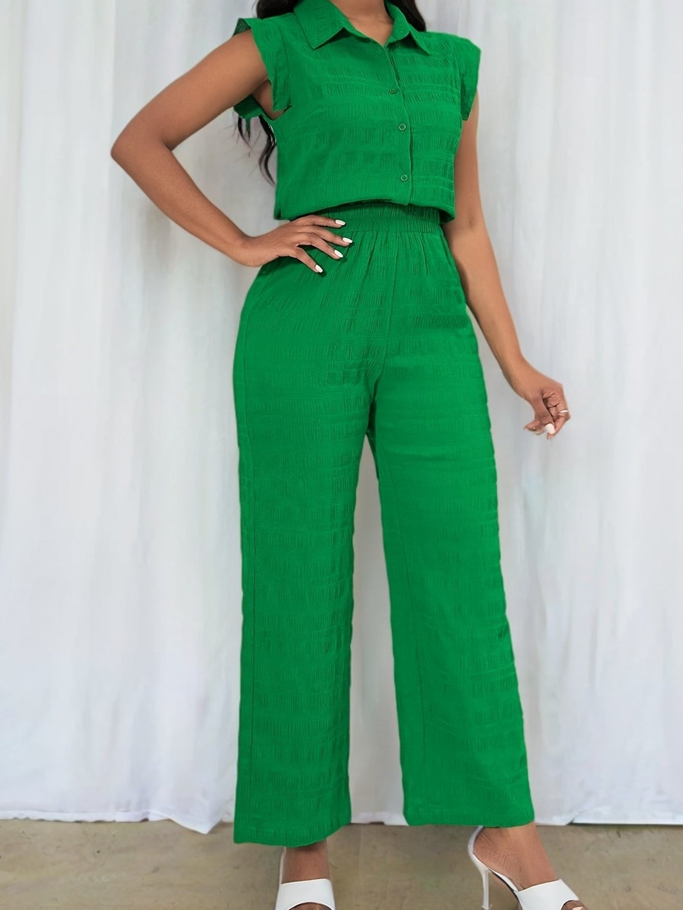 Comfortable Solid Color Casual Set, Button Cap Sleeve Top & Straight Leg Pants, Women's Clothing