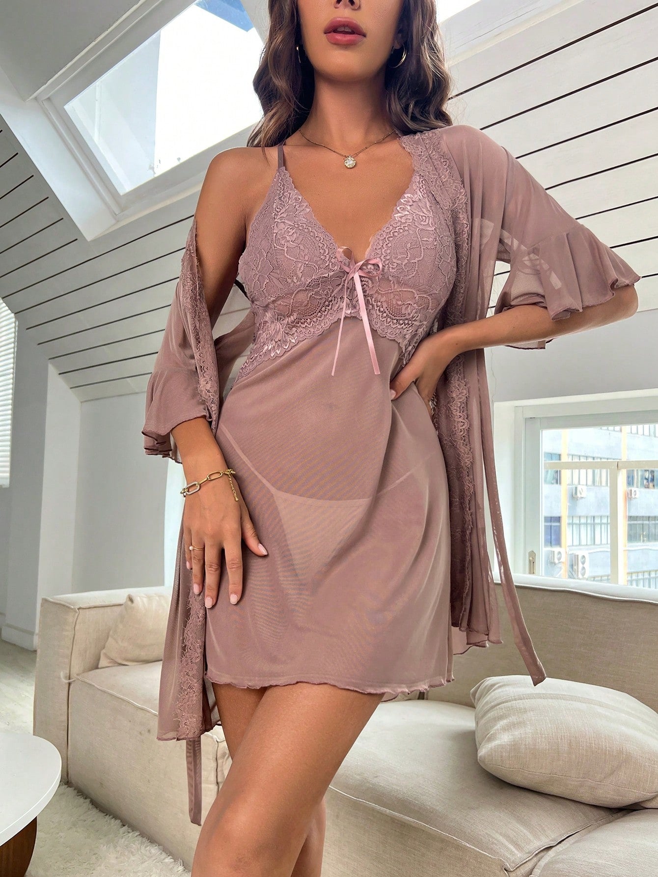 Contrast Lace Flounce Sleeve Bow Front Robe & Cami Dress PJ Set / Pajama Set