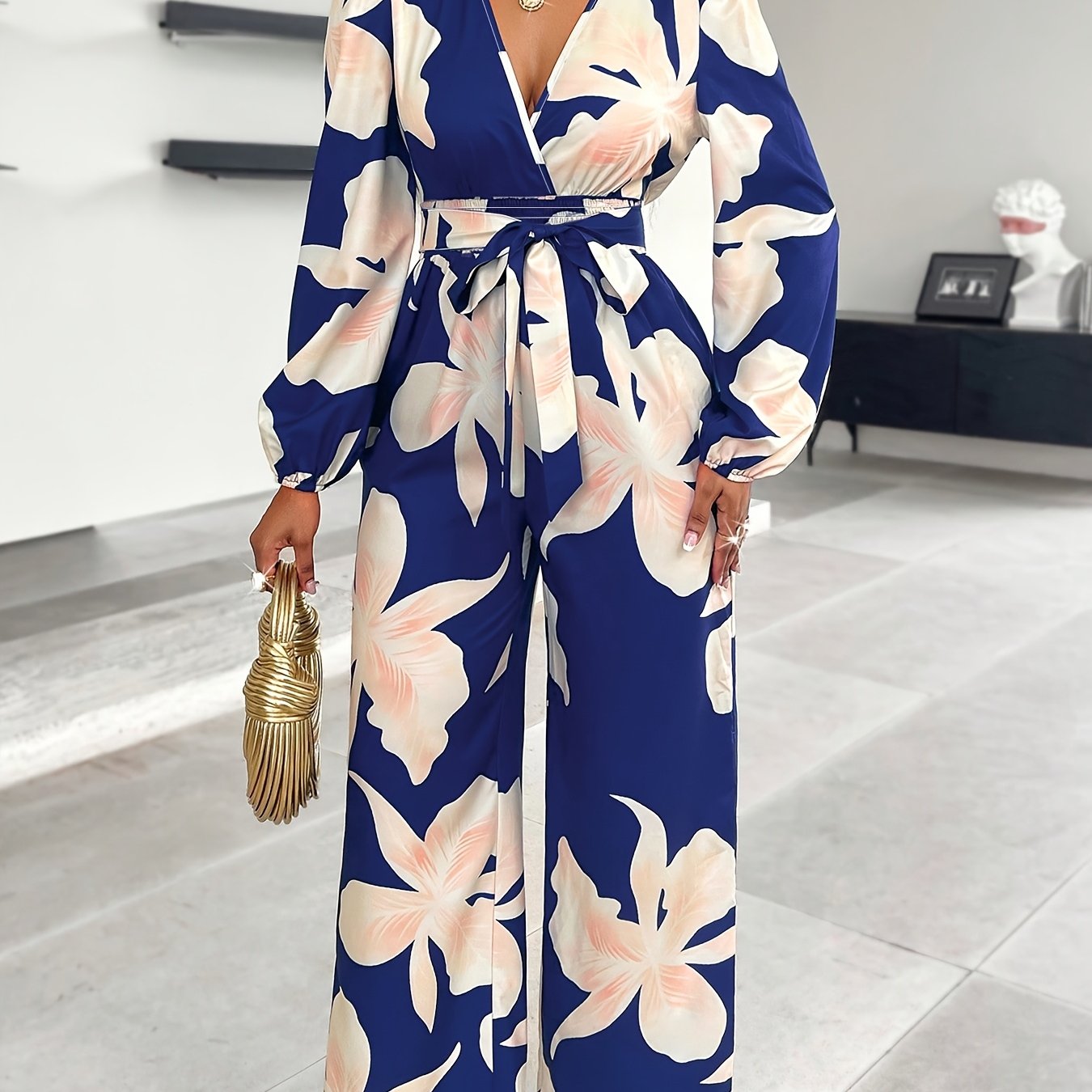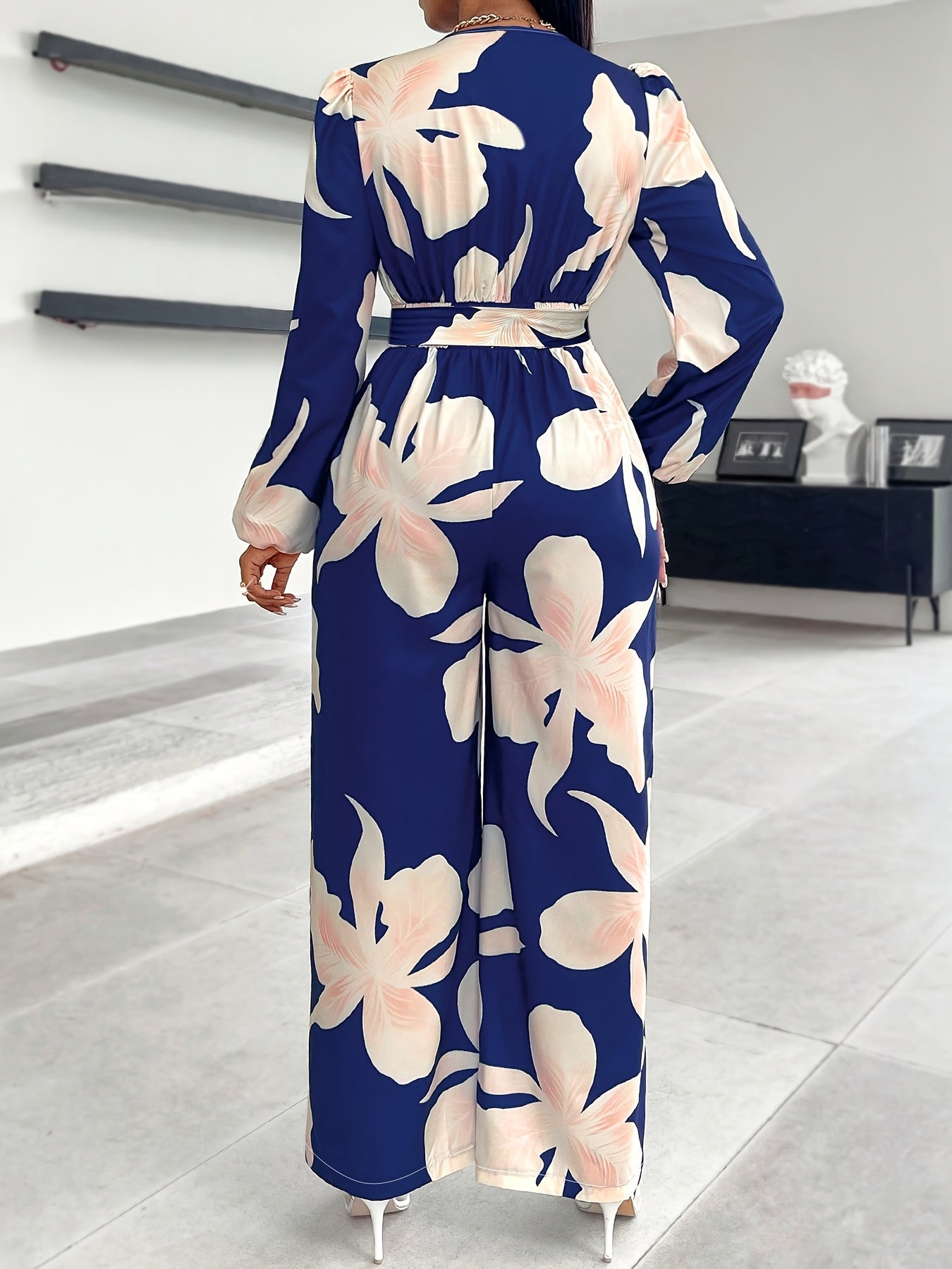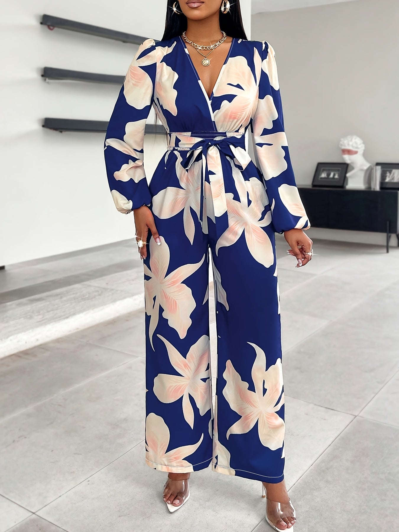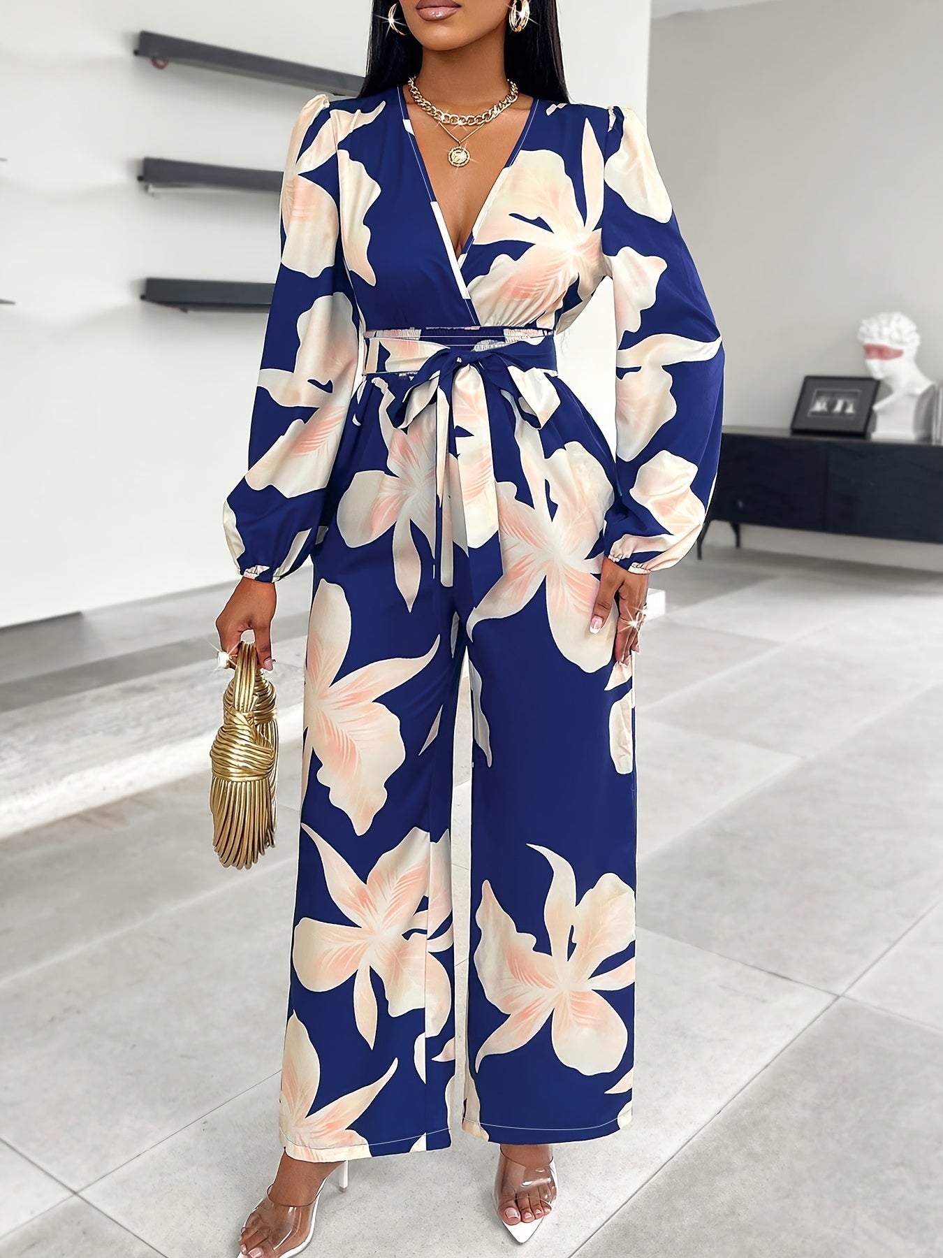 [Criss Cross Neck Print Jumpsuit] Long Sleeve Criss Cross Neck Print Jumpsuit for Women - Polyester 95% Spandex 5%, Shirred Detail, Extra-Long Length, Regular Fit with Belt, All Seasons - ZD207