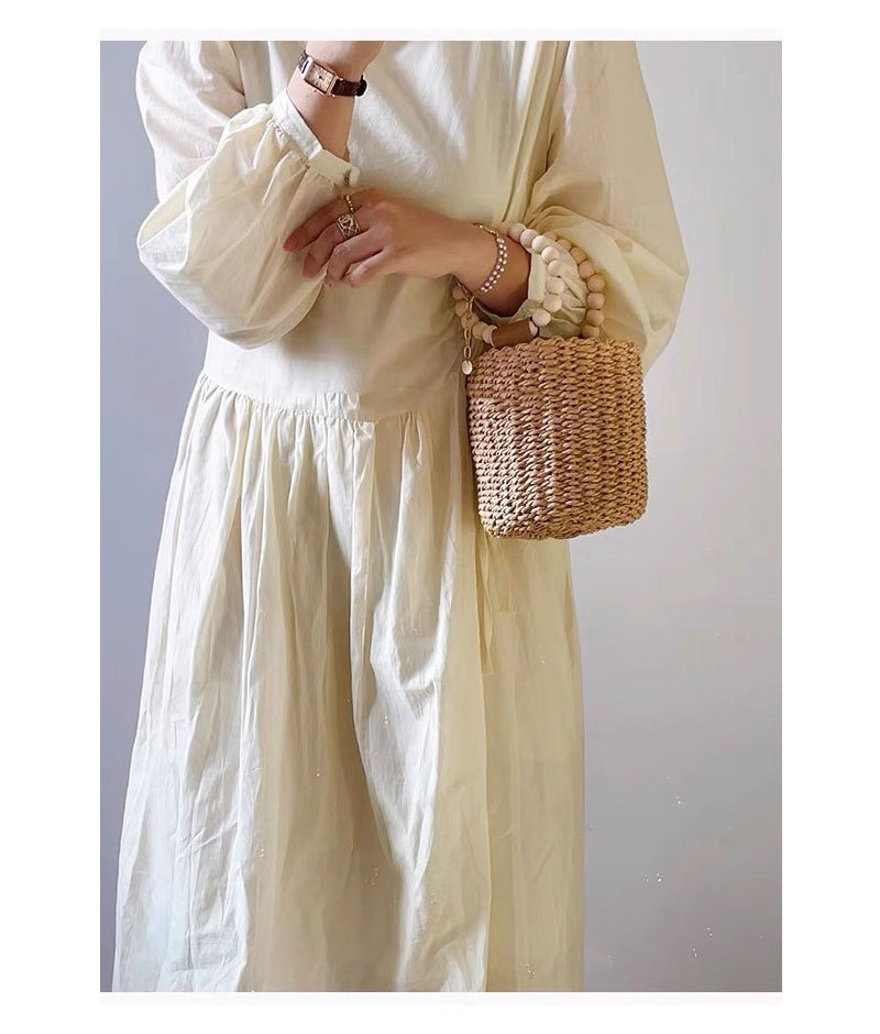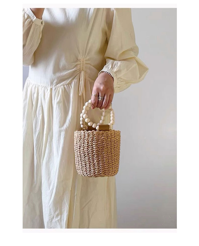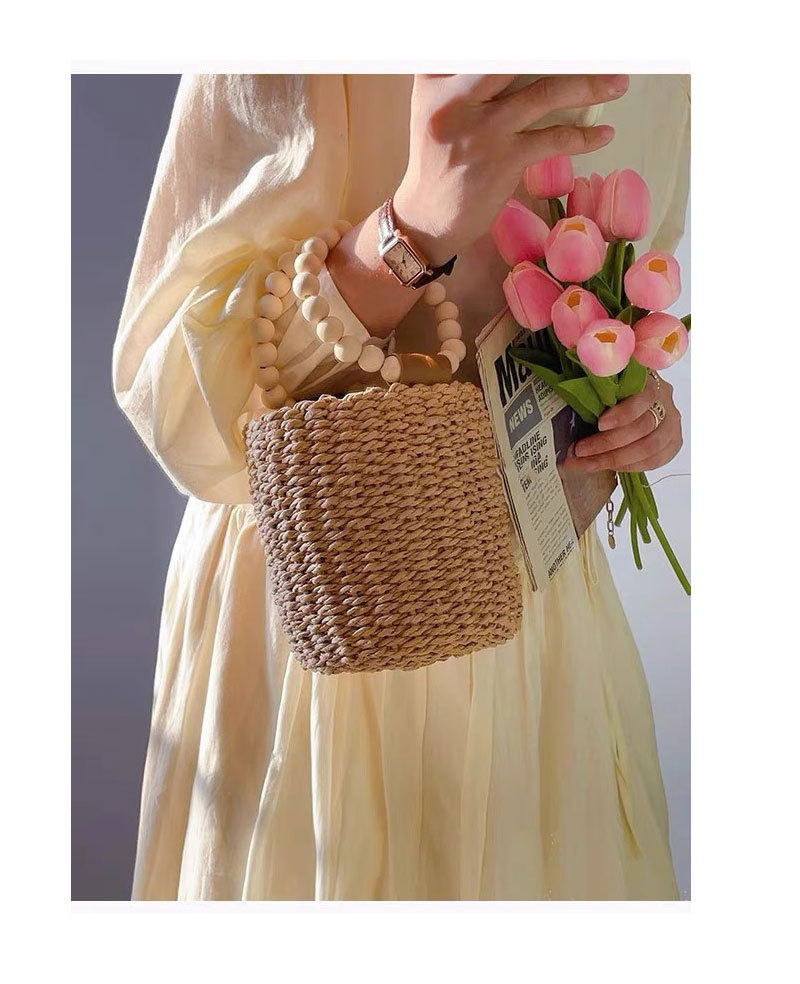 Cute Beaded Portable Straw Weaved Bag Bucket Hand Carrying Straw Bag Woven Bag Vacation Beach Bag Women