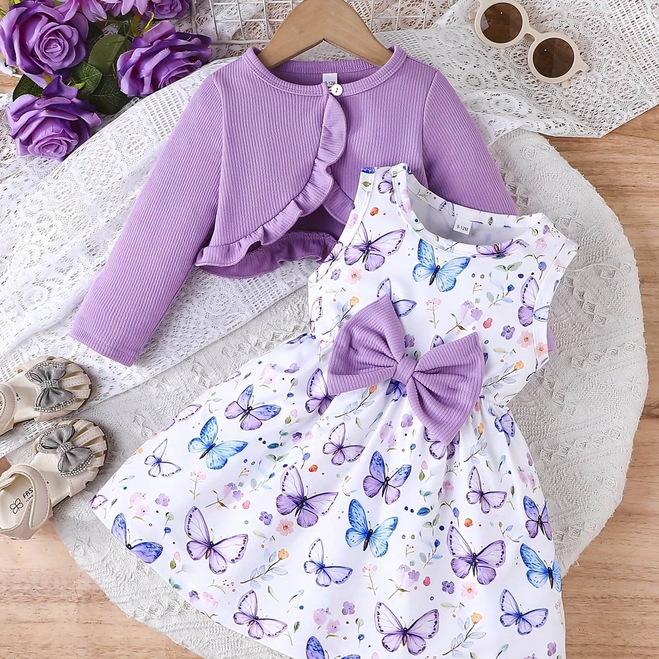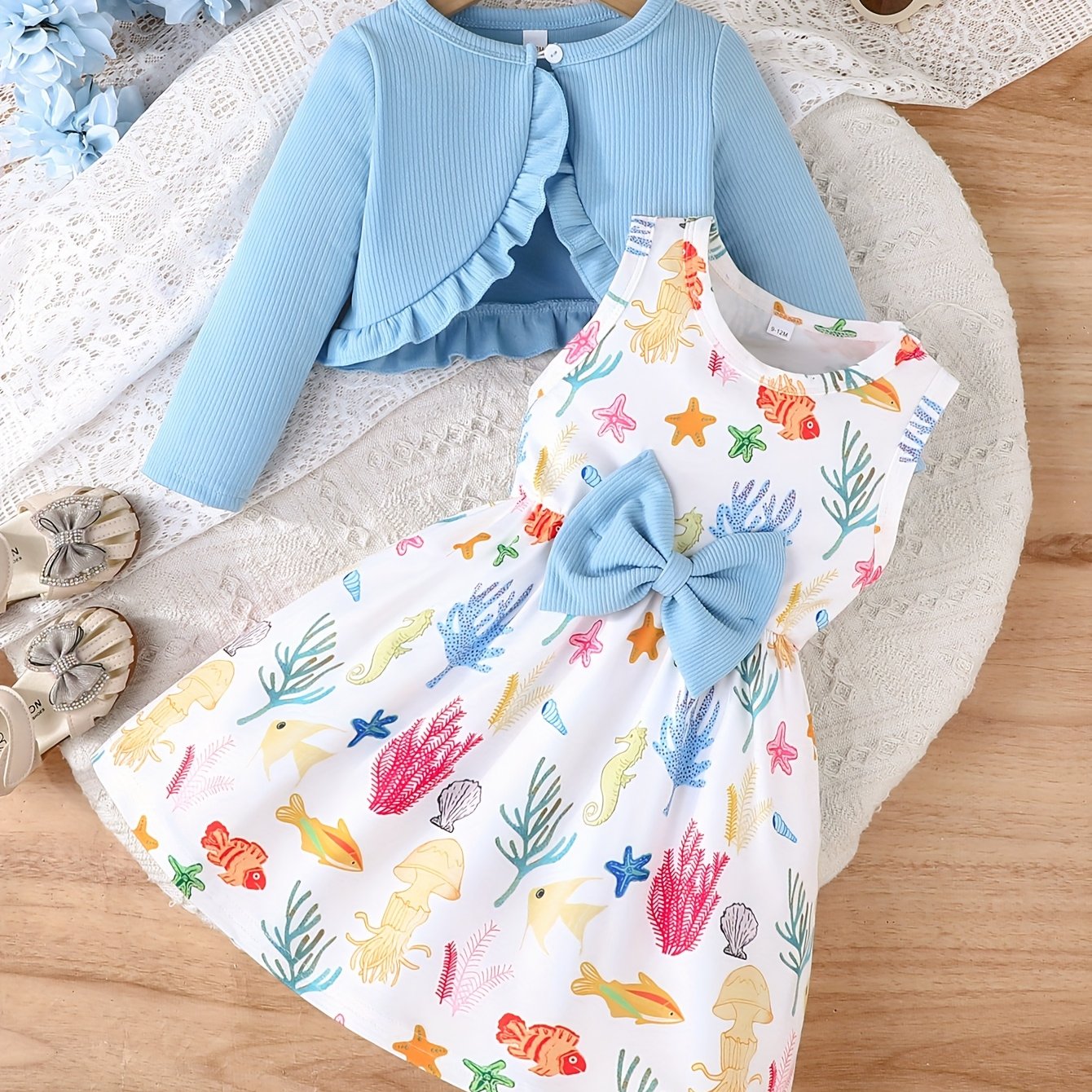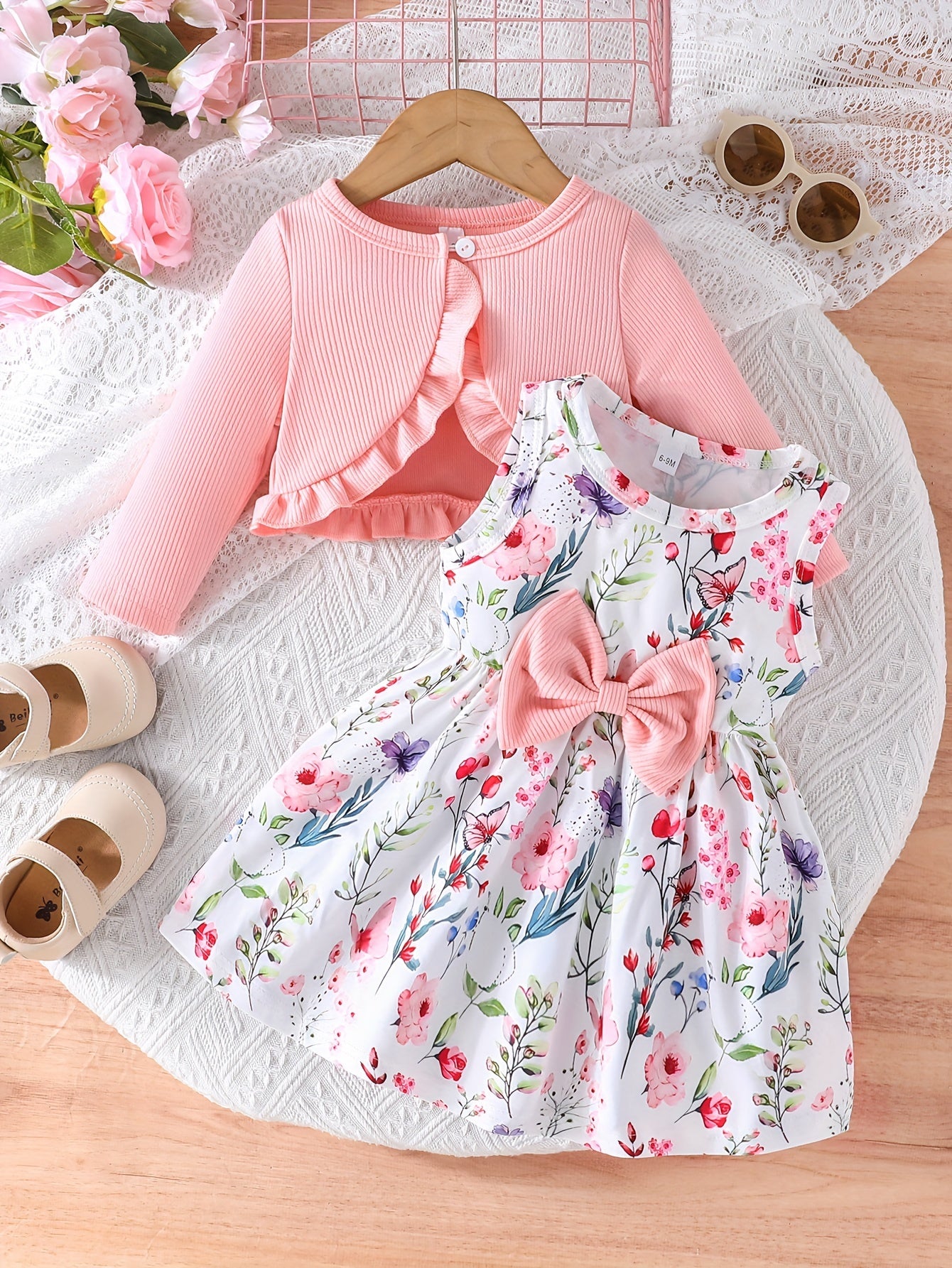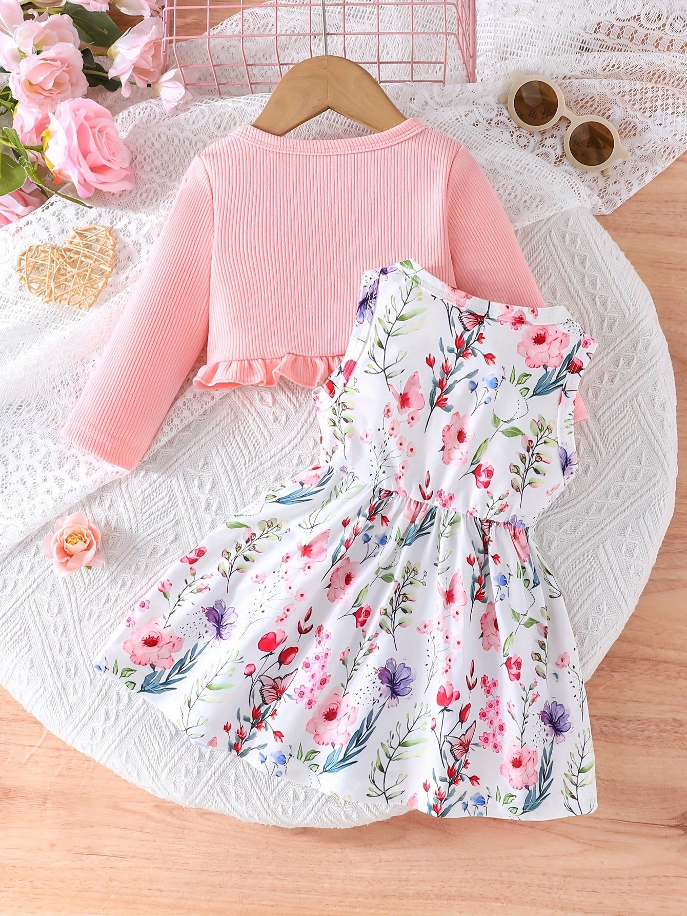 Cute Two-Piece Spring/Fall Outfit: Long Sleeve Crew Neck Top with Ruffled Edges and Floral Print Dress with Bow Detail, for Outdoor
