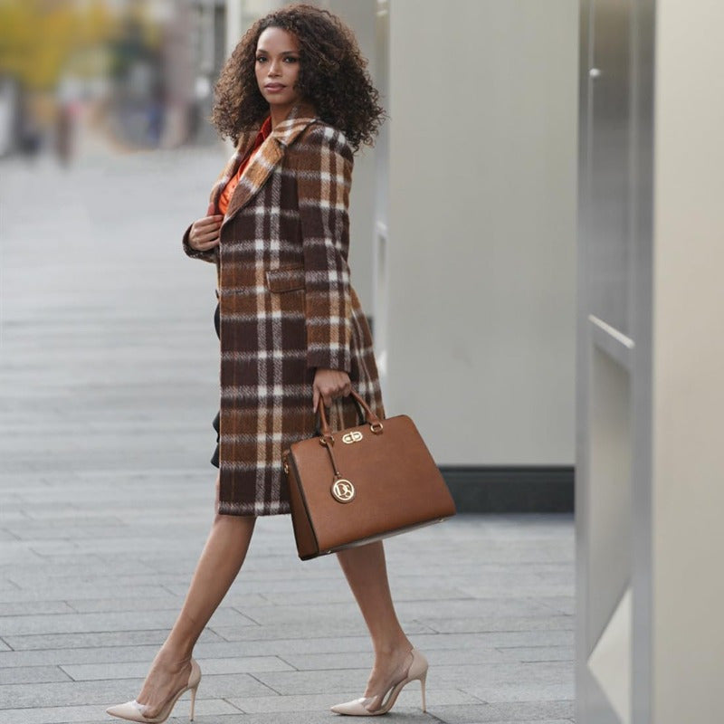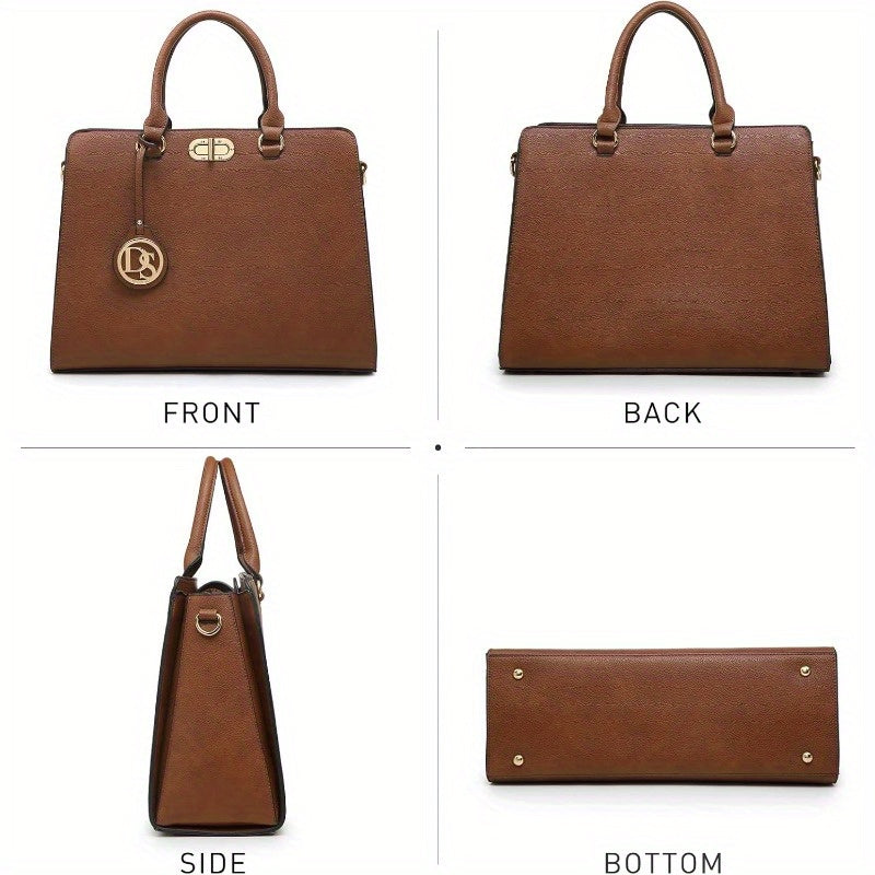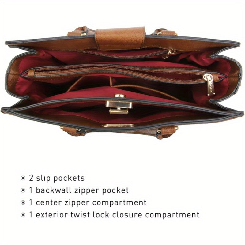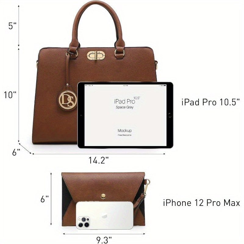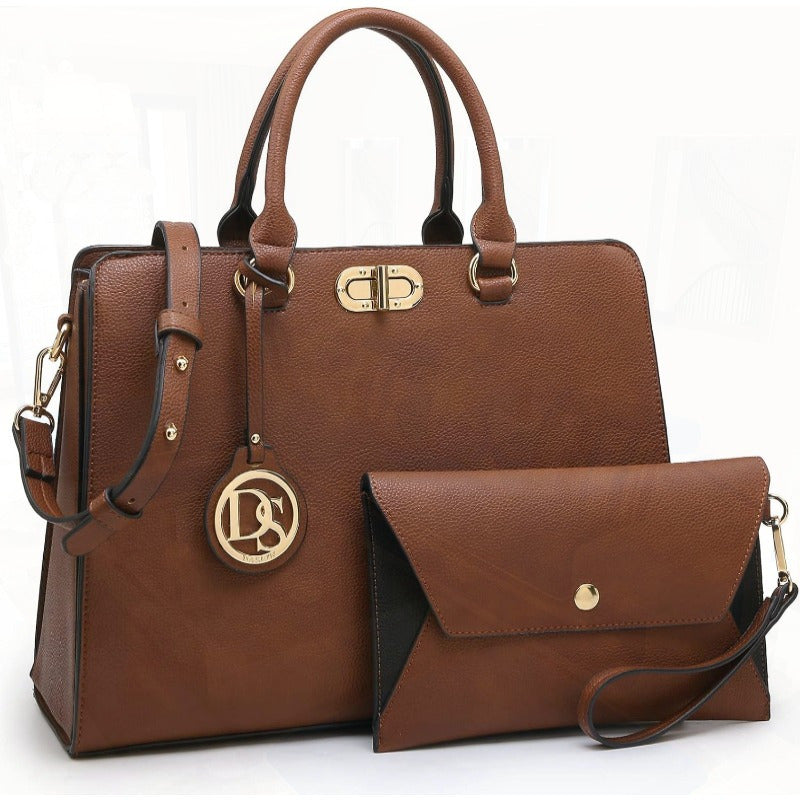 Dasein Women's Vegan Work Satchel Tote Bag with Matching Clutch - Adjustable & Removable Shoulder Strap, Multiple Compartments, Golden-Tone Hardware, 14.2"W x 10"H, Brown & Black for Professional & Casual Use, Travel Accessory, Elegant Handbag, Sturdy Han